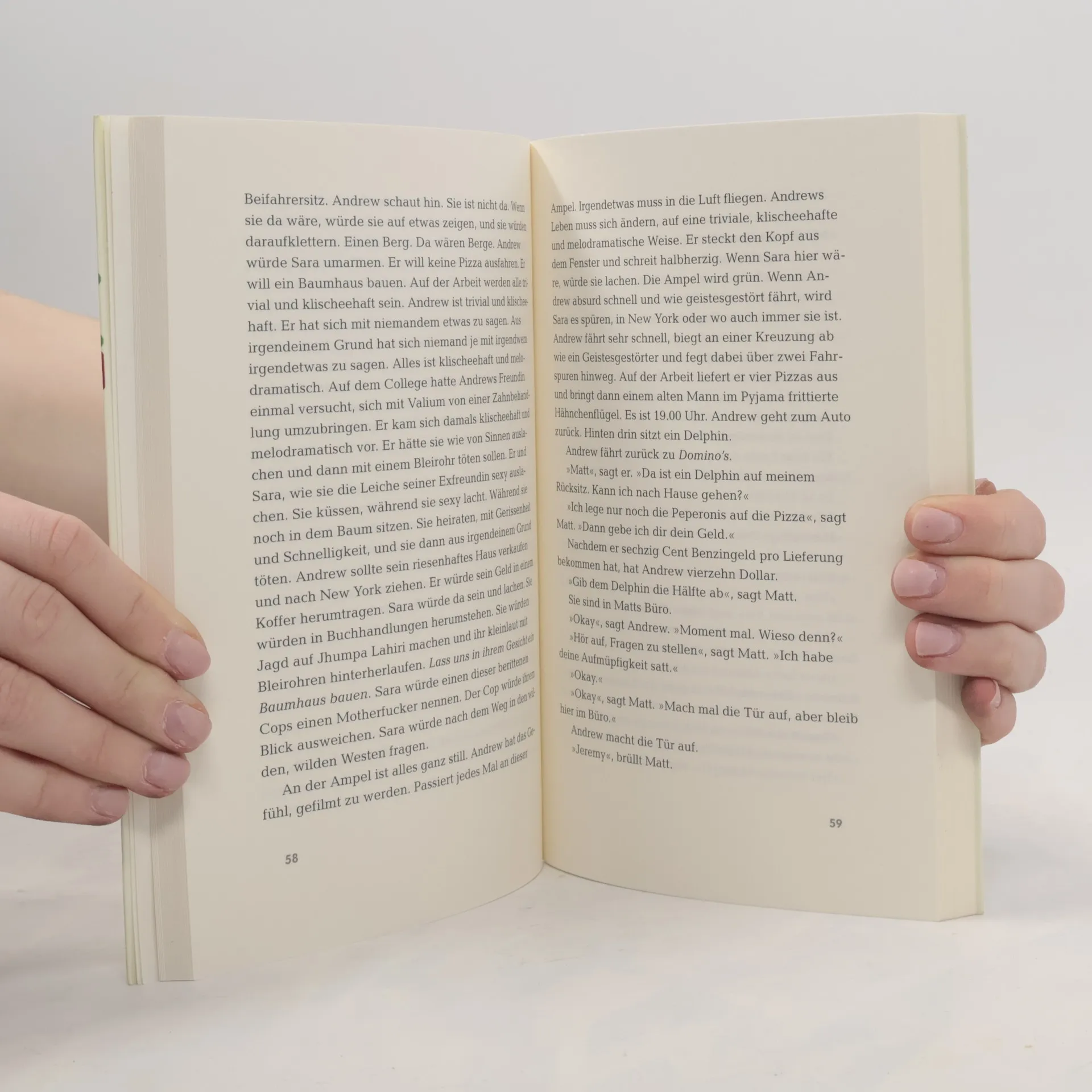 Andrew ist Pizzabote bei Domino’s Pizza, aber das ist er nicht gerne. Andrew lebt in Orlando, Florida, aber dort lebt er nicht gerne. Andrew träumt von Sara, einem Mädchen, mit dem er in New York ein einziges Date hatte. Seitdem hat er sie nicht wiedergesehen. Trotzdem ist Sara wohl die wichtigste Person in seinem Leben. Außer Steve vielleicht, seinem besten Freund, dessen Mutter bei einem Flugzeugabsturz ums Leben kam. Und dann sind da noch die Tiere, die Delfine, Bären, Hamster und Elche. Verwirrte intelligente Tiere, die versuchen, sich mit verwirrten intelligenten Menschen wie Andrew zu verständigen.