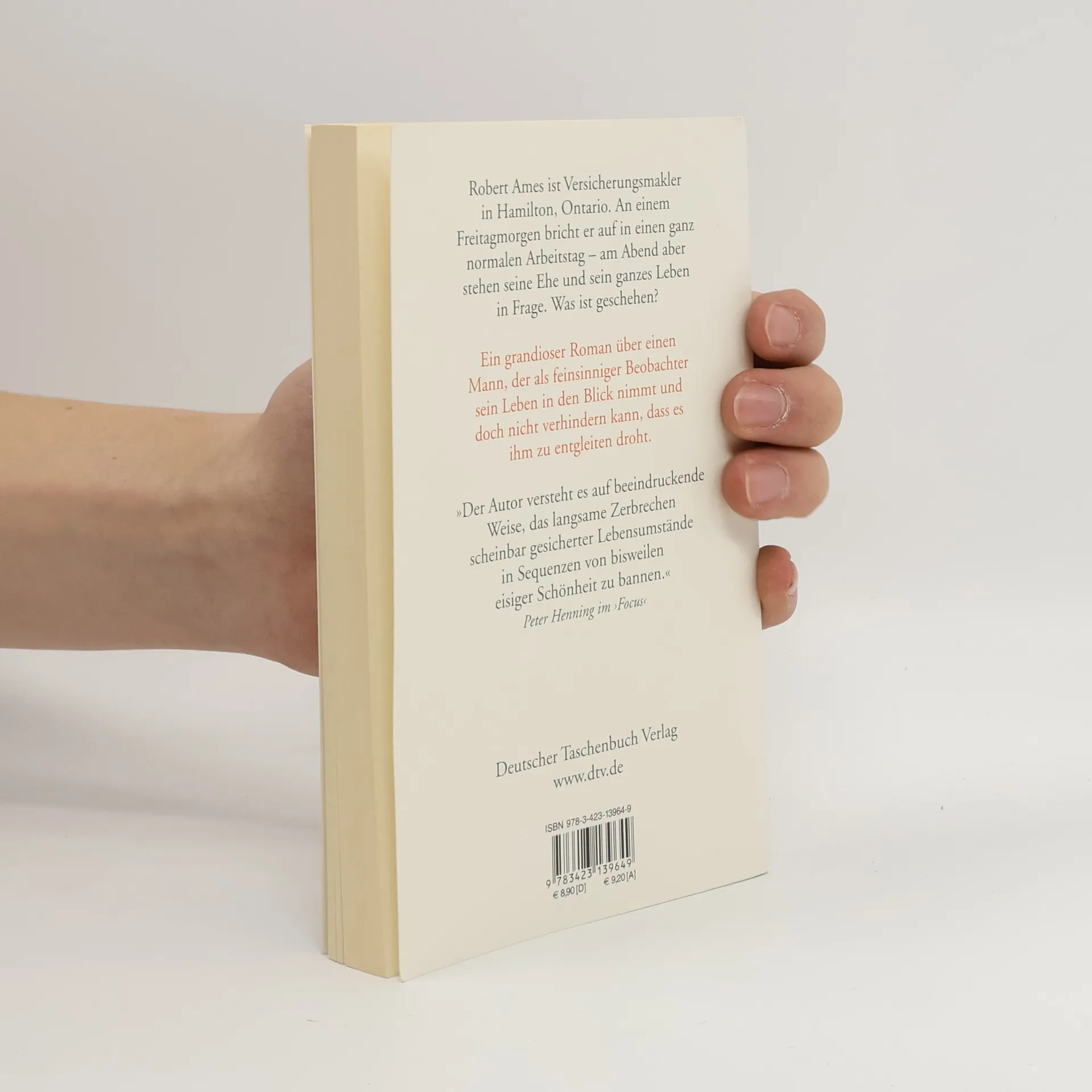 »Das soll dem Autor erst einmal einer nachmachen.« Lothar Müller, Süddeutsche Zeitung Robert Ames ist siebenunddreißig und Versicherungsmakler. Er lebt mit seiner Frau Kala und seinem Sohn Jonathan in einem kleinen Haus in Hamilton, Ontario. An einem Freitagmorgen bricht er auf in einen ganz normalen Arbeitstag – und doch wird alles anders sein als sonst. Am Abend steht plötzlich seine Ehe auf dem Spiel und Robert muss sich fragen, wo im Leben er eigentlich steht. Souverän zeichnet Stefan Mühldorfer das Porträt eines Mannes, der als feinsinniger Beobachter sein Leben in den Blick nimmt und doch nicht verhindern kann, dass es ihm zu entgleiten droht.