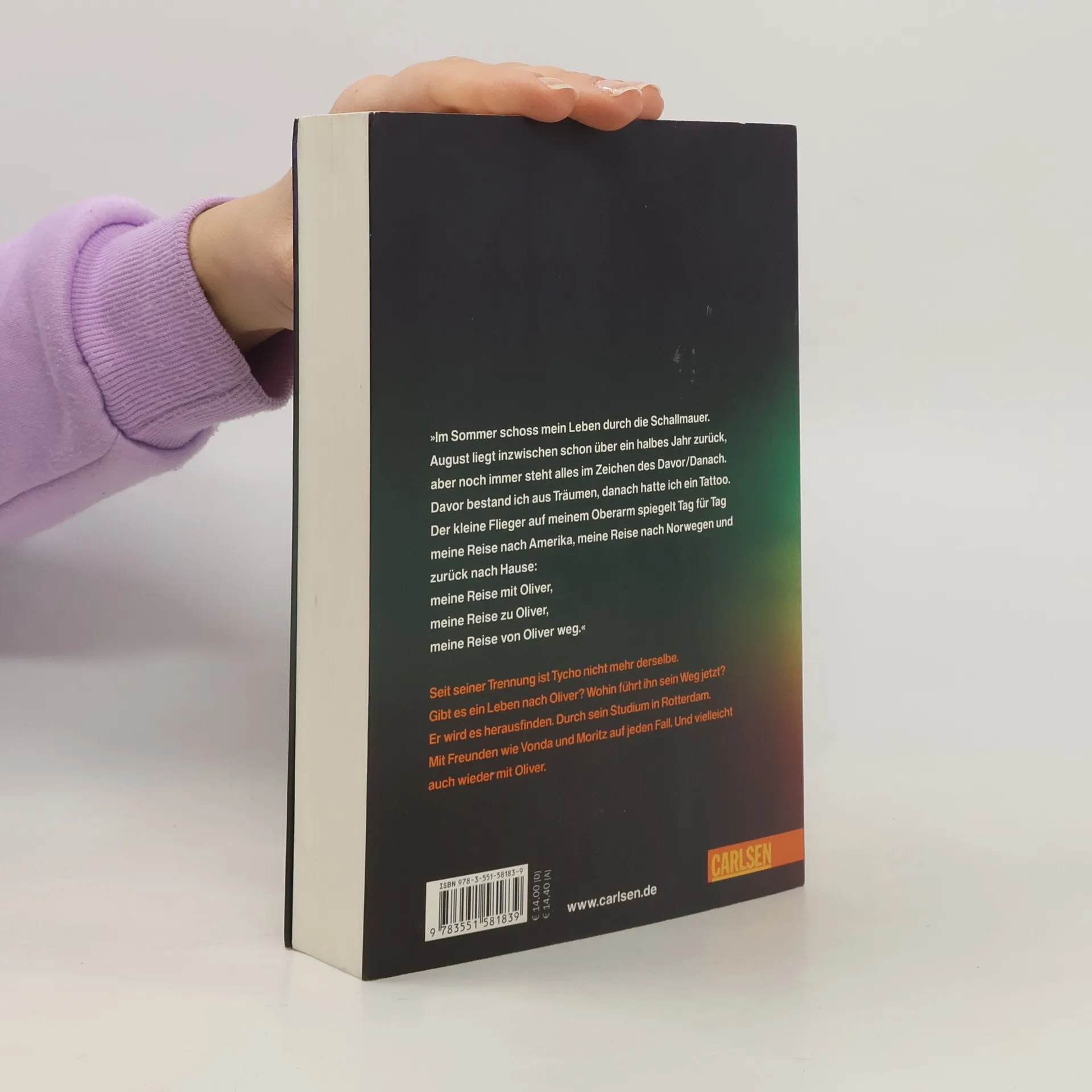 „Im Sommer schoss mein Leben durch die Schallmauer. August liegt inzwischen schon über ein halbes Jahr zurück, aber noch immer steht alles im Zeichen des Davor/Danach. Davor bestand ich aus Träumen, danach hatte ich ein Tattoo. Der kleine Flieger auf meinem Oberarm spiegelt Tag für Tag meine Reise nach Amerika, meine Reise nach Norwegen und zurück nach Hause: meine Reise mit Oliver, meine Reise zu Oliver, meine Reise von Oliver weg.“ Seit seiner Trennung ist Tycho nicht mehr derselbe. Gibt es ein Leben nach Oliver? Wohin führt ihn sein Weg jetzt? Er wird es herausfinden. Durch sein Studium in Rotterdam. Mit Freunden wie Vonda und Moritz auf jeden Fall. Und vielleicht auch wieder mit Oliver.