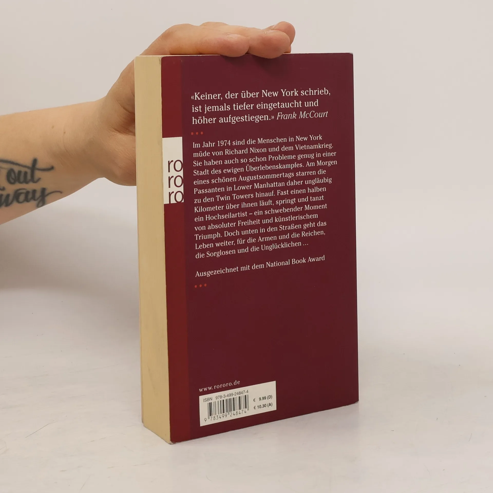 «Keiner, der über New York schrieb, ist jemals tiefer eingetaucht und höher aufgestiegen.» Frank McCourt Im Jahr 1974 sind die Menschen in New York müde von Richard Nixon und dem Vietnamkrieg. Sie haben auch so schon Probleme genug in einer Stadt des ewigen Überlebenskampfes. Am Morgen eines schönen Augustsommertags starren die Passanten in Lower Manhattan daher ungläubig zu den Twin Towers hinauf. Fast einen halben Kilometer über ihnen läuft, springt und tanzt ein Hochseilartist – ein schwebender Moment von absoluter Freiheit und künstlerischem Triumph. Doch unten in den Straßen geht das Leben weiter, für die Armen und die Reichen, die Sorglosen und die Unglücklichen Ausgezeichnet mit dem National Book Award