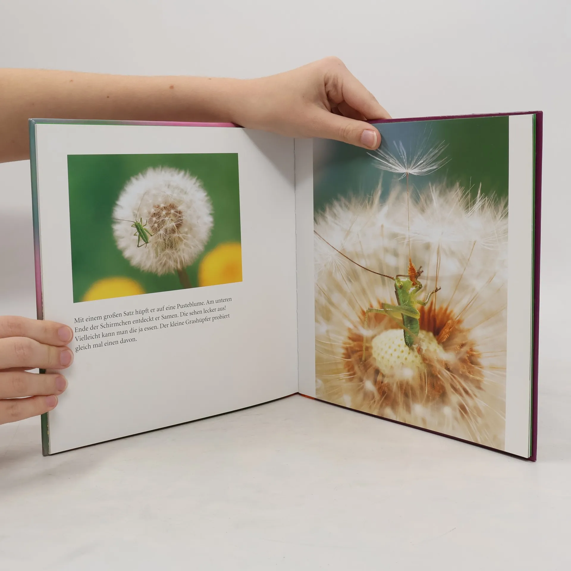 Der kleine Grashüpfer staunt: Die ganze Wiese ist voller leuchtender gelber Blumen. Da muss er gleich probieren, ob die wohl gut schmecken. Ein paar Tage später hat sich die Wiese völlig verwandelt: Plötzlich ist da ein Meer aus flauschigen weißen Kugeln. Was für eine Überraschung, als der Wind die kleinen Schirmchen plötzlich alle davon weht! Ein neues Foto-Bilderbuch über die Lieblingsblume der Kinder mit herausragenden Naturaufnahmen.