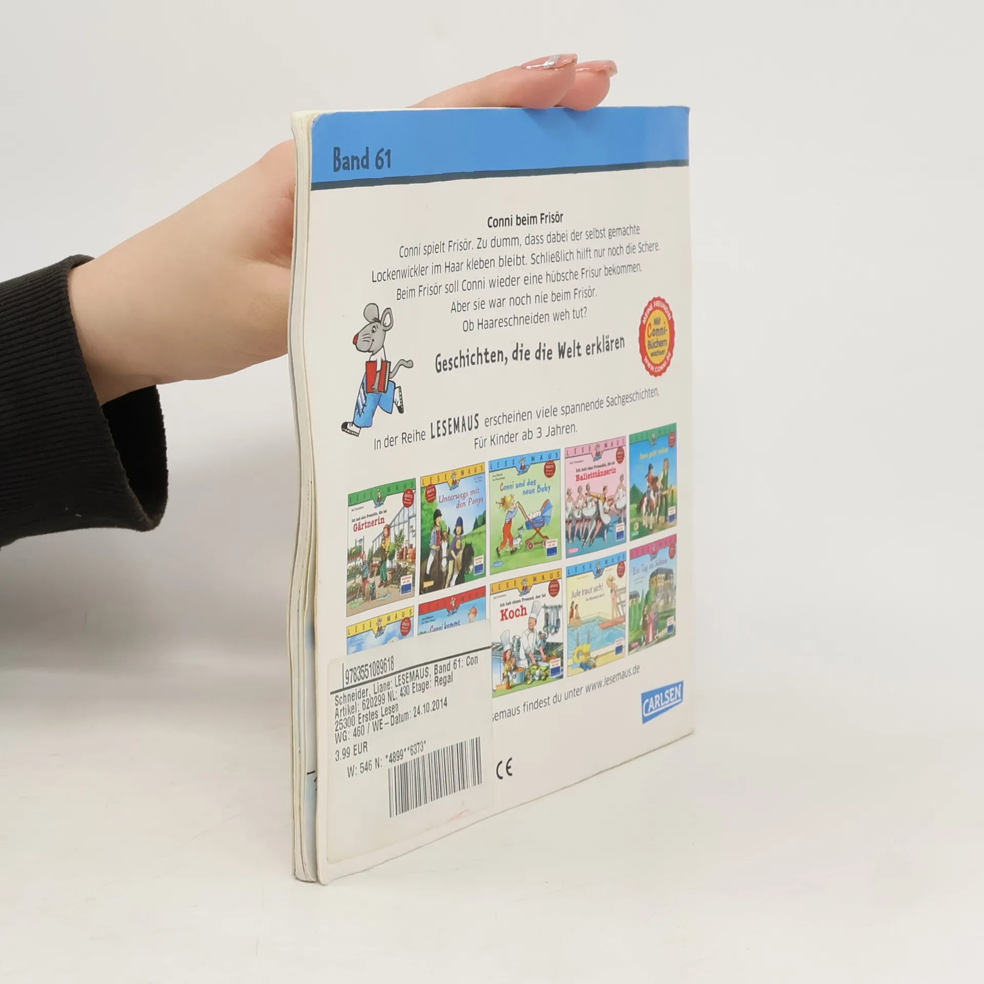 Conni spielt Frisör. Zu dumm, dass dabei der selbst gemachte Lockenwickler im Haar kleben bleibt. Schließlich hilft nur noch die Schere. Beim Frisör soll Conni wieder eine hübsche Frisur bekommen. Aber Conni war noch nie beim Frisör. Ob Haareschneiden weh tut? Und was passiert mit Connis roter Schleife?