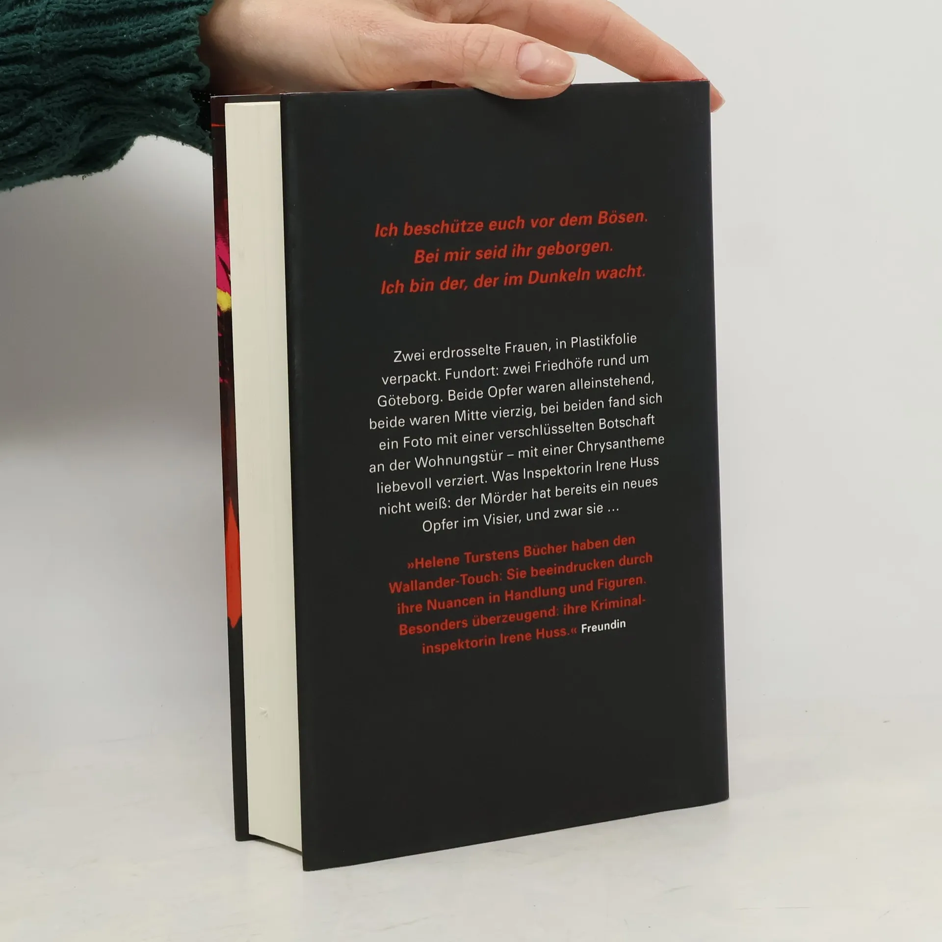 Kriminalinspektorin Irene Huss im Fadenkreuz eines Psychopathen Zwei erdrosselte Frauen, in Plastikfolien verpackt. Fundort: zwei Friedhöfe rund um Göteborg. Dem Team um Kriminalinspektorin Irene Huss ist schnell klar, dass es sich um einen Serientäter handeln muss. Beide Opfer waren alleinstehend, beide waren Mitte vierzig, bei beiden fand sich ein Foto mit einer verschlüsselten Botschaft an der Wohnungstür - mit einer Chrysantheme liebevoll verziert. Was Irene Huss nicht weiß: der Mörder hat bereits ein neues Opfer im Visier, und zwar sie.
