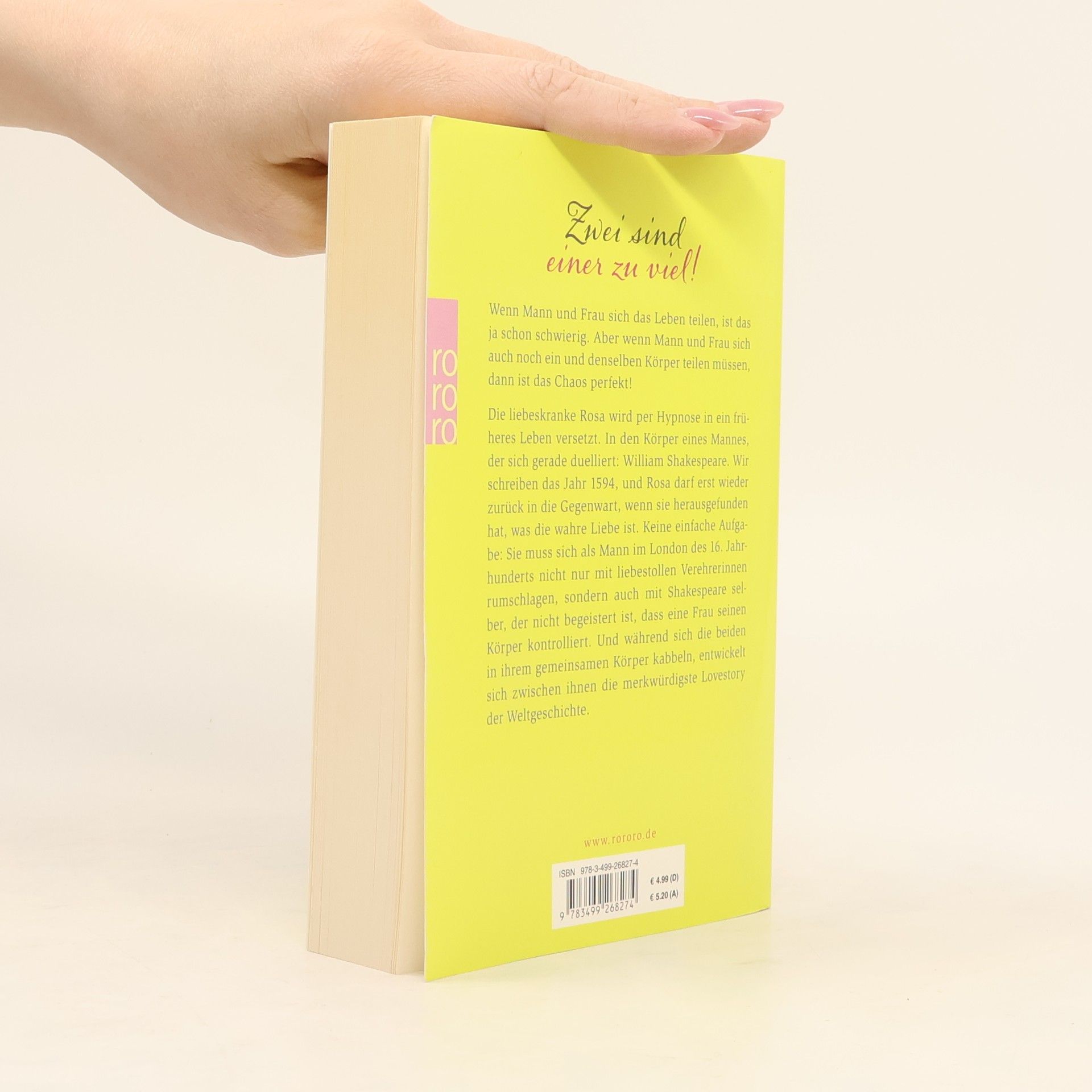 ZWEI SIND EINER ZU VIEL! Wenn Mann und Frau sich das Leben teilen, ist das ja schon schwierig. Aber wenn Mann und Frau sich auch noch ein und denselben Körper teilen müssen, dann ist das Chaos perfekt! Die liebeskranke Rosa wird per Hypnose in ein früheres Leben versetzt. In den Körper eines Mannes, der sich gerade duelliert: William Shakespeare. Wir schreiben das Jahr 1594, und Rosa darf erst wieder zurück in die Gegenwart, wenn sie herausgefunden hat, was die wahre Liebe ist. Keine einfache Aufgabe: Sie muss sich als Mann im London des 16. Jahrhunderts nicht nur mit liebestollen Verehrerinnen rumschlagen, sondern auch mit Shakespeare selber, der nicht begeistert ist, dass eine Frau seinen Körper kontrolliert. Und während sich die beiden in ihrem gemeinsamen Körper kabbeln, entwickelt sich zwischen ihnen die merkwürdigste Lovestory der Weltgeschichte.