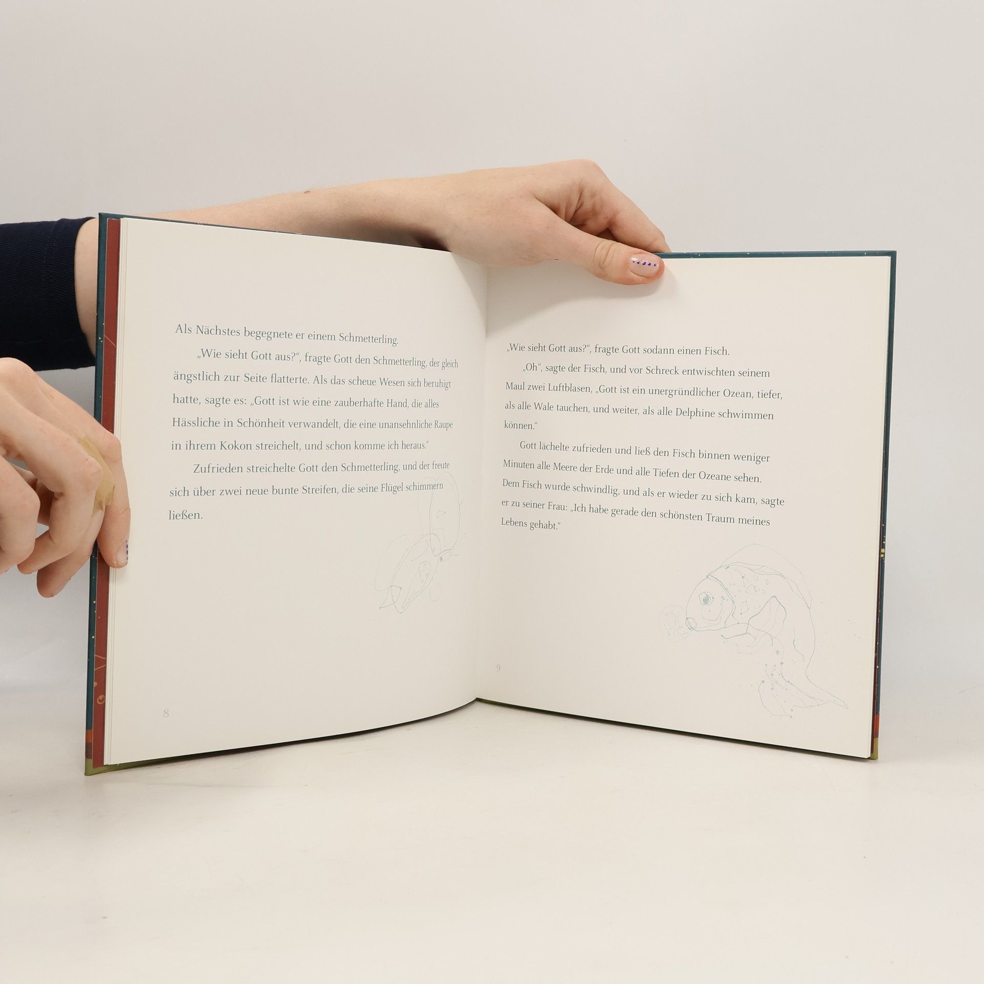 Gott will wissen, wie seine Geschöpfe ihn sehen. Er fragt die Wolke, den Schmetterling, den Fisch, die Schildkröte und das Atom. Auch die Jasminblüte, die Maus und den Regenbogen. Ihre Antworten bezeugen die wunderbare Verbindung von Geschöpf und Schöpfung. So weiß sich die Wolke bewegt, der Schmetterling mit Schönheit gesegnet, die Maus geschützt, und der Regenbogen ist sicher, dass sich hinter Gott nur ein unvorstellbar humorvoller Zauberer verbergen kann. Am Ende fragt Gott ein kleines Mädchen und einen alten Maler. Über deren Antworten muss er allerdings gründlich nachdenken.