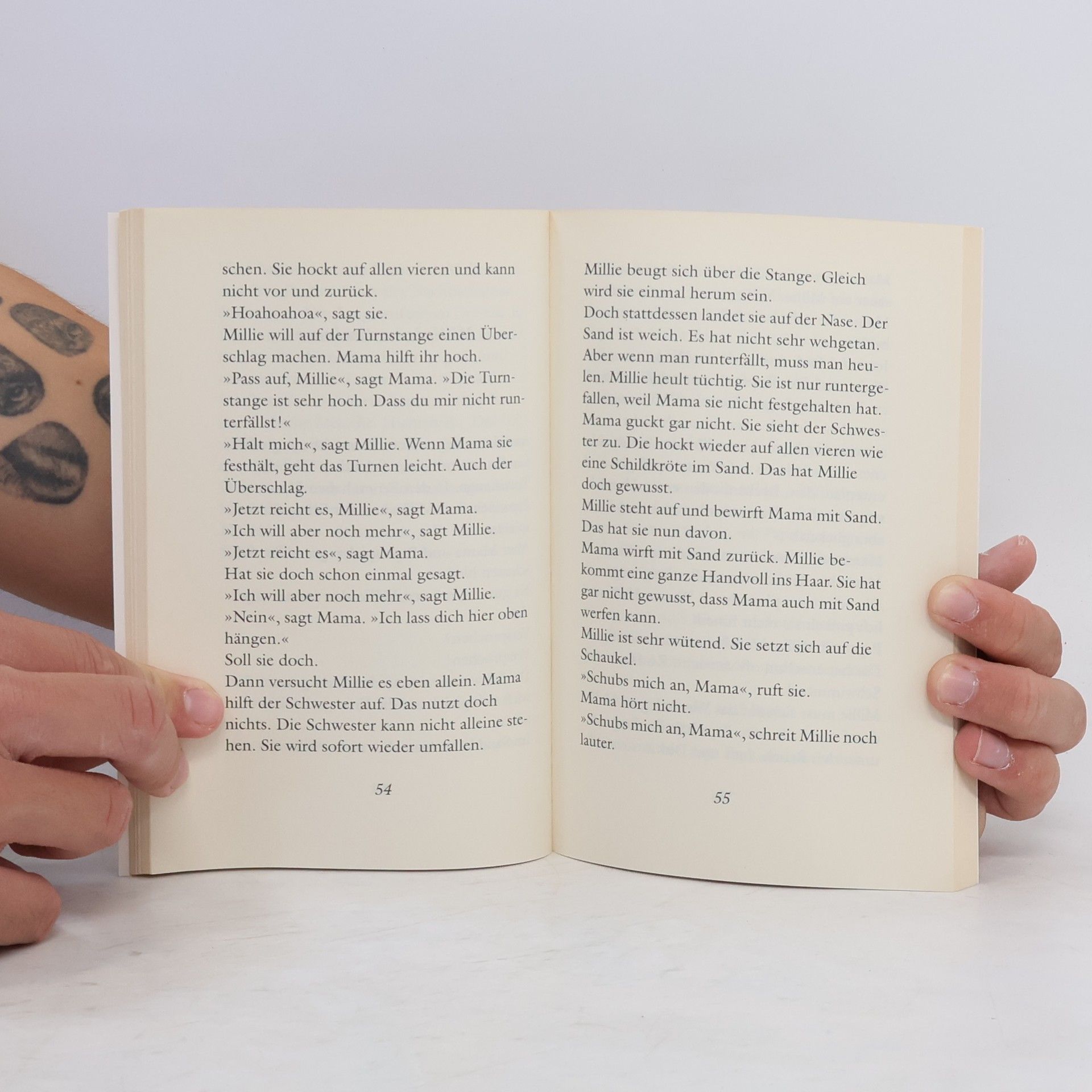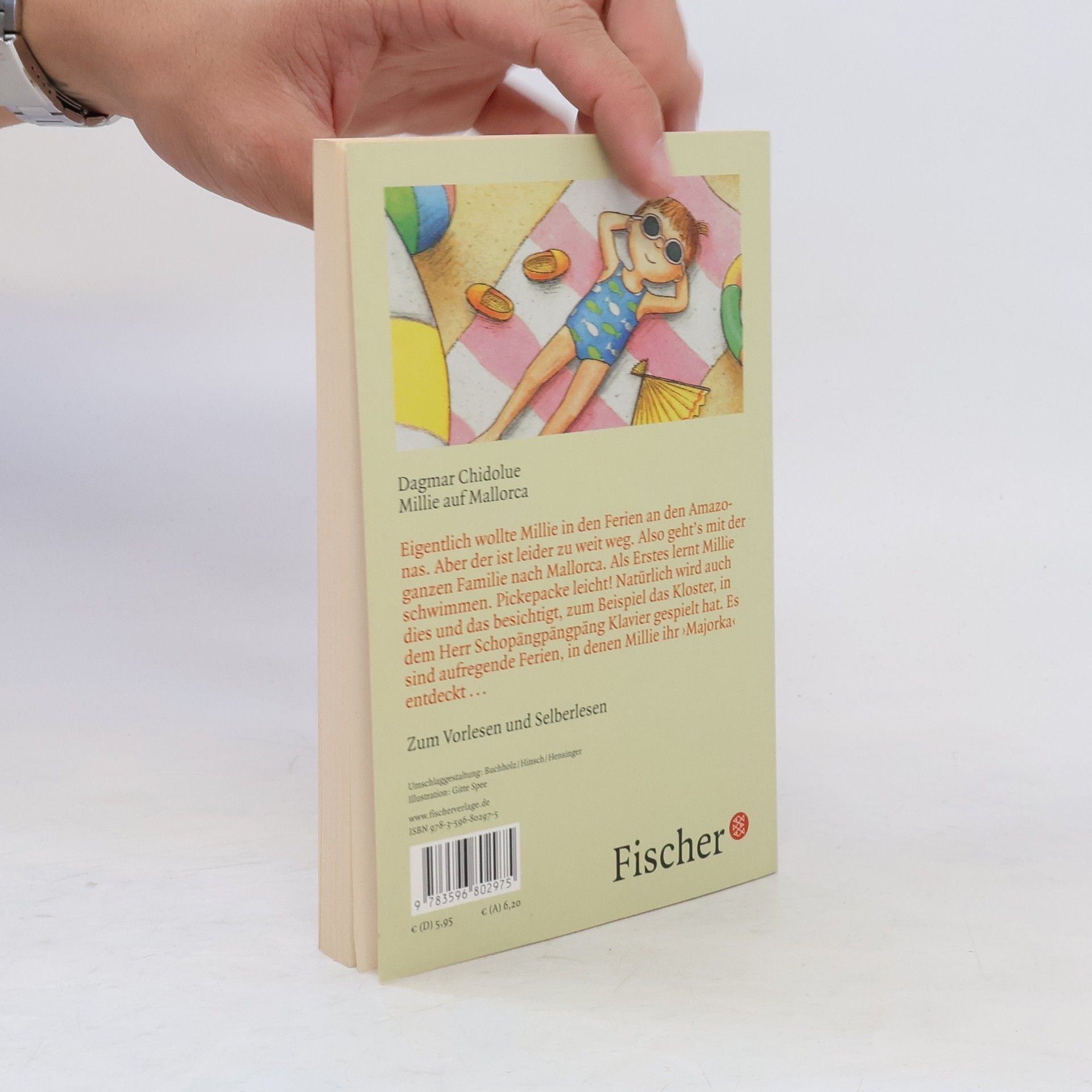 Eigentlich wollte Millie ja an den Amazonas. Aber der ist leider zu weit weg. Also fährt sie mit Mama, Papa und der kleinen Schwester nach Mallorca. Als Erstes lernt Millie schwimmen. Sie braucht nur die Arme und Beine zu bewegen. Pickepacke leicht. Dann besichtigen sie natürlich noch dies und das. Zum Beispiel das Kloster, in dem früher ein Herr Schopängpängpäng Klavier gespielt hat. Und überall auf Mallorca trifft Millie Miss Mandarella, eine wunderschöne Puppe, in Rot mit Rüschen. Das wär doch ein gutes Andenken, oder?