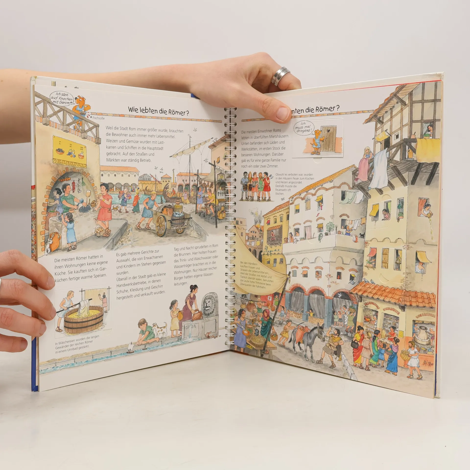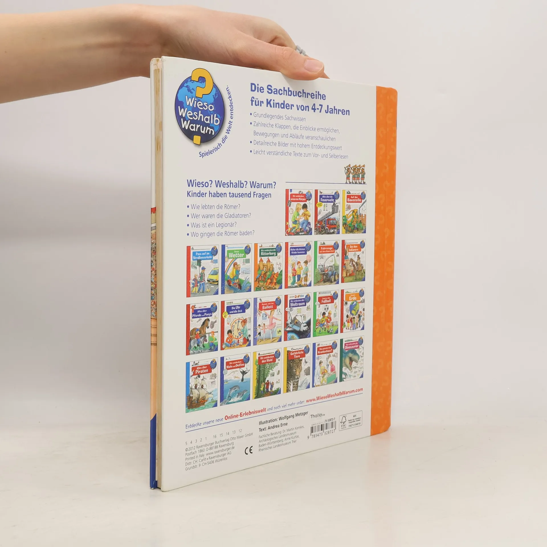 Eintauchen in das bunte Treiben der antiken Großstadt: Hier wandeln Kinder zwischen Händlern, Sklaven und Senatoren durch Roms Straßen. Dabei entdecken sie, wie unterschiedlich arme und reiche Römer lebten und womit ihre Kinder spielten. Sie besuchen die Gladiatoren in der Arena und ein römisches Heerlager. Klappen bieten spannende Einblicke in ein Legionärszelt, den Circus Maximus oder eine Therme. So wird die römische Kultur lebendig erfahrbar. Wieso? Weshalb? Warum? Die Sachbuchreihe für Kinder von 4–7 Jahren Jeden Tag entdecken Kinder etwas Neues – da kommen viele Fragen auf. Warum sind die Dinosaurier ausgestorben? Wo ist die Sonne in der Nacht? Wozu brauchen wir das Blut? Die beliebte Sachbuchreihe Wieso? Weshalb? Warum? gibt Kindern Antworten auf Augenhöhe. Dabei werden die unterschiedlichsten Themen aus der Alltags- und Interessenswelt der Kinder altersgerecht und mit viel Liebe zum Detail unter die Lupe genommen. Detailreiche Bilder, verständliche Sachtexte und überraschende Klappen, die Bewegungen oder Abläufe veranschaulichen und hinter die Dinge blicken lassen, ermöglichen Kindern, sich ihre Themen selbst zu erschließen. Der Spaß am eigenhändigen Entdecken, die liebevolle Umsetzung und die qualitativ hochwertige Ausstattung garantieren langanhaltende Freude an jedem einzelnen Buch.
