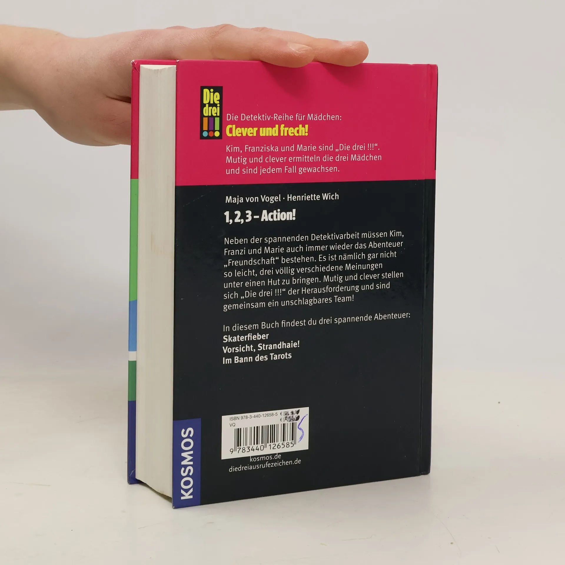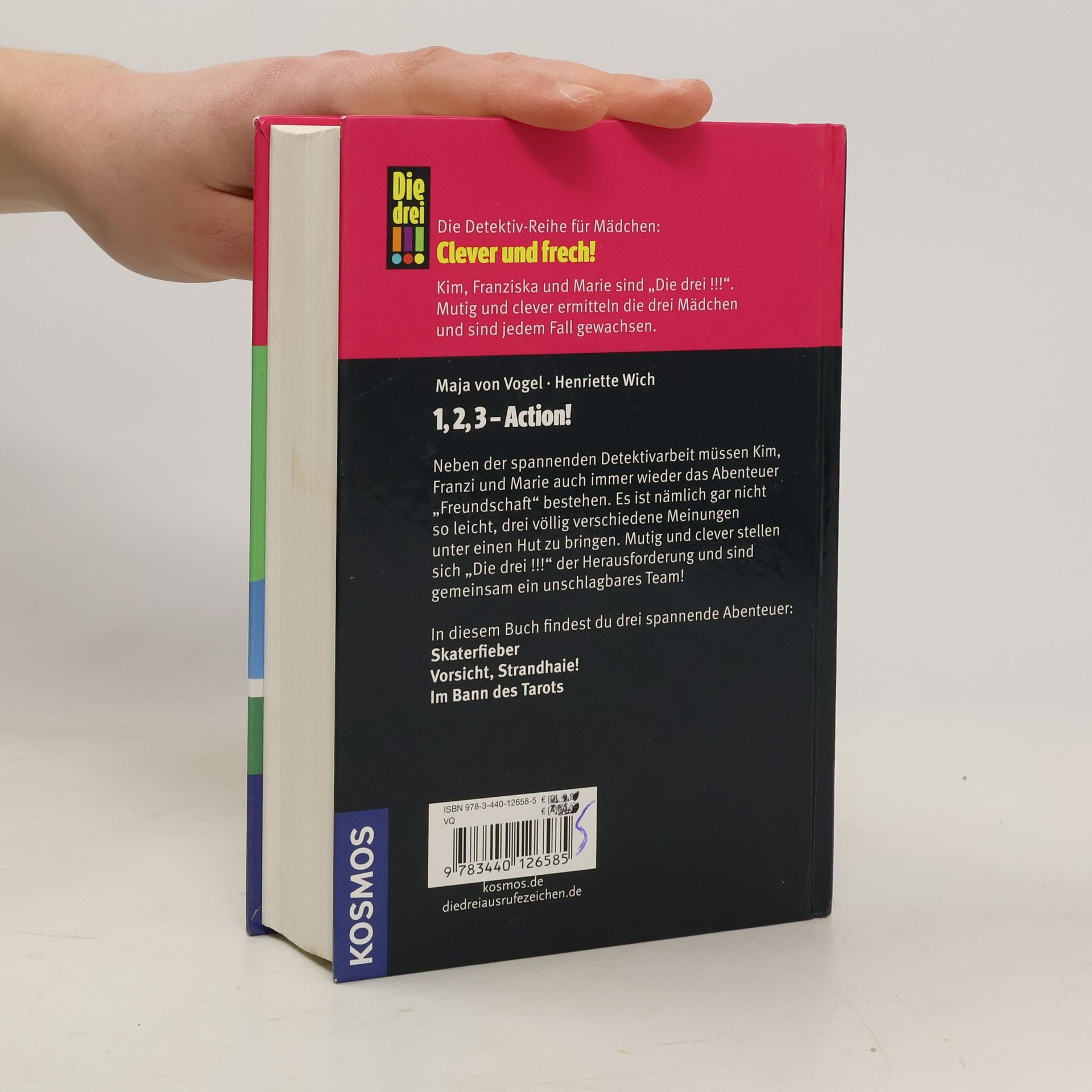 Kim, Franziska und Marie sind „Die drei !!!“. Mutig und clever ermitteln die drei Mädchen und sind jedem Fall gewachsen. Drei spannende Abenteuer in einem Band: Skaterfieber, Vorsicht Strandhaie!, Im Bann des Tarots. Ob merkwürdige Typen in teuren Marken-Outfits an der neuen Skateranlage, ein geheimnisvolles Spukhaus nahe des Sommercamps am Meer oder mysteriöse Nachrichten auf einer Serie Tarot-Karten - „Die drei !!!“ folgen jeder Spur und lösen jeden Fall. Neben der spannenden Detektivarbeit müssen Kim, Franziska und Marie auch immer wieder das Abenteuer „Freundschaft“ bestehen. Es ist nämlich gar nicht so leicht, drei völlig verschiedene Meinungen unter einen Hut zu bringen. Mutig und clever stellen sich „Die drei !!!“ der Herausforderung und sind gemeinsam ein unschlagbares Team!