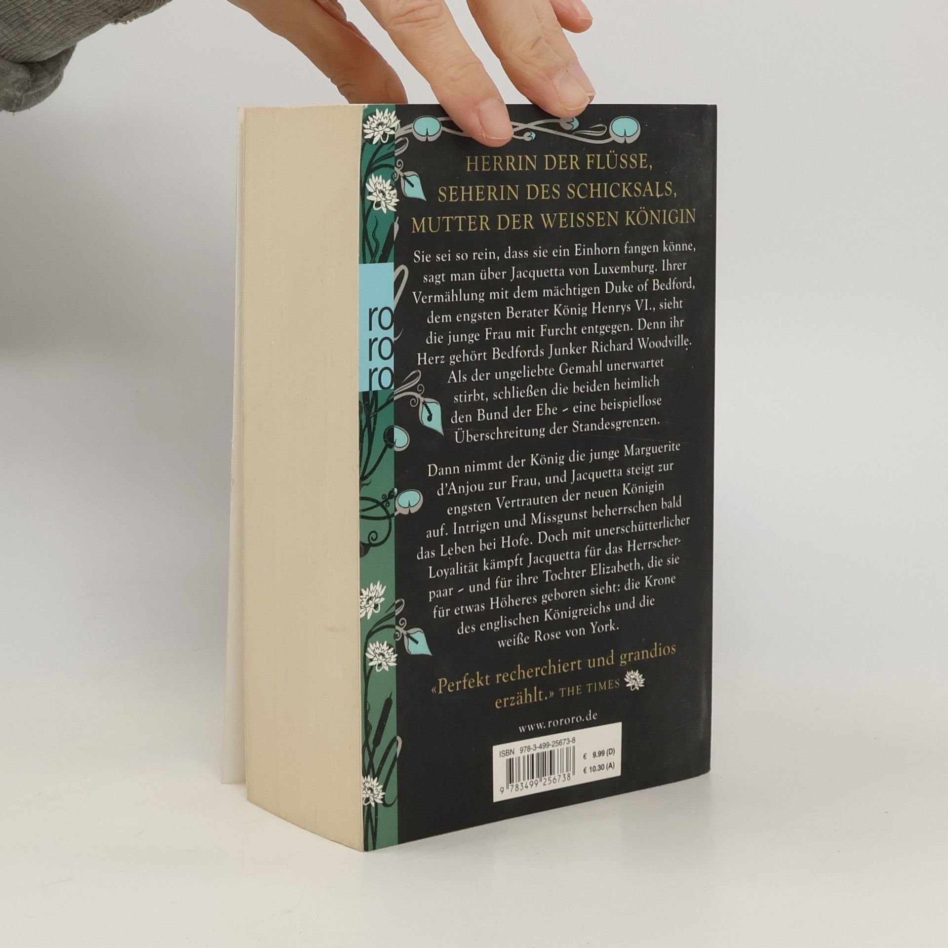 Herrin der Flüsse, Seherin des Schicksals, Mutter der weißen Königin. Sie sei so rein, dass sie ein Einhorn fangen könne, sagt man über Jacquetta von Luxemburg. Ihrer Vermählung mit dem mächtigen Duke of Bedford, dem engsten Berater König Henrys VI., sieht die junge Frau mit Furcht entgegen. Denn ihr Herz gehört Bedfords Junker Richard Woodville. Als der ungeliebte Gemahl unerwartet stirbt, schließen die beiden heimlich den Bund der Ehe – eine beispiellose Überschreitung der Standesgrenzen.Dann nimmt der König die junge Marguerite d’Anjou zur Frau, und Jacquetta steigt zur engsten Vertrauten der neuen Königin auf. Intrigen und Missgunst beherrschen bald das Leben bei Hofe. Doch mit unerschütterlicher Loyalität kämpft Jacquetta für das Herrscherpaar – und für ihre Tochter Elizabeth, die sie für etwas Höheres geboren sieht: die Krone des englischen Königreichs und die weiße Rose von York.
