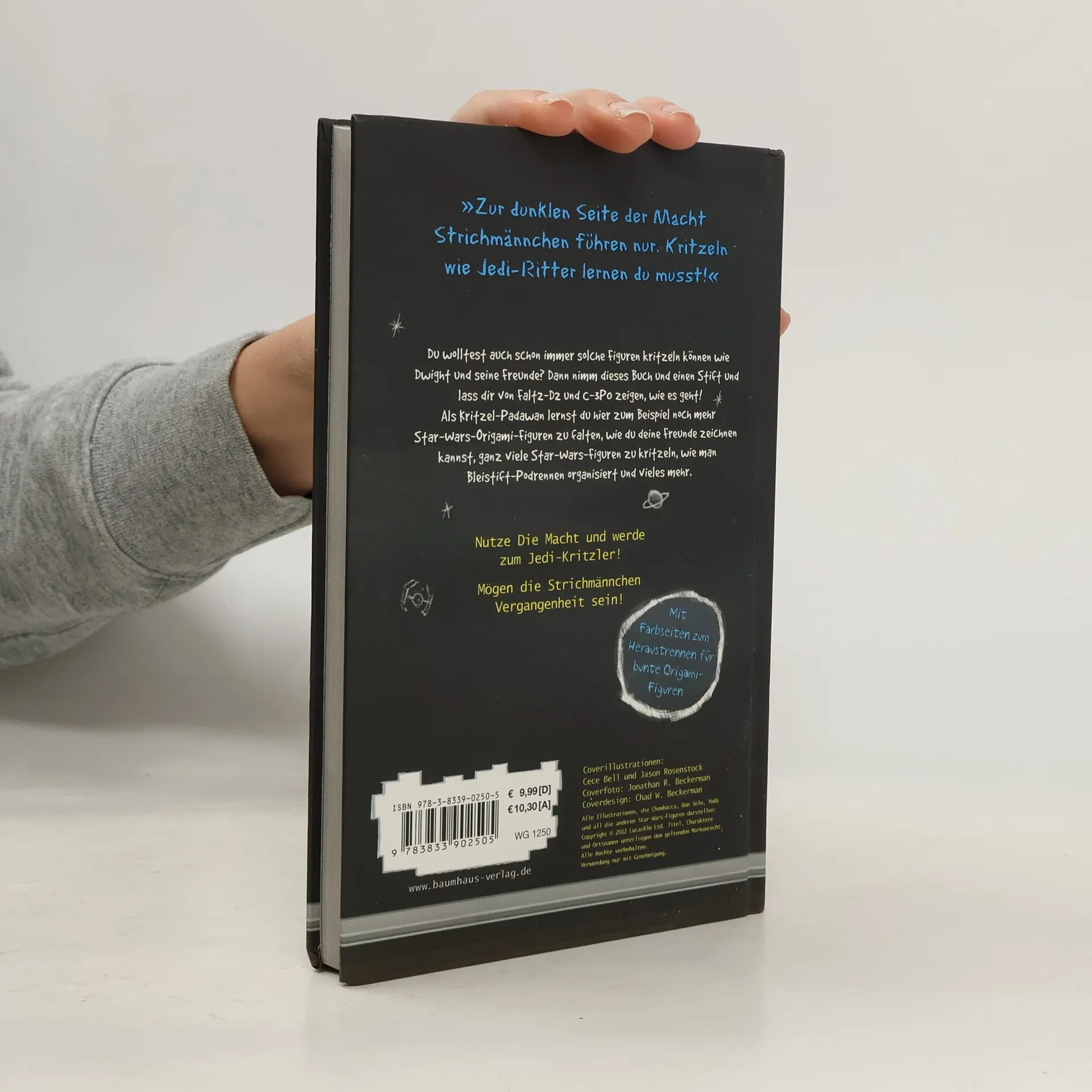 „Zur dunklen Seite der Macht Strichmännchen führen nur. Kritzeln wie Jedi-Ritter lernen du musst!“ Du wolltest auch schon immer solche Figuren kritzeln können wie Dwight und seine Freunde? Dann nimm dieses Buch und einen Stift und lass dir von Falt2-D2 und C-3PO zeigen, wie es geht! Als Kritzel-Padawan lernst du hier zum Beispiel noch mehr Star-Wars-Origami-Figuren zu falten, wie du deine Freunde zeichnen kannst, ganz viele Star-Wars-Figuren zu kritzeln, wie man Bleistift-Podrennen organisiert und vieles mehr. Nutze Die Macht und werde zum Jedi-Kritzler! Mögen die Strichmännchen Vergangenheit sein! Mit Farbseiten zum Heraustrennen für bunte Origami-Figuren