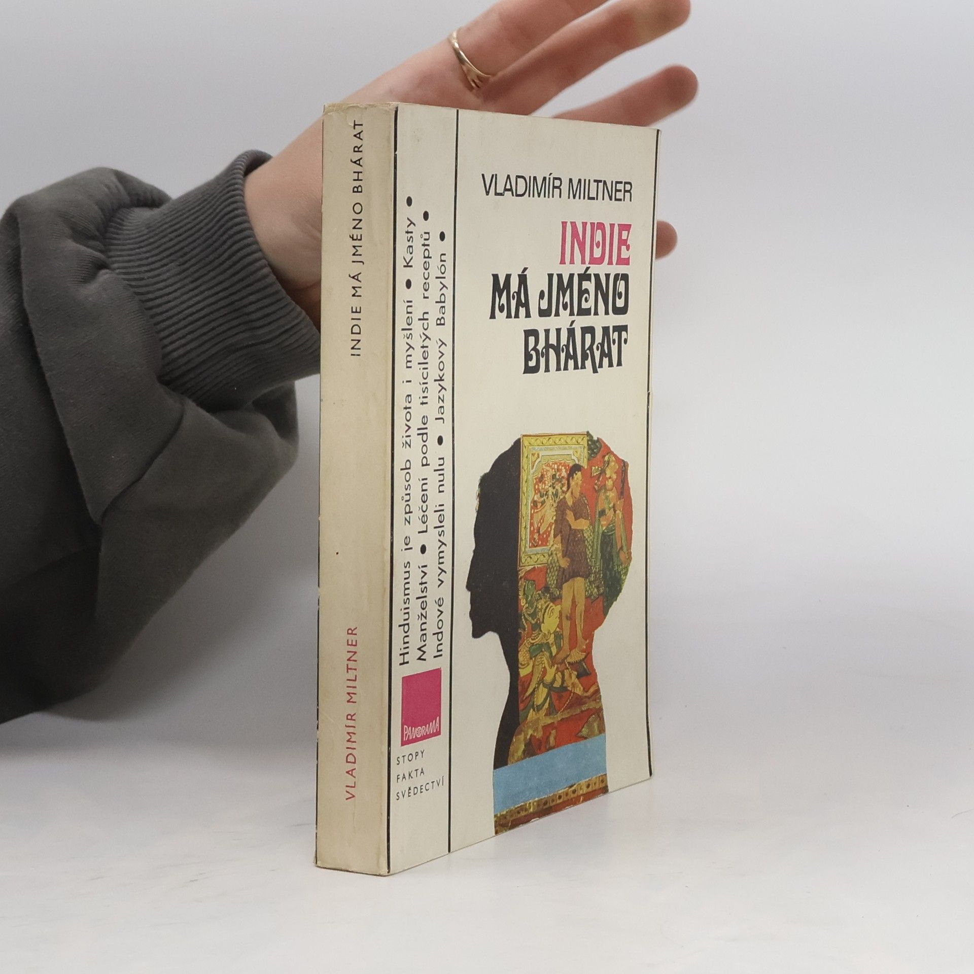 aneb Úvod do historie bytí a vědomí indické společnosti. Autor, který seznamuje s tzv. árijskou Indií, s Indy, s nimiž jsme spjati dávnými pouty etnické a jazykové příbuznosti, si všímá Indie z geologického hlediska, přibližuje prvního indického krále, jeho rod a střídající se a zápasíc ídynastie, pojednává o islámu, o hinduismu jako způsobu života a myšlení, o kastách, manželství, kultuře, jazyce aj.