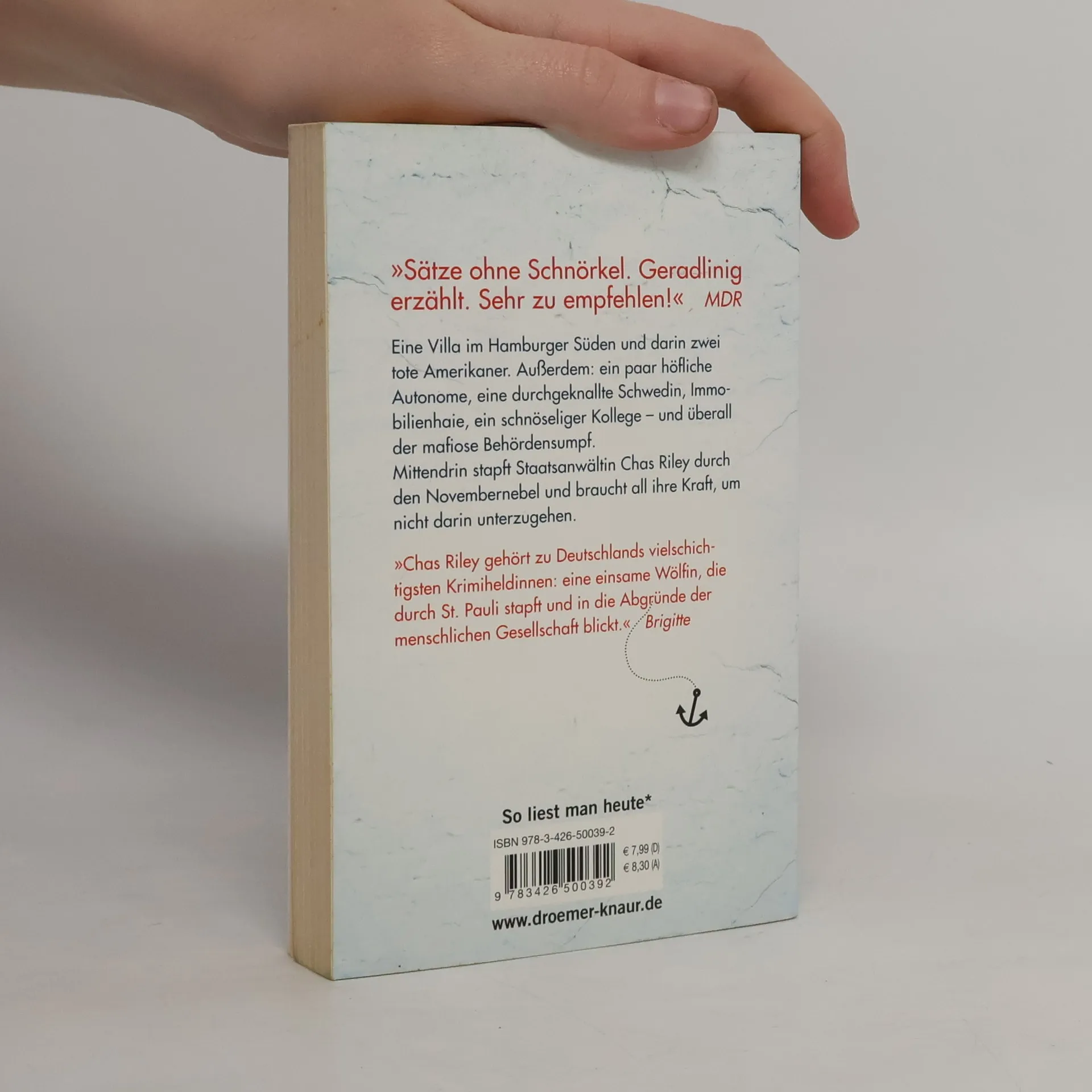 Eine Villa im Hamburger Süden und darin zwei tote Amerikaner. Außerdem: ein schnüffelnder Ex-Kommissar, ein paar sehr höfliche Autonome, eine durchgeknallte Schwedin, Immobilienhaie, eine Freundin, die vielleicht ein Kind bekommt, ein schnöseliger Kollege – und überall der mafiose Behördensumpf. Mittendrin stapft Staatsanwältin Chas Riley durch den Novembernebel und braucht all ihre Kraft, um nicht darin unterzugehen.