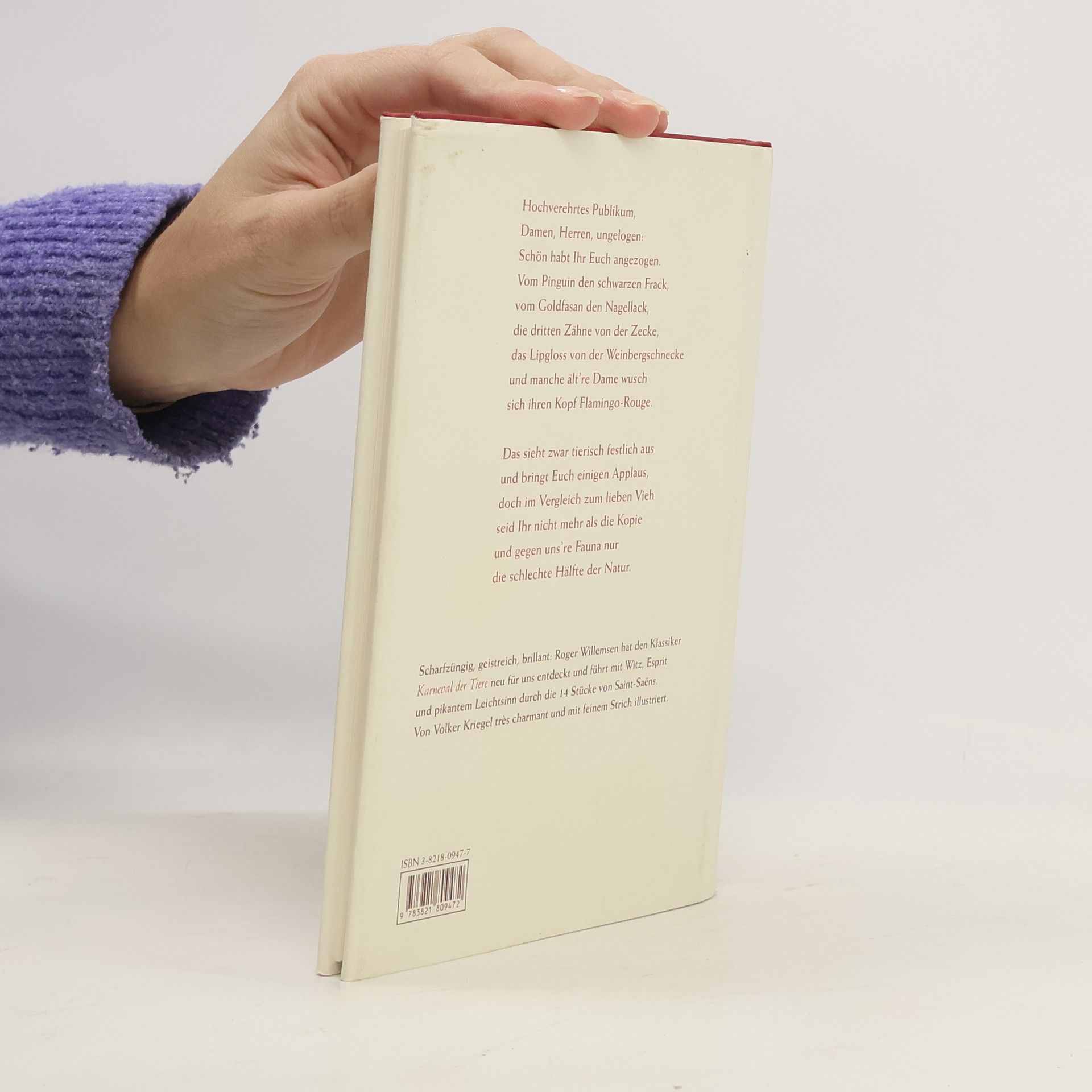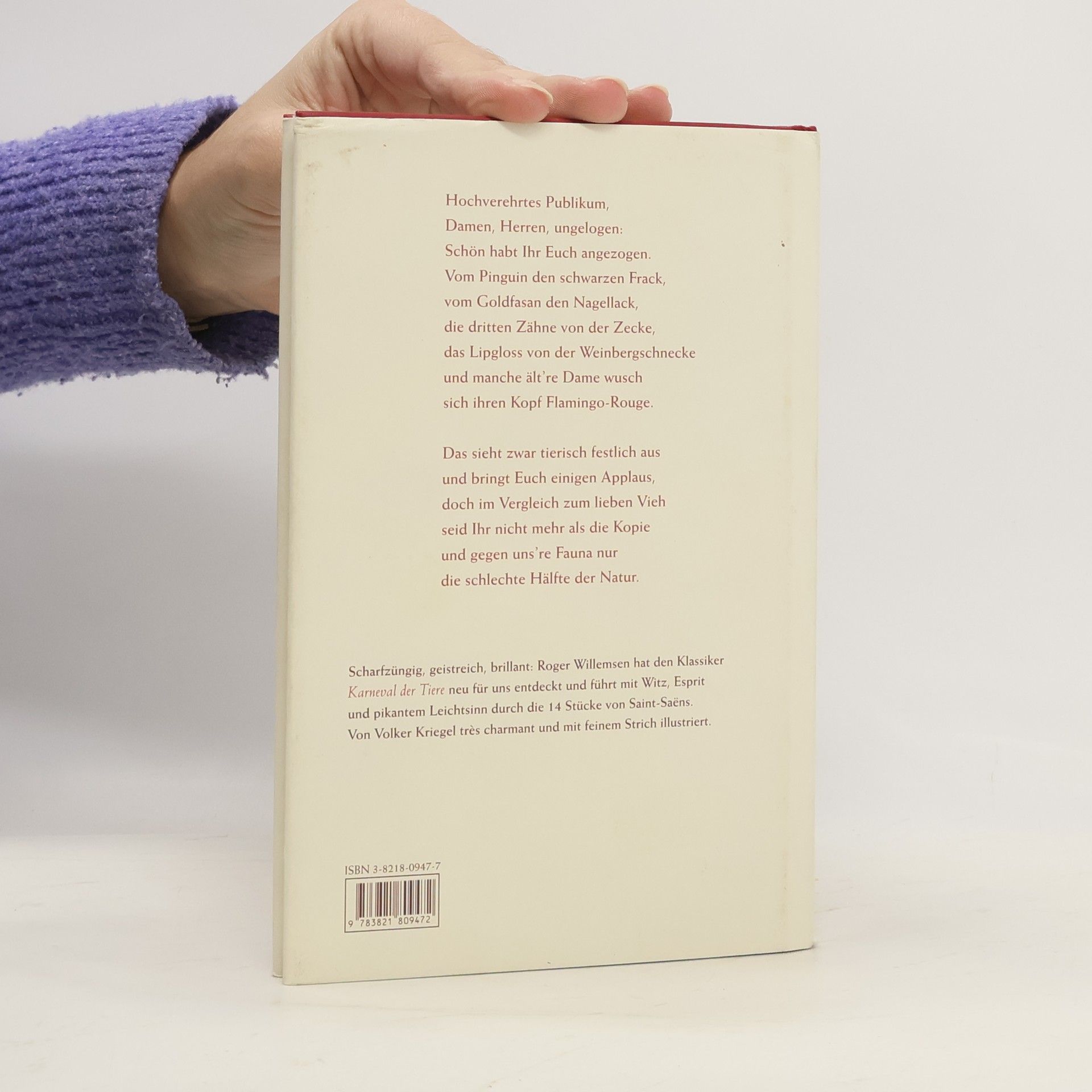 "Tiere sind die besseren Menschen", dachte der Sprachakrobat Roger Willemsen und widmete sich dem berühmten Karneval der Tiere von Camille Saint-Saens. Die tierischen Reize dieser "zoologischen Fantasie" haben Willemsen zu einer scharfzüngigen und spöttischen Reise in die Tierwelt animiert. Munter läßt er den Reigen der musizierenden Tiere aufmarschieren. Da trägt die Weinbergschnecke Lipgloss auf, Elefanten ziehen mit Schnulzen ins Land hinaus und zum Pianoforte hüpft die Springmaus aus der Torte. Hier reimt sich Antilope auf Synkope und Kieler Sprotte auf Gavotte. Auch der Ochsen-Pavarotti hat seinen Auftritt und trifft dabei auf die Bremer Boygroupmusikanten. Mit sprachlichem Witz und Freude am Pittoresken führt Willemsen den Leser schwungvoll durch die 14 Stücke von Saint-Saens. Die Tierwelt hat ihren Auftritt und Willemsen lädt ein zum Festkonzert. Nach Loriot und Peter Ustinov stimmt Roger Willemsen mit dem Karneval der Tiere intelligent und kunstvoll ein Loblied auf die Tierwelt an.