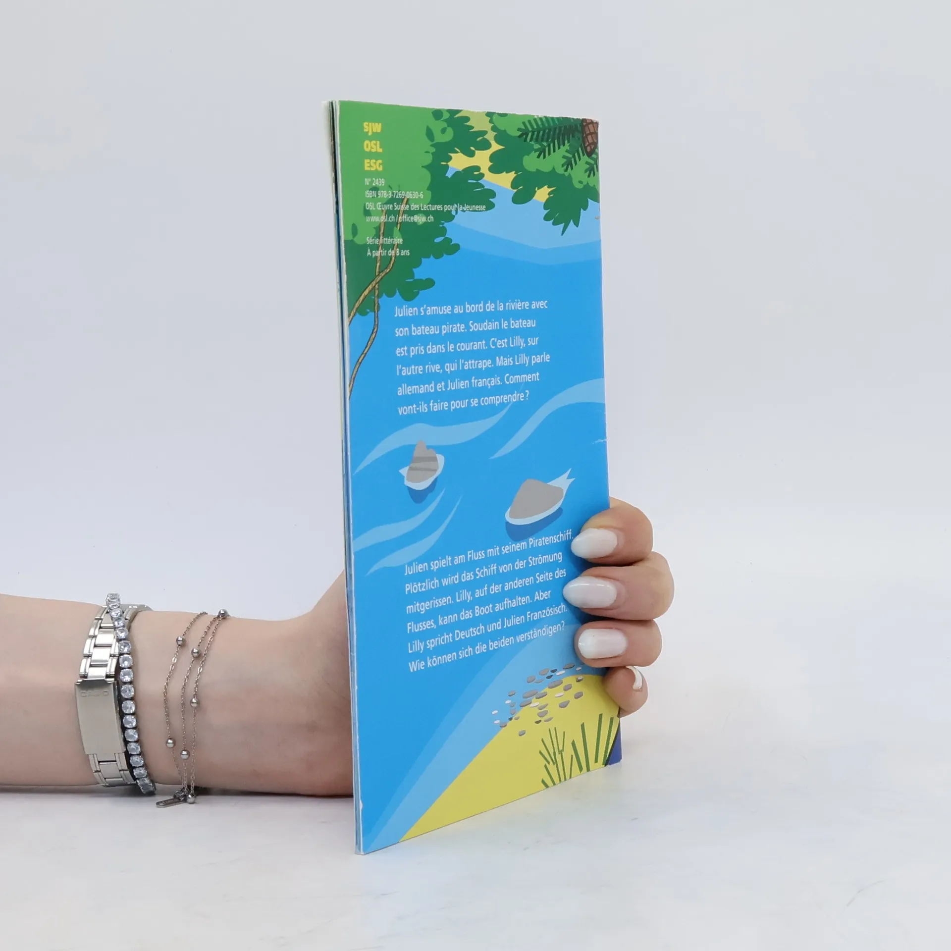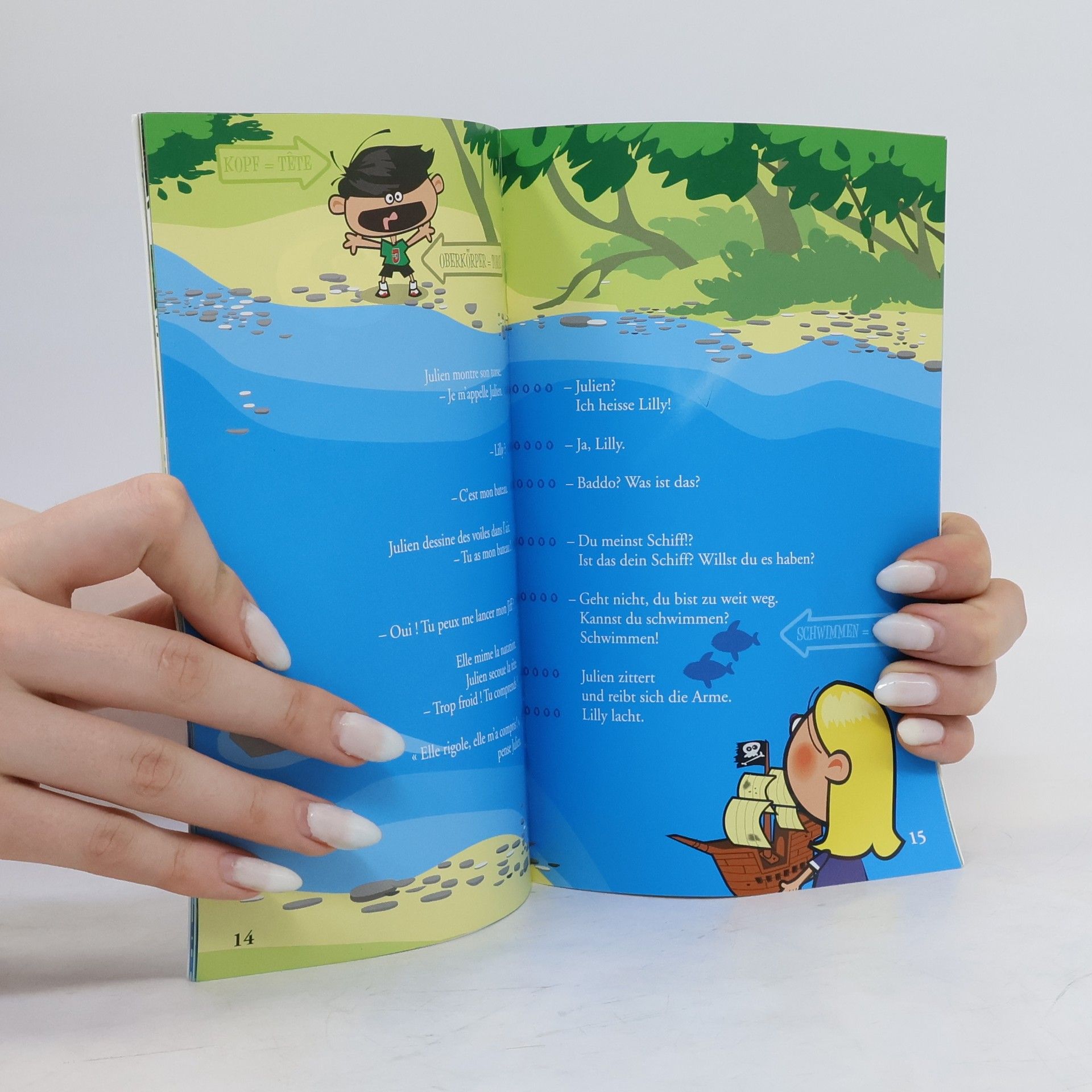 Julien spielt am Fluss mit seinem Piratenschiff. Plötzlich wird das Schiff von einer Welle mitgerissen. Lilly, auf der anderen Seite des Flusses, kann das Boot aufhalten. Aber Lilly spricht Deutsch und Julien Französisch. Wie können sich die beiden verständigen? Eine fröhliche Röstigrabengeschichte in Französisch und Deutsch. Julien s’amuse au bord de la rivière avec son bateau pirate. Soudain le bateau est pris dans le courant. C’est Lilly, sur l’autre rive, qui l’a attrapé. Mais Lilly parle allemand et Julien français. Comment vont-ils faire pour se comprendre?
