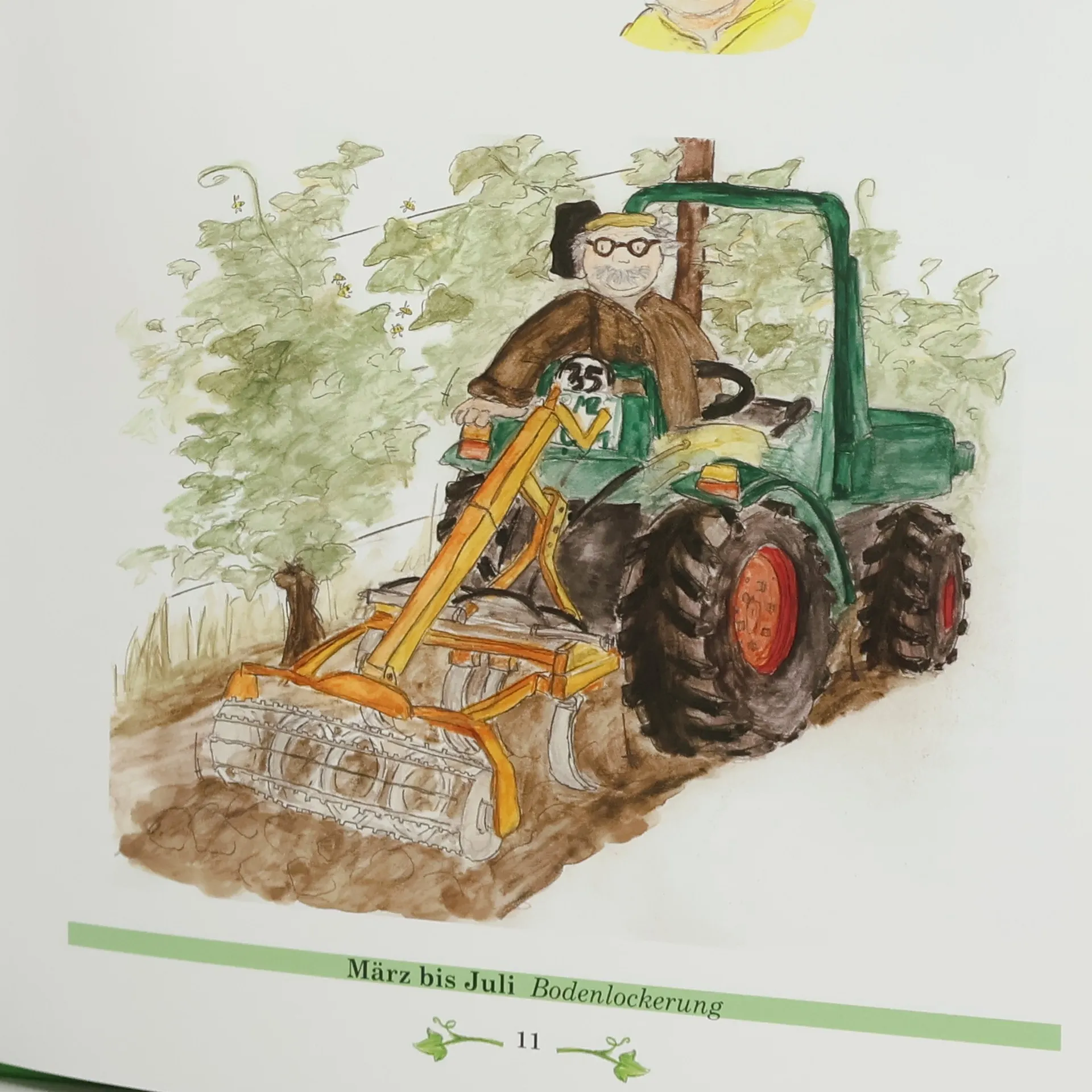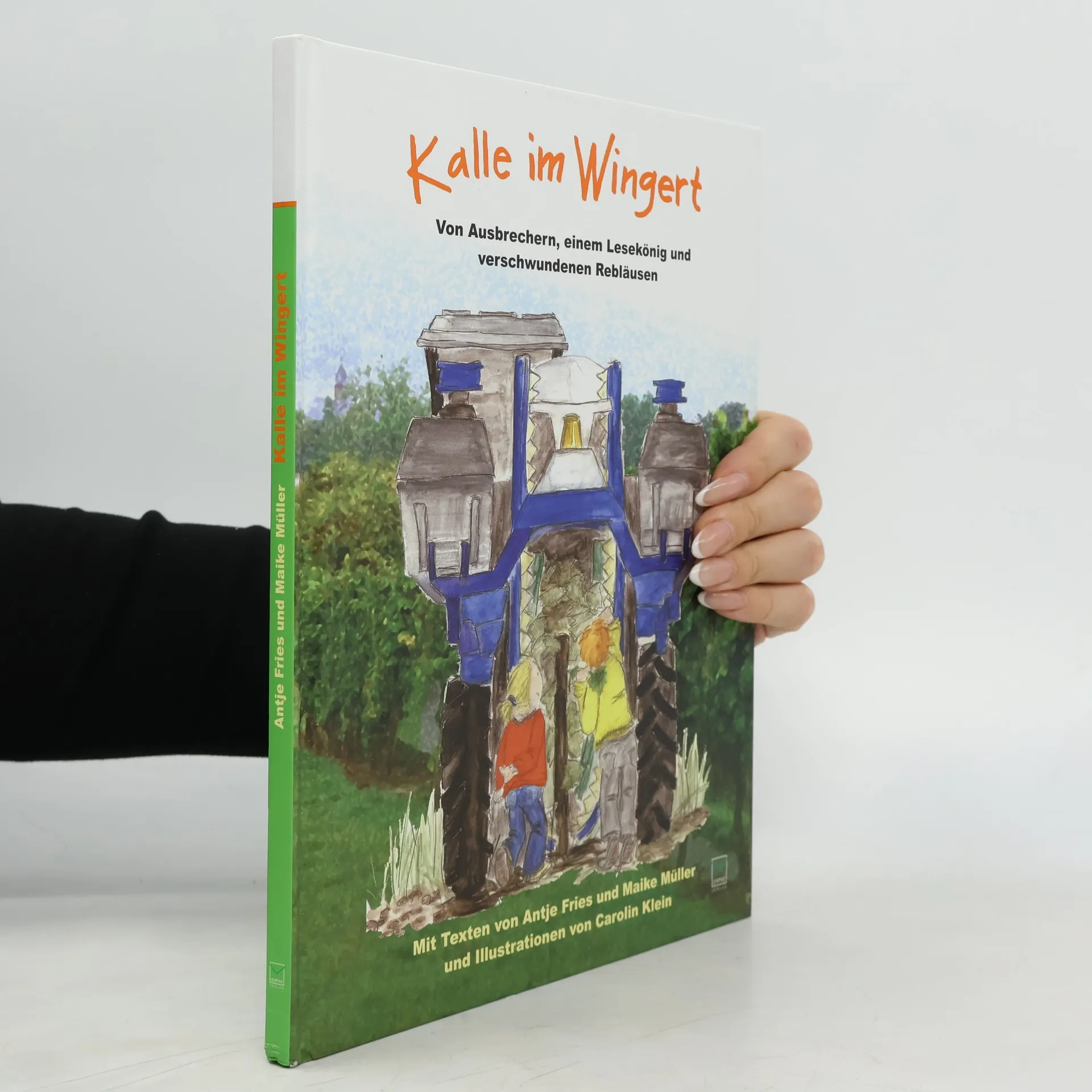 Kalle zieht von Berlin in ein rheinhessisches Weindorf und hat von nix eine Ahnung, weder vom Weinmachen noch vom Leben auf dem Lande noch vom Wechsel der Jahreszeiten. Erst als er die gleichaltrige Mia kennenlernt und ihren Opa Erwin, der Winzer ist, ändert sich dies schlagartig. Er erfährt genau, welche Arbeiten das Jahr über im Weinberg oder im Keller zu tun sind. Und nicht nur das: Anhand alter Fotos erklärt ihm Opa Erwin auch, wie diese Arbeiten früher ohne maschinelle Hilfe erledigt wurden. – Die meisten Doppelseiten sind so konzipiert, dass die Kinder auf einer Seite auf einem historischen Foto sehen, wie es früher war, zum Beispiel die Weinlese von Hand in ganzen Familienverbänden, und auf der anderen Seite die farbige Illustration mit dem Vollernter. Die Geschichte beginnt im Januar und endet im Januar des darauf folgenden Jahres. Und weil viele Kinder – ebenso wie Kalle – heute nicht wissen, wann genau der Raps blüht, haben wir unten auf jeder Seite eine Zeitleiste angebracht, die den entsprechenden Monat und die jeweilige Winzerarbeit nennt. Die Texte haben die beiden Grundschullehrerinnen Antje Fries und Maike Müller geschrieben, die detailreichen Illustrationen hat die Erzieherin Carolin Klein gezeichnet. Alle drei stammen aus dem südlichen Rheinhessen und kennen die Arbeit in Winzerbetrieben aus eigener Anschauung.