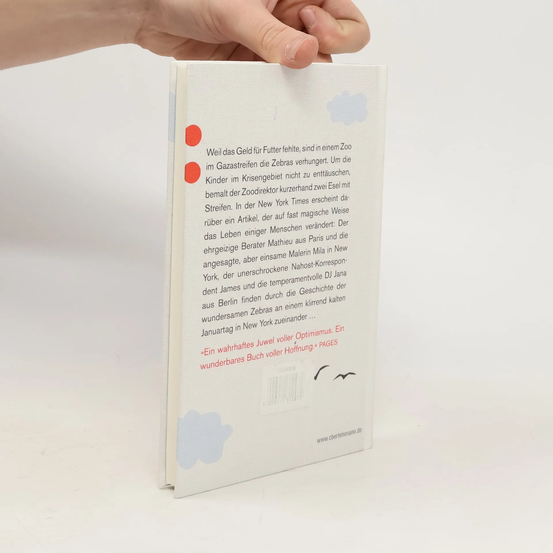 Ein zauberhaftes Verschenkbuch über Frieden, Liebe und die Kraft der Magie Weil ihm das Geld für Futter fehlte, sind dem Zoodirektor Mahmoud Barghouti im Gazastreifen die Zebras verhungert. Um den Kindern in schlimmen Zeiten Freude zu spenden, greift er kurzerhand zu Pinsel und Farbe und malt zwei Eseln Streifen. Der Kriegsberichterstatter der New York Times ist von dieser herzerwärmenden Geschichte so berührt, dass er darüber einen Artikel schreibt. Dieser wird auf fast magische Weise das Leben vieler Menschen verändern: Der ehrgeizige Unternehmensberater Mathieu aus Paris und die angesagte, aber einsame Malerin Mila in New York, der unerschrockene Nahost-Korrespondent James und die temperamentvolle DJ Jana aus Berlin finden durch die Geschichte der wundersamen Zebras aus dem Gazastreifen an einem klirrend kalten Januartag in New York zueinander.