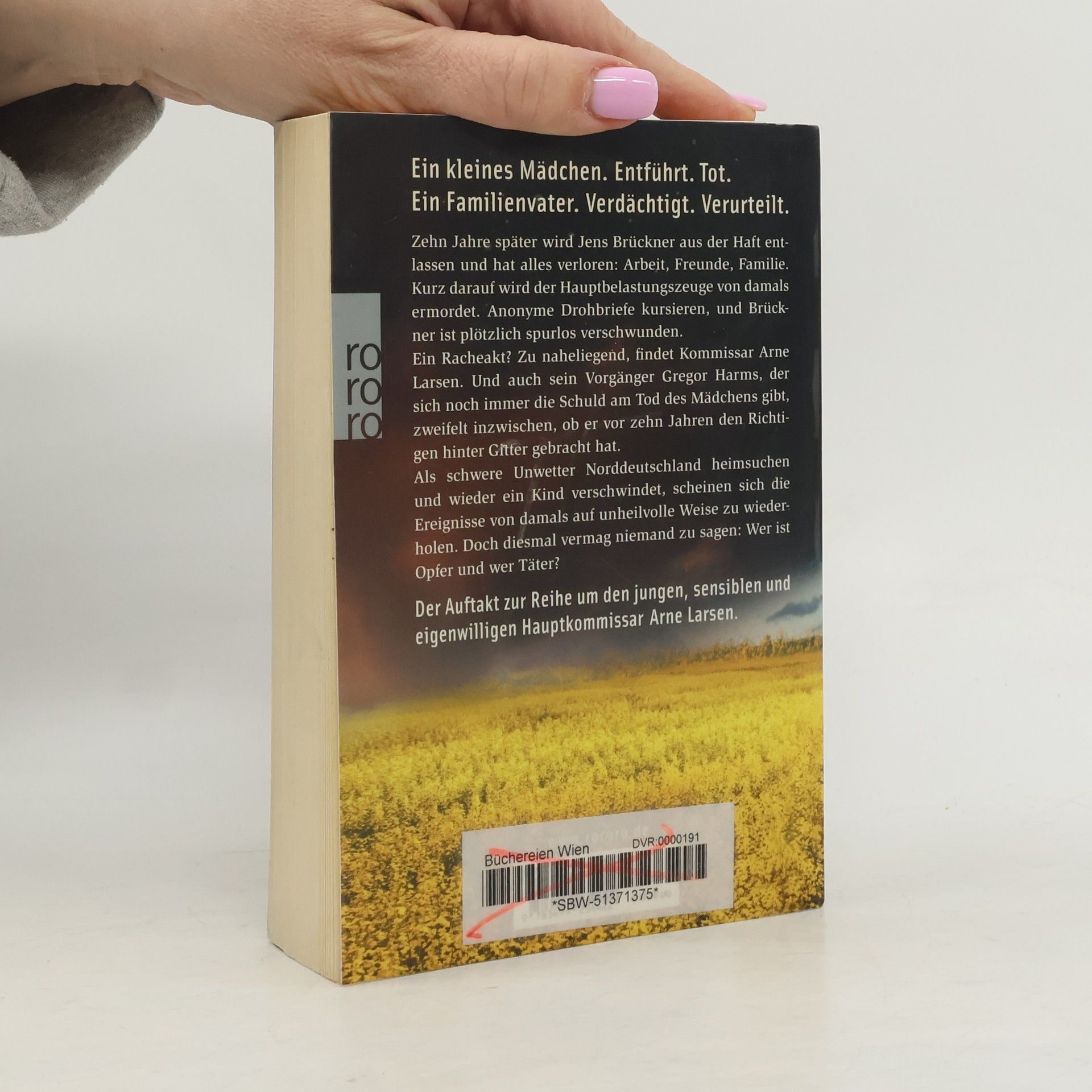 Es ist Hochsommer, als die neunjährige Ulrike entführt wird – und in ihrem Gefängnis umkommt. Schnell findet sich ein Verdächtiger: Zeugen wollen Jens Brückner mit dem Mädchen gesehen haben. Bis zuletzt beteuert er seine Unschuld. Vergeblich. Zehn Jahre später wird Brückner aus der Haft entlassen. Er hat alles verloren: Arbeit, Freunde, Familie. Kurz darauf wird der Hauptbelastungszeuge von damals ermordet. Anonyme Drohbriefe kursieren und Brückner ist plötzlich spurlos verschwunden. Ein Racheakt? Zu naheliegend, findet der ermittelnde Kommissar Arne Larsen. Und auch sein Vorgänger Gregor Harms, der sich noch immer die Schuld am Tod des Mädchens gibt, zweifelt inzwischen, ob er vor zehn Jahren den Richtigen hinter Gitter gebracht hat. Als schwere Unwetter Norddeutschland heimsuchen und wieder ein Kind verschwindet, scheinen sich die Ereignisse von damals auf unheilvolle Weise zu wiederholen. Doch diesmal vermag niemand zu sagen: Wer ist Opfer und wer Täter? Der Auftakt zur Reihe um den jungen, hochsensiblen und eigenwilligen Hauptkommissar Arne Larsen.