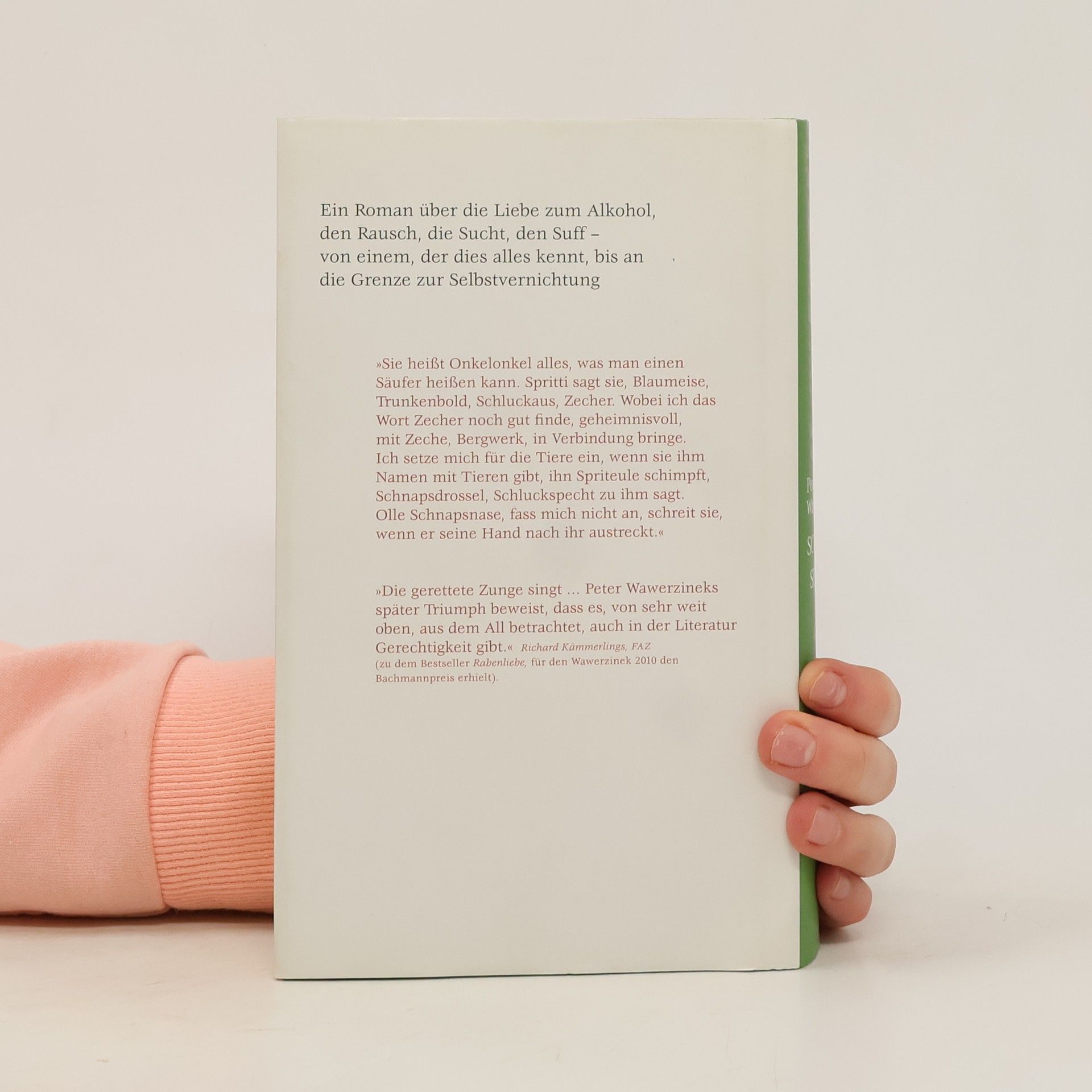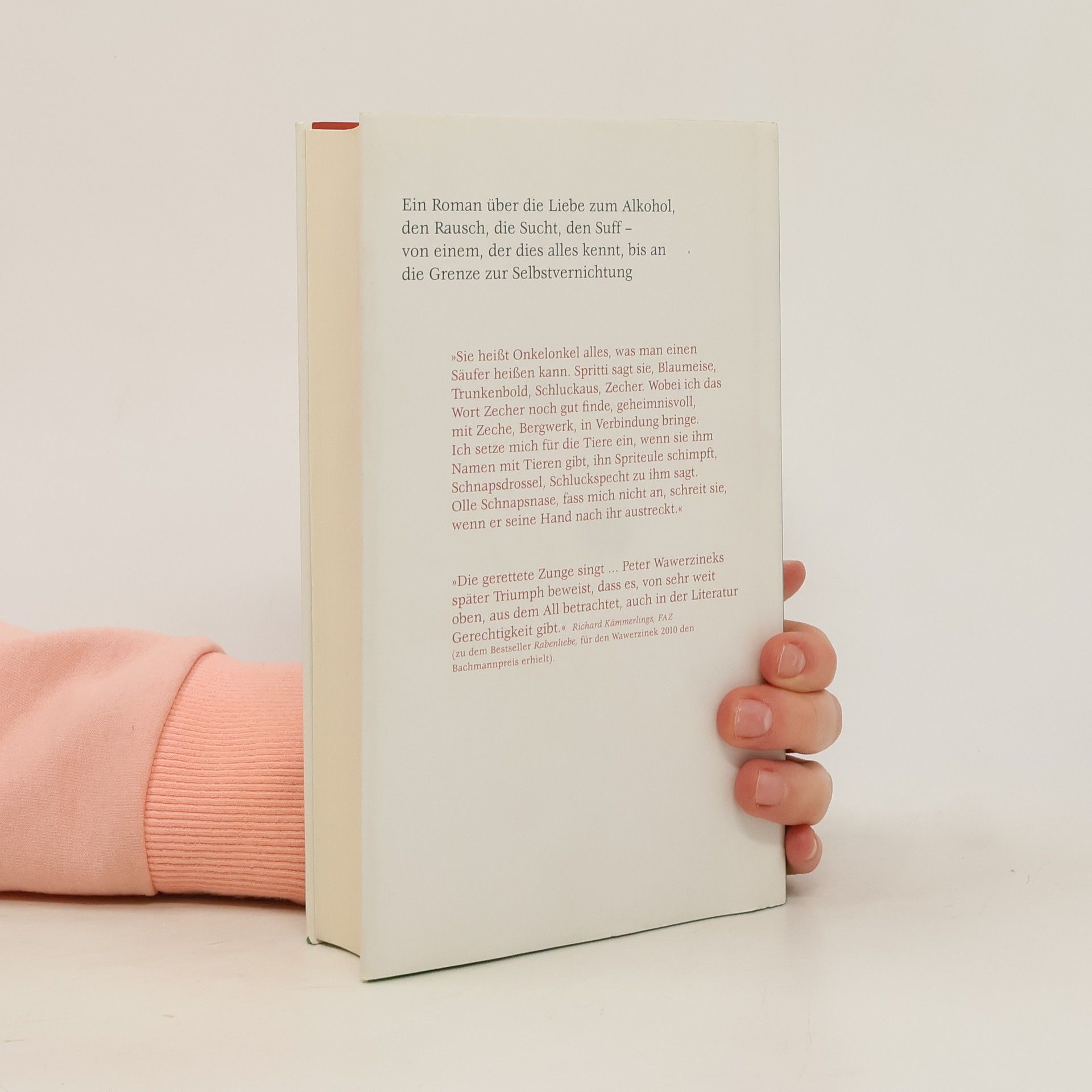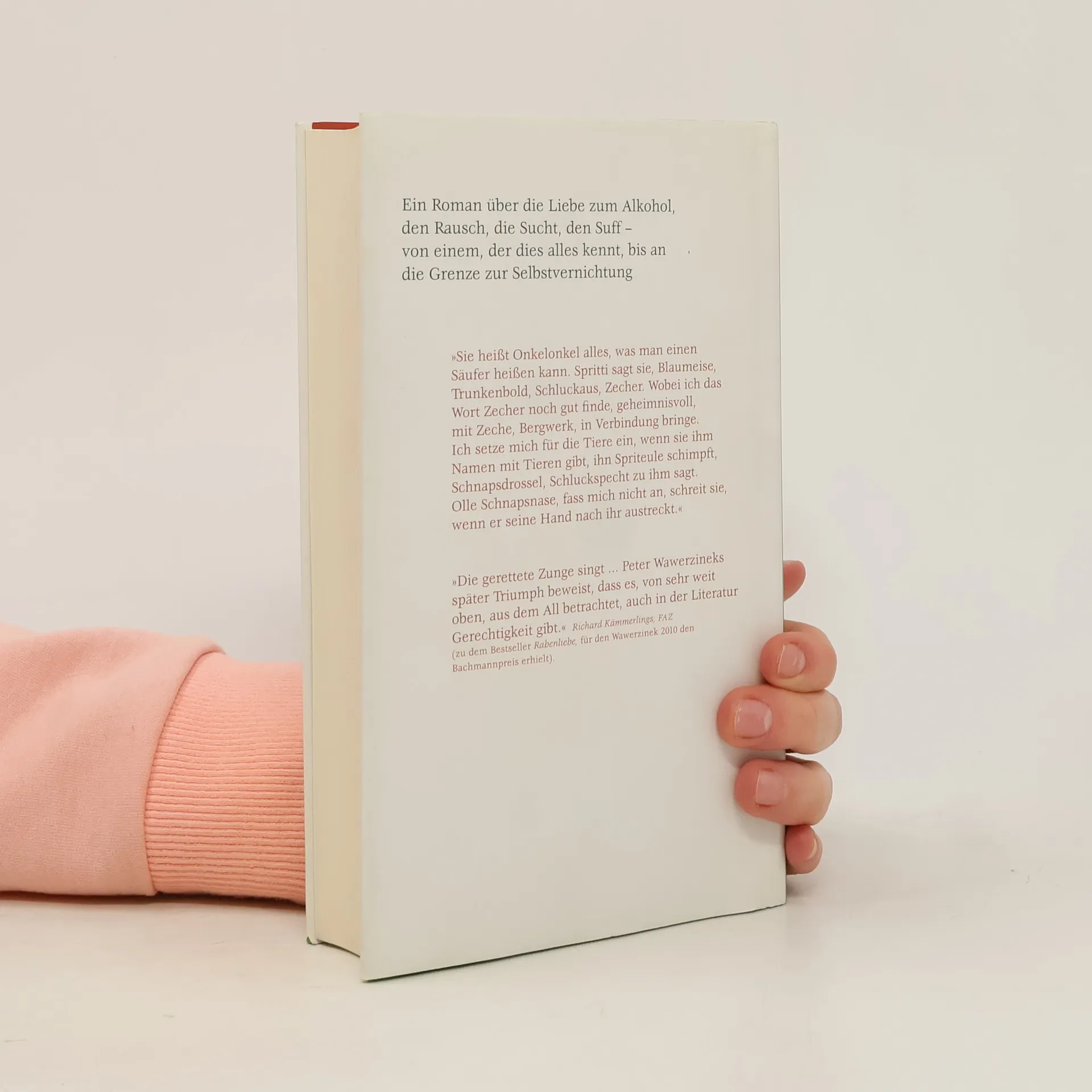 Über die Liebe, die Liebe zum Alkohol. Über den Rausch, die Sucht, den Suff – von einem, der ihn kannte Mit dem fröhlichen Egészségdre Palinka von Tante Luci fing es an, mit dem Schnüffeln am Rumtopf ging es weiter. Und dann folgten Eierlikör, fröhliche Trinkrunden mit Freunden, Mutproben, Bier, Wein, ein wildes Leben für die Kunst, Frauen, Feiern, Probleme, Abstürze, Weinbrand, Schnaps. Der Weltschmerz des von den Eltern verstoßenen Helden und der Versuch, ihn zu vergessen, führen in eine unglaubliche Nachtfahrt bis in die Abgründe des Exzesses. Doch wie der Autor Peter Wawerzinek einst selbst, schafft es auch seine Romanfigur, sich auf fast mirakulöse Art und Weise am eigenen Schopf aus dem Sumpf des Alkohols zu ziehen. Ein Hörbuch, prall voll mit unglaublichsten Geschichten von schmerzlicher, irrsinniger Komik.