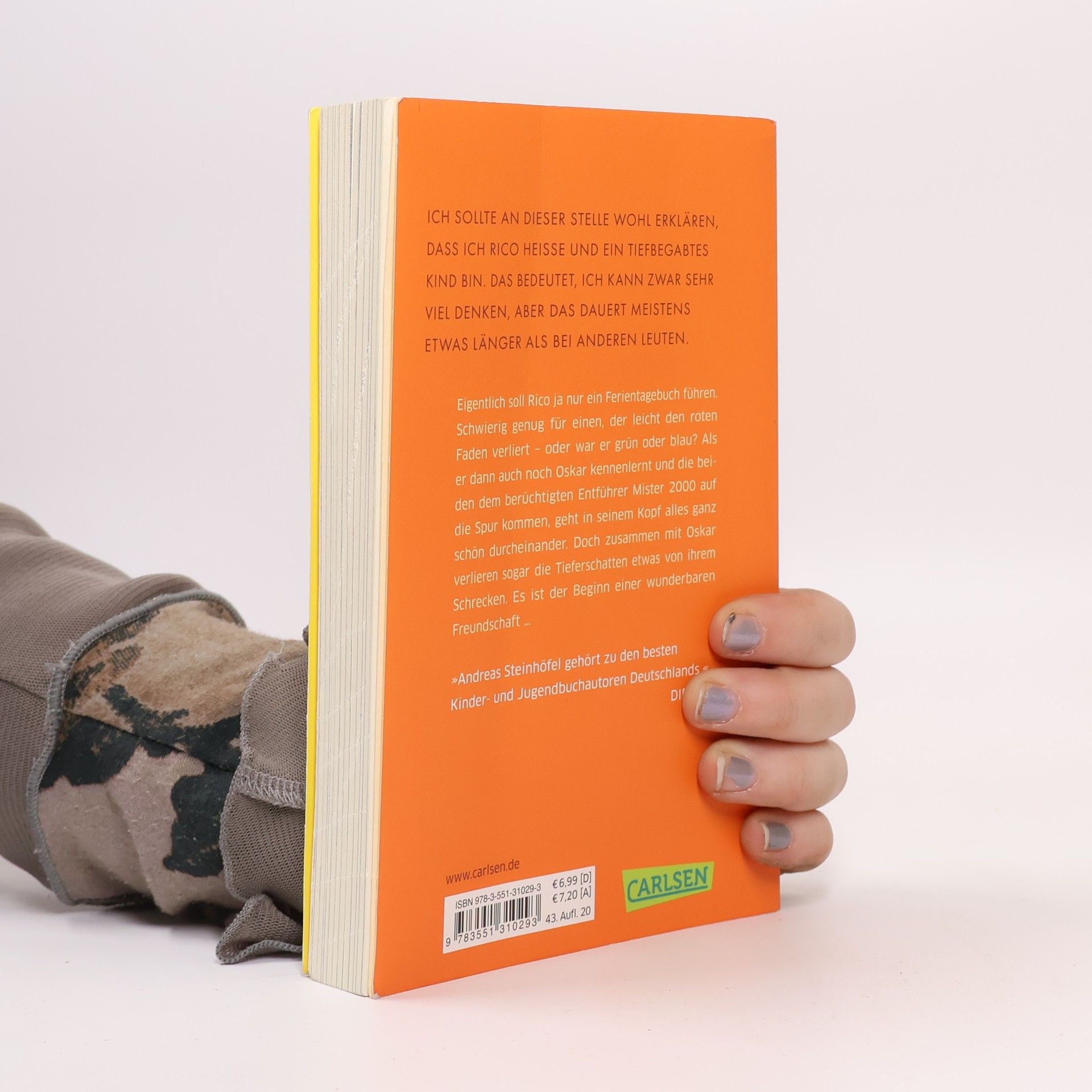 Band 1 der preisgekrönten und verfilmten Abenteuer mit Rico und Oskar Eigentlich soll Rico ja nur ein Ferientagebuch führen. Aber für einen, der ständig den Faden verliert, ist das gar nicht so leicht! Als er dann auch noch Oskar mit dem blauen Helm kennenlernt und die beiden dem berüchtigten ALDI-Kidnapper auf die Spur kommen, weiß Rico gar nicht mehr, wo vorne und hinten ist. Wenigstens verlieren mit Oskar die Tieferschatten etwas von ihrem Schrecken - und so entsteht aus dem ganzen Chaos eine wunderbare Freundschaft. »Fantasievoll, rührend, lustig. Einfach schön.« DER SPIEGEL Alle Bücher über Rico und Oskar: Rico, Oskar und die Tieferschatten (Band 1)Rico, Oskar und das Herzgebreche (Band 2)Rico, Oskar und der Diebstahlstein (Band 3)Rico, Oskar und das Vomhimmelhoch (Band 4) Kindercomics:Rico & Oskar – Fische aus Silber Rico & Oskar – Die RegenhütteRico & Oskar – Die perfekte ArschbombeRico & Oskar – Die Sache mit den Öhrchen