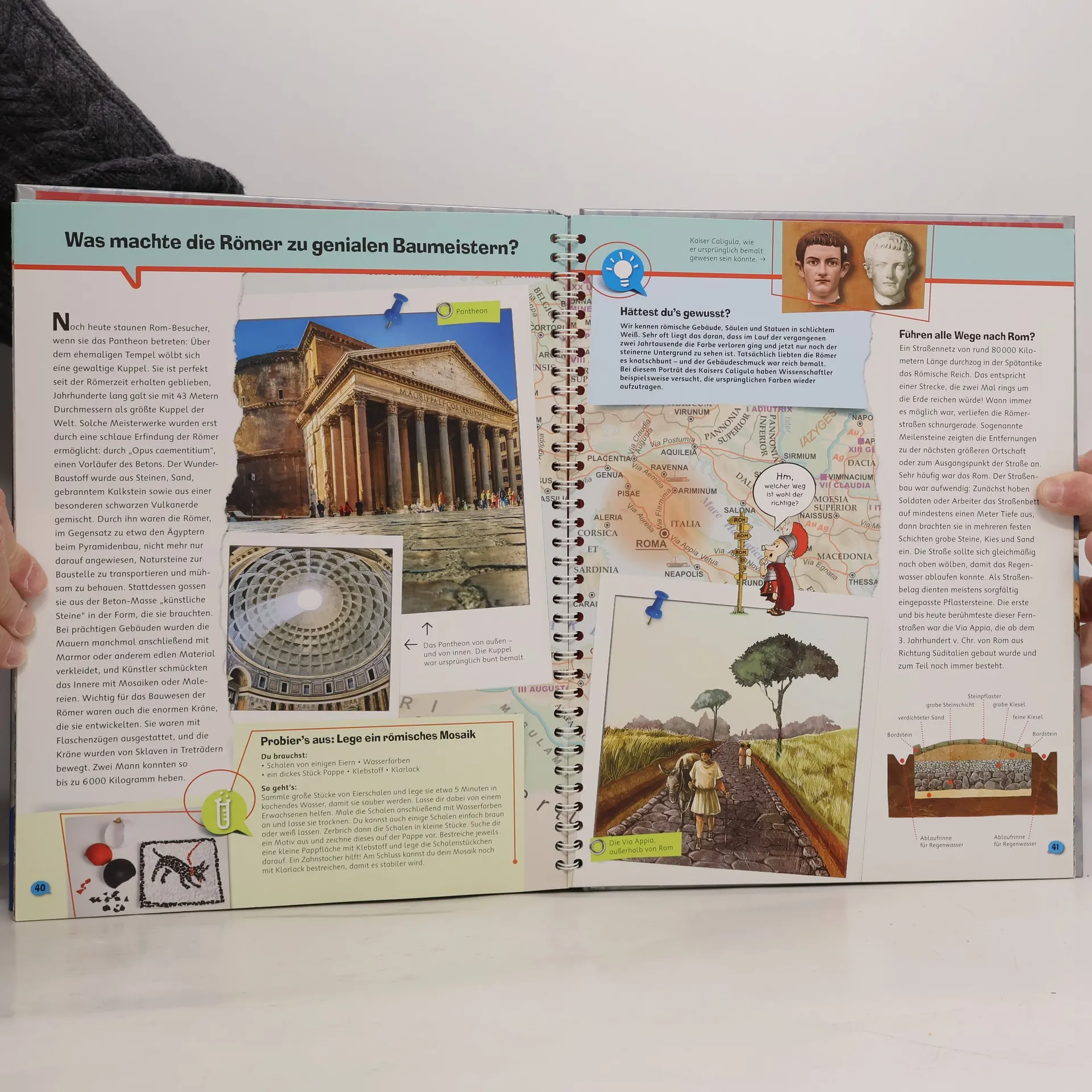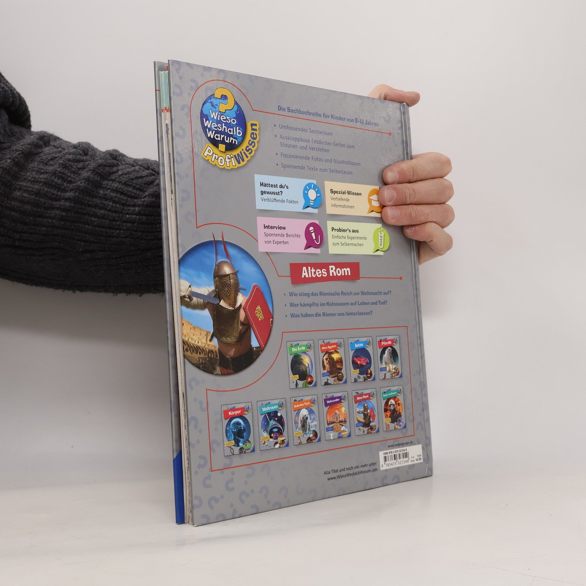 An kaum einem anderen Ort ist der Zauber einer vergangenen Epoche noch so spürbar wie in Rom. Spektakuläre antike Bauwerke wie das Kolosseum versetzen uns auch heute noch in Staunen. Dieser Band gewährt spannende Einblicke in die Geschichte und die Kultur des Römischen Reiches sowie in das alltägliche Leben im alten Rom. Einfache Experimente laden Kinder zum Mitmachen ein, etwa zum Nachkochen einer original römischen Nachspeise. Guten Appetit - oder „Bene sit tibi“, wie schon die Römer sagten. Wieso? Weshalb? Warum? ProfiWissen Die Sachbuchreihe für Kinder von 8–12 Jahren Abtauchen ins Lieblingsthema: Wann lebten die Dinos? Wie sieht es unter der Motorhaube eines Rennwagens aus? Was passiert im Weltall? Wer das ganz genau wissen möchte, ist bei Wieso? Weshalb? Warum? ProfiWissen richtig. Mit modernem Look, starken Bildern, verblüffenden Fakten und einer großen Portion Extra-Wissen! Die Texte vermitteln Sachwissen lebendig und verständlich. Witzige Comics lockern die Seiten auf. Experten lassen sich in Interviews über ihre Schulter schauen. Spezial-Wissen-Kästen bieten tiefere Einblicke. Doch hier wird nicht nur gelesen, sondern auch ausprobiert: mit vielen Anleitungen für Experimente. Und auf ausklappbaren Entdeckerseiten in jedem Band gibt es noch mehr zum Schauen und Staunen. Ein unterhaltsamer Begleiter durch die verschiedensten Wissenswelten.
