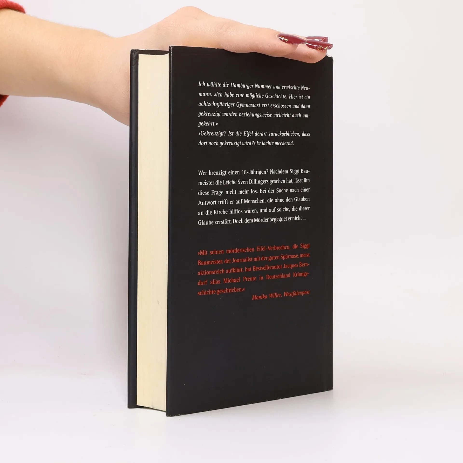 So eine Leiche haben selbst Siggi Baumeister und seine Freunde Rodenstock und Emma in der Realität noch nicht gesehen: Der 18-jährige Sven Dillinger wurde gekreuzigt. Zeitgleich wird noch eine Tote gefunden, die 23-jährige Gabriele Sikorski, abgelegt auf einem Waldweg. Bald ist klar, die beiden kannten sich. Doch warum mussten sie sterben, warum die Kreuzigung? Stecken religiöse Eiferer hinter der Tat? Baumeister taucht ein in eine Welt voller Glauben und Zweifel. Und er trifft auf Menschen, die an ihrem Glauben an diese Welt verzweifeln. Aber dem Mörder kommt der Journalist kein Stück näher - im Gegenteil: Als er im Wald eine schwer verletzte junge Frau findet, wird die Geschichte noch verworrener. Hat sie etwas mit Svens und Gabrieles Tod zu tun? Woher kommt sie und wie gelangte sie in die Eifel? Ausgerechnet eine Frankfurter Unterweltgröße hilft Baumeister, die Dinge ein wenig klarer zu sehen.