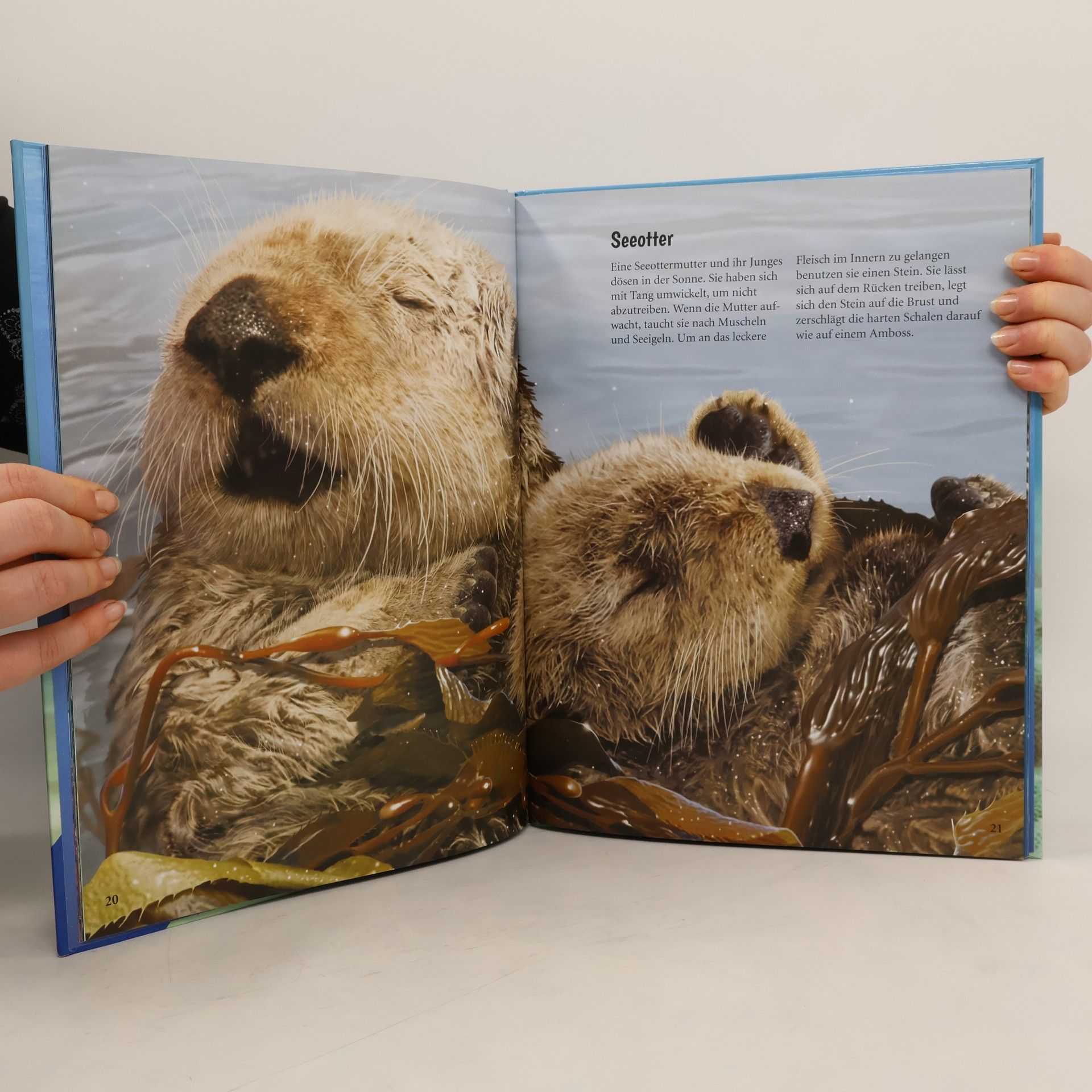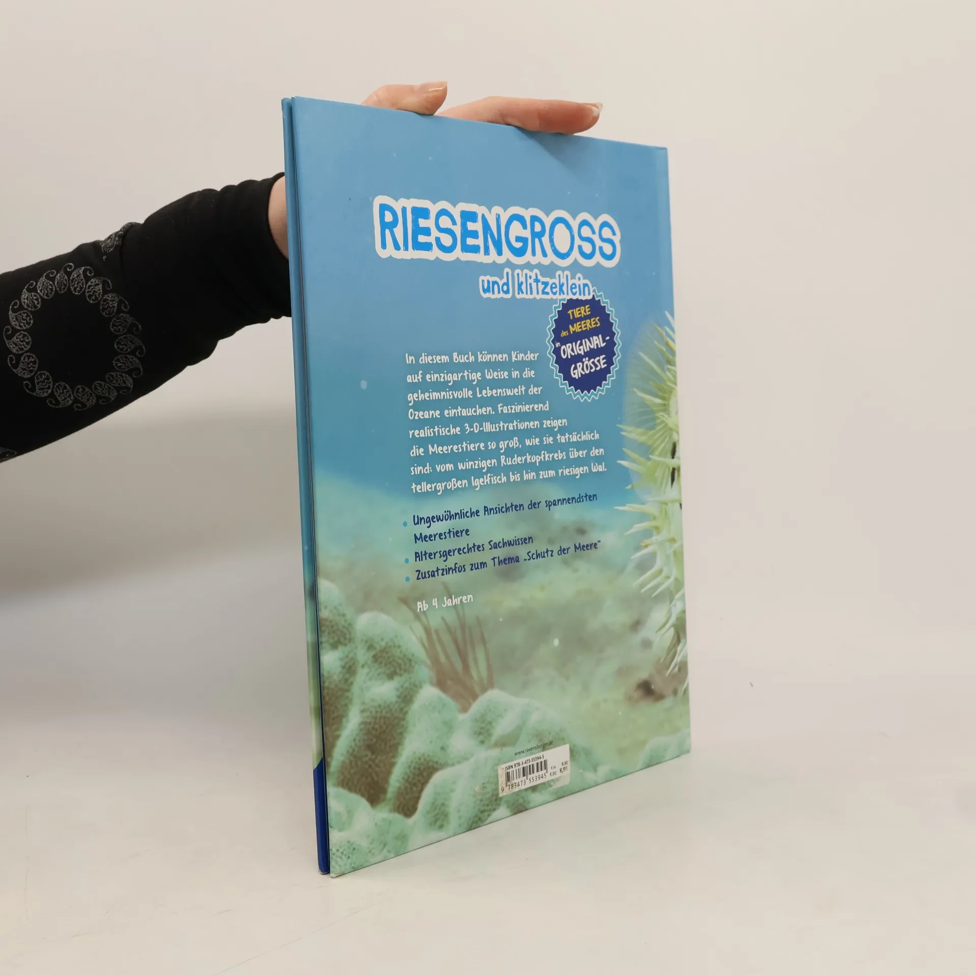 Winzige Ruderfußkrebse und riesige Blauwale tummeln sich in unseren Ozeanen. Hochwertige 3-D-Illustrationen zeigen die Meeresbewohner in Originalgröße und machen sie aus nächster Nähe erlebbar. Wenn die Kinder etwa ihre Hand neben die Abbildungen halten, erfahren sie, wie groß die Tiere wirklich sind. Kurze Infotexte vermitteln erstes Sachwissen zum artenreichen Leben unter der Wasseroberfläche.