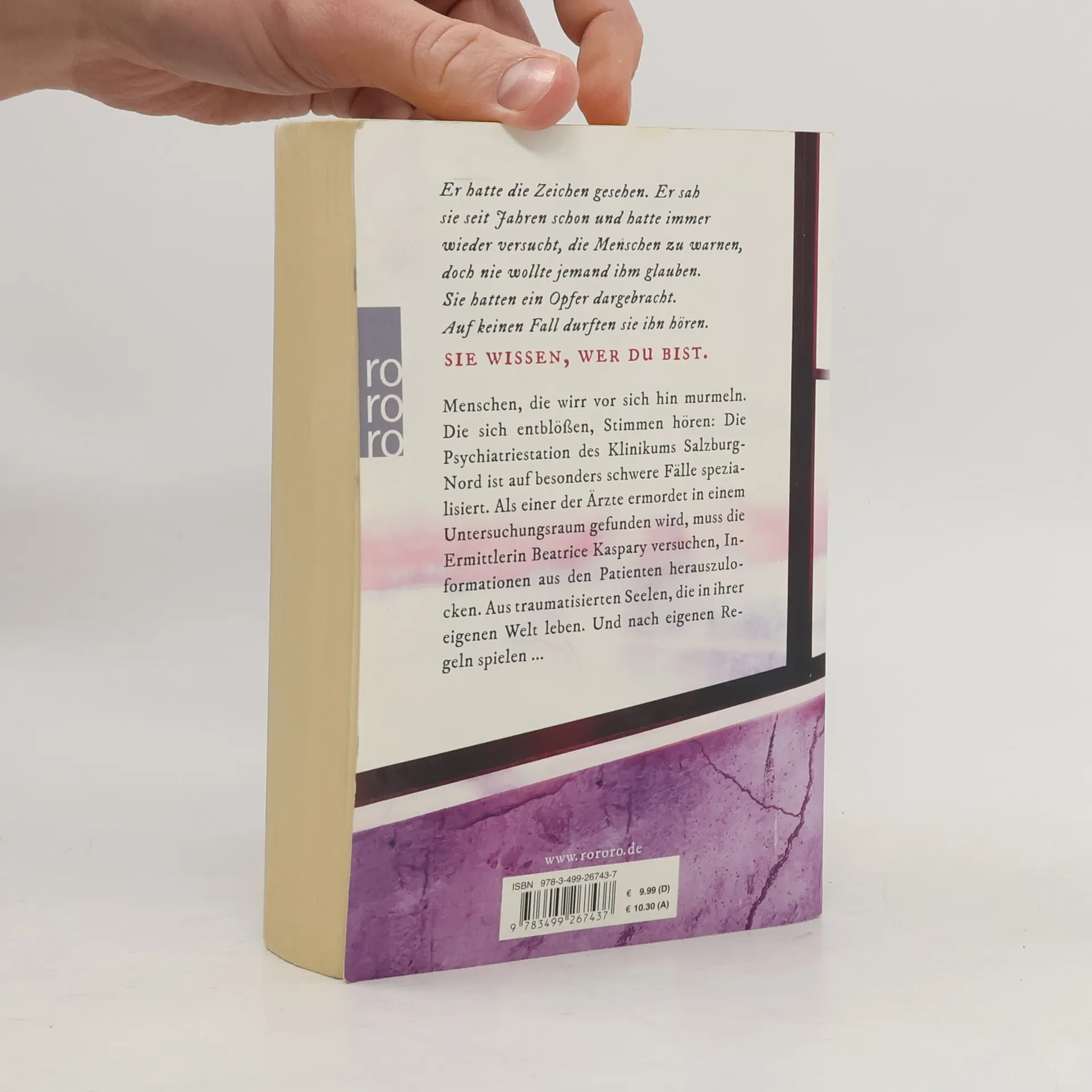 Er hatte die Zeichen gesehen. Er sah sie seit Jahren schon und hatte immer wieder versucht, die Menschen zu warnen, doch nie wollte jemand ihm glauben. Sie hatten ein Opfer dargebracht. Auf keinen Fall durften sie ihn hören. SIE WISSEN, WER DU BIST. Menschen, die wirr vor sich hin murmeln. Die sich entblößen, Stimmen hören: Die Psychiatriestation des Klinikums Salzburg-Nord ist auf besonders schwere Fälle spezialisiert. Als einer der Ärzte ermordet in einem Untersuchungsraum gefunden wird, muss die Ermittlerin Beatrice Kaspary versuchen, Informationen aus den Patienten herauszulocken. Aus traumatisierten Seelen, die in ihrer eigenen Welt leben. Und nach eigenen Regeln spielen ... Der dritte Fall des Ermittlerduos Kaspary & Wenninger