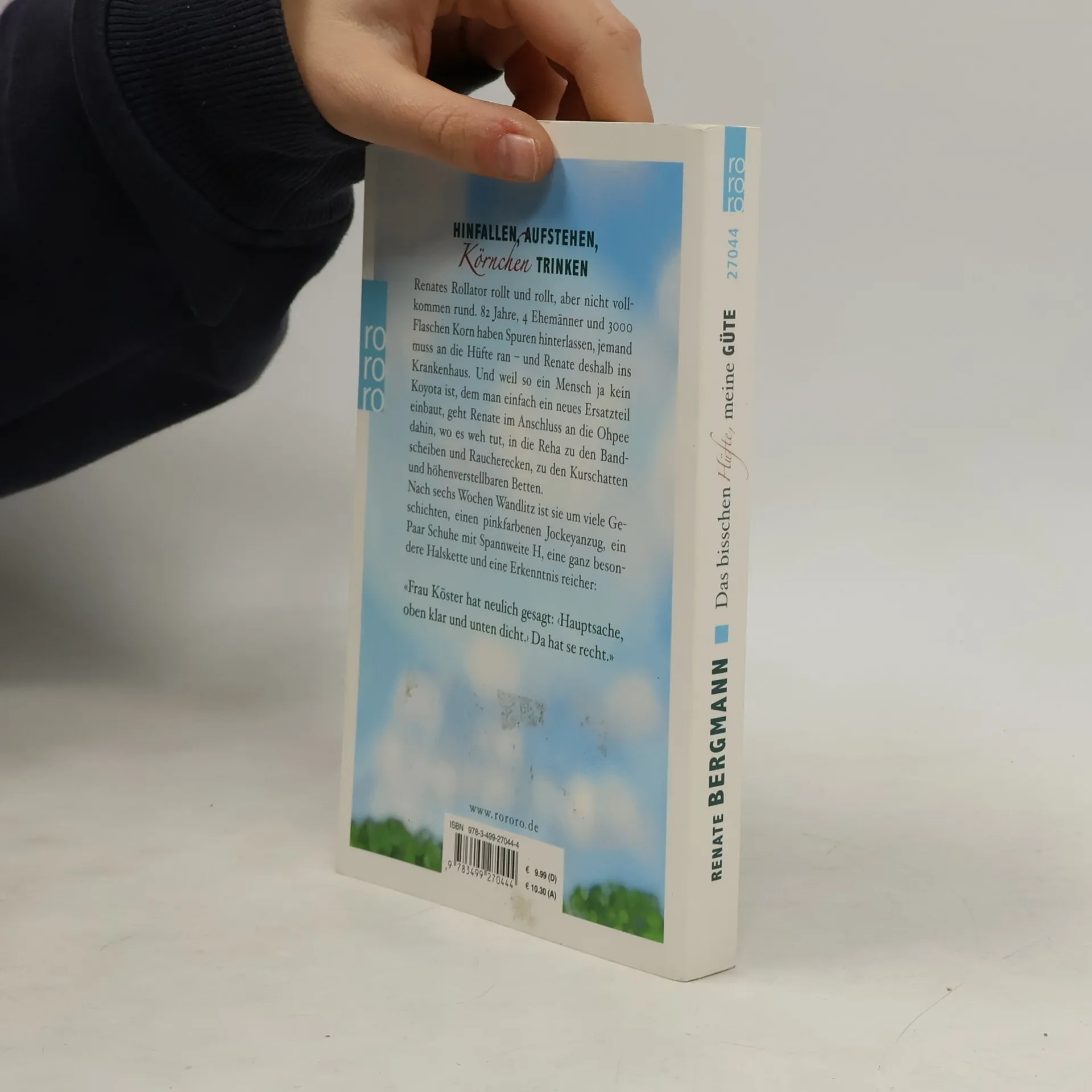 Hinfallen, Aufstehen, Körnchen trinken Renates Rollator rollt und rollt, aber nicht vollkommen rund: 82 Jahre, 4 Ehemänner und 3000 Flaschen Korn haben Spuren hinterlassen, jemand muss an die Hüfte ran – und Renate deshalb ins Krankenhaus. Und weil so ein Mensch ja kein Koyota ist, dem man einfach ein neues Ersatzteil einbaut, geht Renate im Anschluss an die Ohpee dahin, wo es wehtut, zu den Bandscheiben und Raucherecken, zu den Kurschatten und höhenverstellbaren Betten: In die Reha, die sie kurzerhand zur Kur erklärt und rockt. Nach sechs Wochen Wandlitz ist sie um viele Geschichten, einen pinkfarbenen Jockeyanzug, ein paar Schuhe mit Spannweite H, eine ganz besondere Halskette und eine Erkenntnis reicher: «Frau Köster hat neulich gesagt 'Hauptsache, oben klar und unten dicht.'»Da hat se recht.