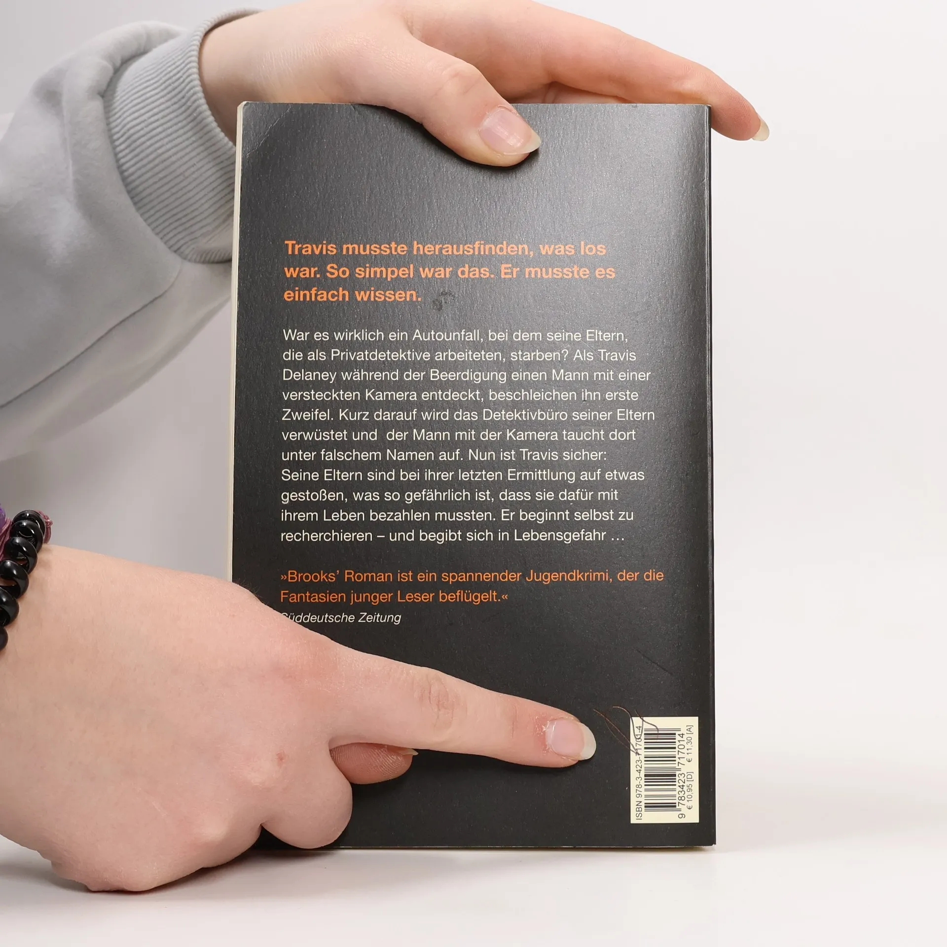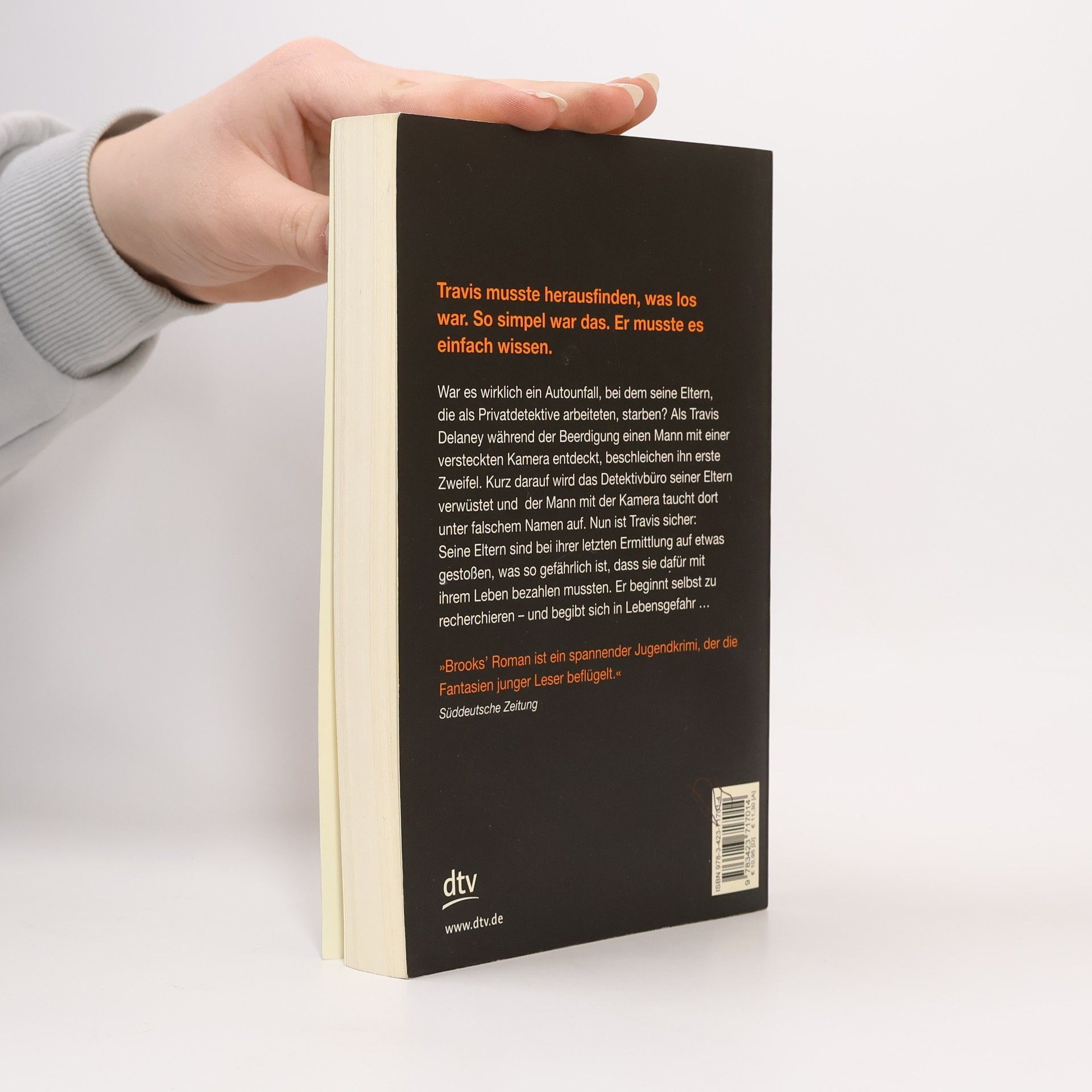 Travis Delaney, Kevin Brooks' neuer Held. War es wirklich ein Autounfall, bei dem seine Eltern, die als Detektive arbeiteten, starben? Als der dreizehnjährige Travis Delaney während der Beerdigung einen Mann mit einer versteckten Kamera erblickt, beschleichen ihn erste Zweifel. Kurz darauf wird das Detektivbüro seiner Eltern bei einem Straßenkampf verwüstet und der Mann mit der versteckten Kamera taucht dort unter falschem Namen auf. Nun ist Travis sicher: Der Tod seiner Eltern war kein Unfall. Er beginnt zu recherchieren – und kommt mysteriösen Vorfällen auf die Spur.