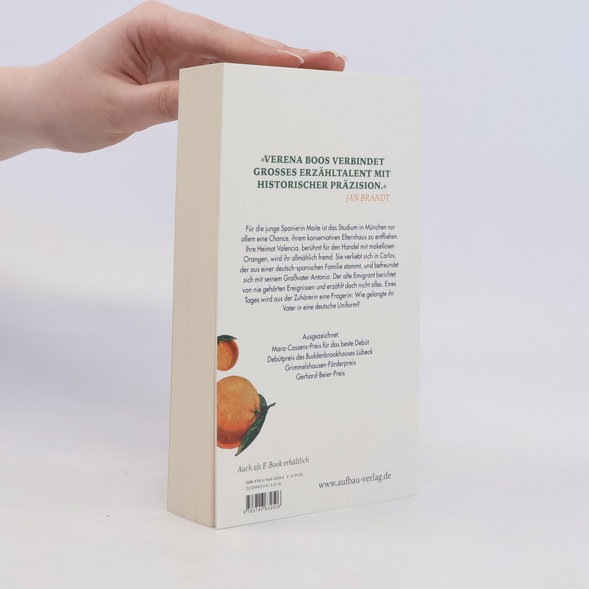 „Verena Boos verbindet großes Erzähltalent mit historischer Präzision.“ Jan Brandt Für die junge Spanierin Maite ist das Studium in München vor allem eine Chance, ihrem konservativen Elternhaus zu entfliehen. Ihre Heimat Valencia, berühmt für den Handel mit makellosen Orangen, wird ihr allmählich fremd. Sie verliebt sich in Carlos, der aus einer deutsch-spanischen Familie stammt, und befreundet sich mit seinem Großvater Antonio. Der alte Emigrant berichtet von nie gehörten Ereignissen und erzählt doch nicht alles. Eines Tages wird aus der Zuhörerin eine Fragerin: Wie gelangte ihr Vater in eine deutsche Uniform? Ausgezeichnet mit dem Mara-Cassens-Preis für das beste Debüt Debütpreis des Buddenbrookhauses Lübeck Grimmelshausen-Förderpreis Gerhard-Beier-Preis