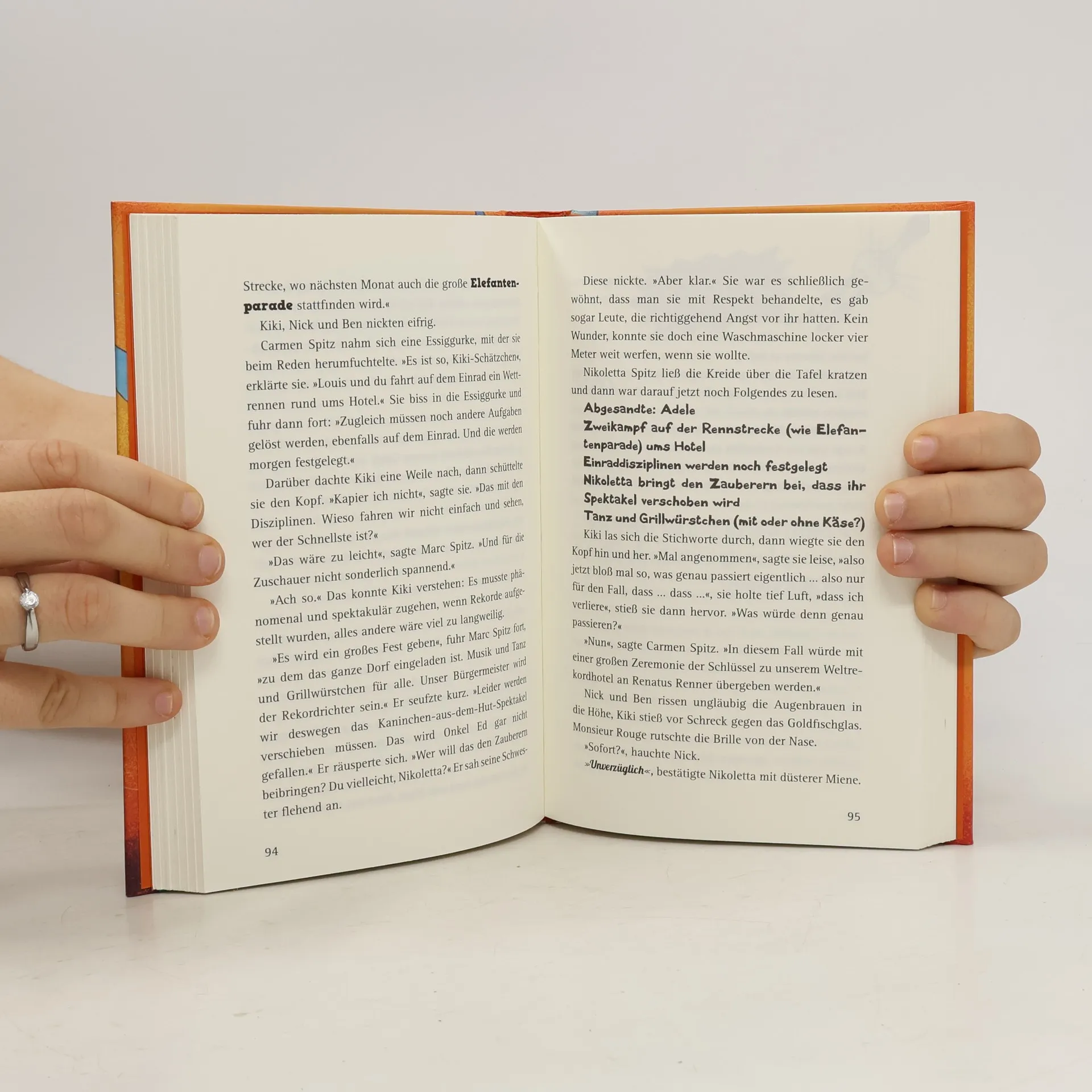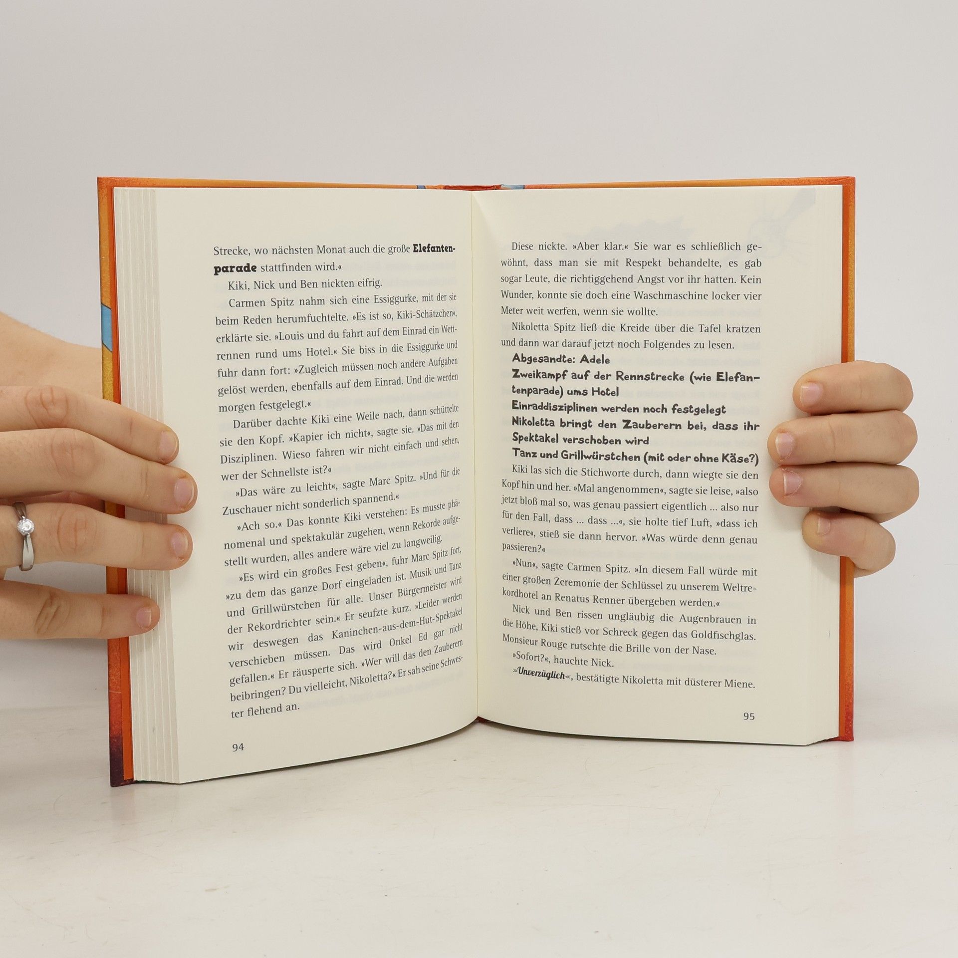 Geht nicht gibt’s nicht! Kiki Spitz liebt es, unglaubliche Dinge zu machen. Und da ist sie nicht die Einzige: Bei ihr zu Hause, im berühmten Weltrekordhotel, werden ständig wilde Wetten und Rekorde aufgestellt, etwa im Kirschkernweitspucken, Auto-Jonglieren oder Kaninchen-aus-dem-Hut-Zaubern. Doch da taucht eines Tages ein alter Feind der Familie Spitz auf: Renatus Renner fordert sie zum Wettkampf heraus und will sich das Weltrekordhotel unter den Nagel reißen. Zusammen mit ihrer Familie, ihrem besten Freund Nick und einem kurzsichtigen Goldfisch heckt Kiki einen verrückten Plan aus, um ihr Zuhause zu retten.
