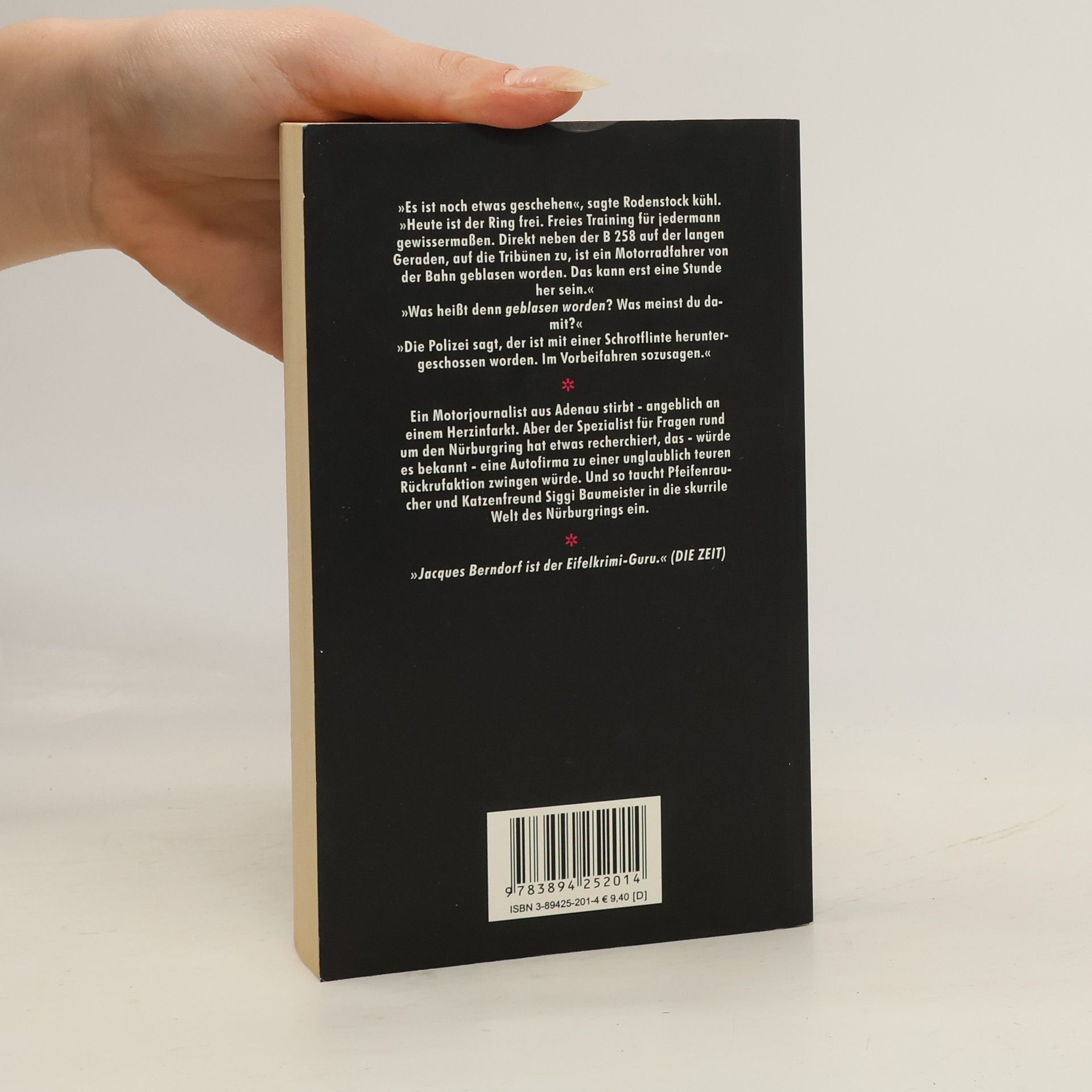 Ein Motorjournalist aus Adenau stirbt – angeblich an einem Herzinfarkt. Aber der Spezialist für Fragen rund um den Nürburgring hat etwas recherchiert, das – würde es bekannt – eine Autofirma zu einer unglaublich teuren Rückrufaktion zwingen würde. Pfeifenraucher und Katzenfreund Siggi Baumeister taucht in die skurrile Welt des Nürburgrings ein.