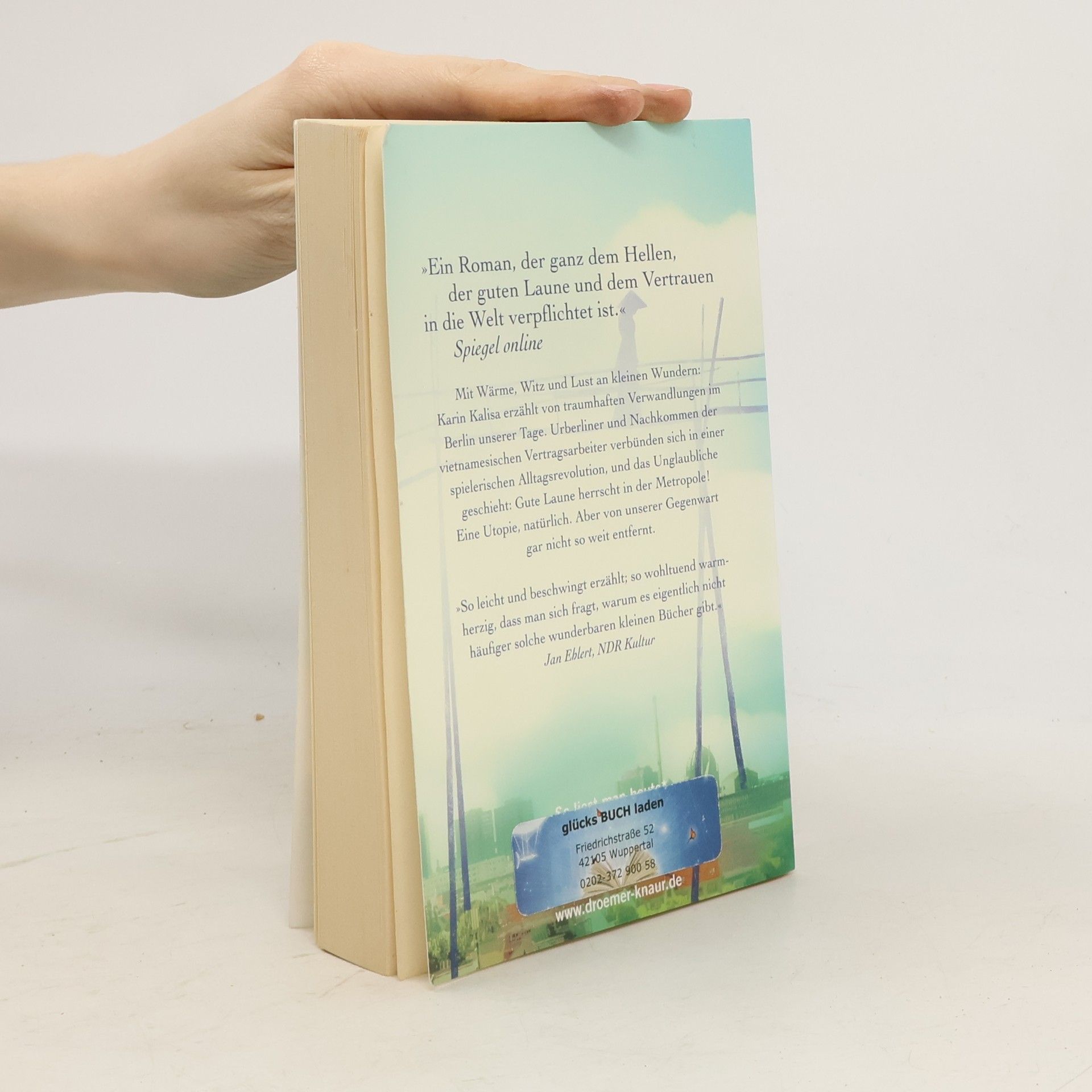 Der Bestseller von Karin Kalisa ist ein Sommer-Roman mit Tiefgang für jede Lebenslage. Mit Wärme, Witz und Lust an kleinen Wundern erzählt Karin Kalisa von traumhaften Verwandlungen im Berlin unserer Tage. Ausgehend vom kleinen vietnamesischen Laden des studierten Archäologen Sung nimmt eine Völkerverständigung der ganz eigenen Art ihren Lauf. Urberliner und Nachkommen der vietnamesischen Vertragsarbeiter verbünden sich in einer spielerischen Alltagsrevolution: Brücken aus Bambus spannen zwischen den Häusern, Parkwächter tragen Kegelhüte, auf Brachflächen grünt exotisches Gemüse, und ein Zahnarzt macht Sonntagsdienst für Patienten aus Fernost. Das Unglaubliche geschieht: Gute Laune herrscht in der Metropole! Eine Utopie, natürlich. Aber von unserer Gegenwart gar nicht so weit entfernt. „So leicht und beschwingt erzählt, so wohltuend warmherzig, dass man sich fragt, warum es eigentlich nicht häufiger solche wunderbaren kleinen Bücher gibt.“ Jan Ehlert, NRD Kultur