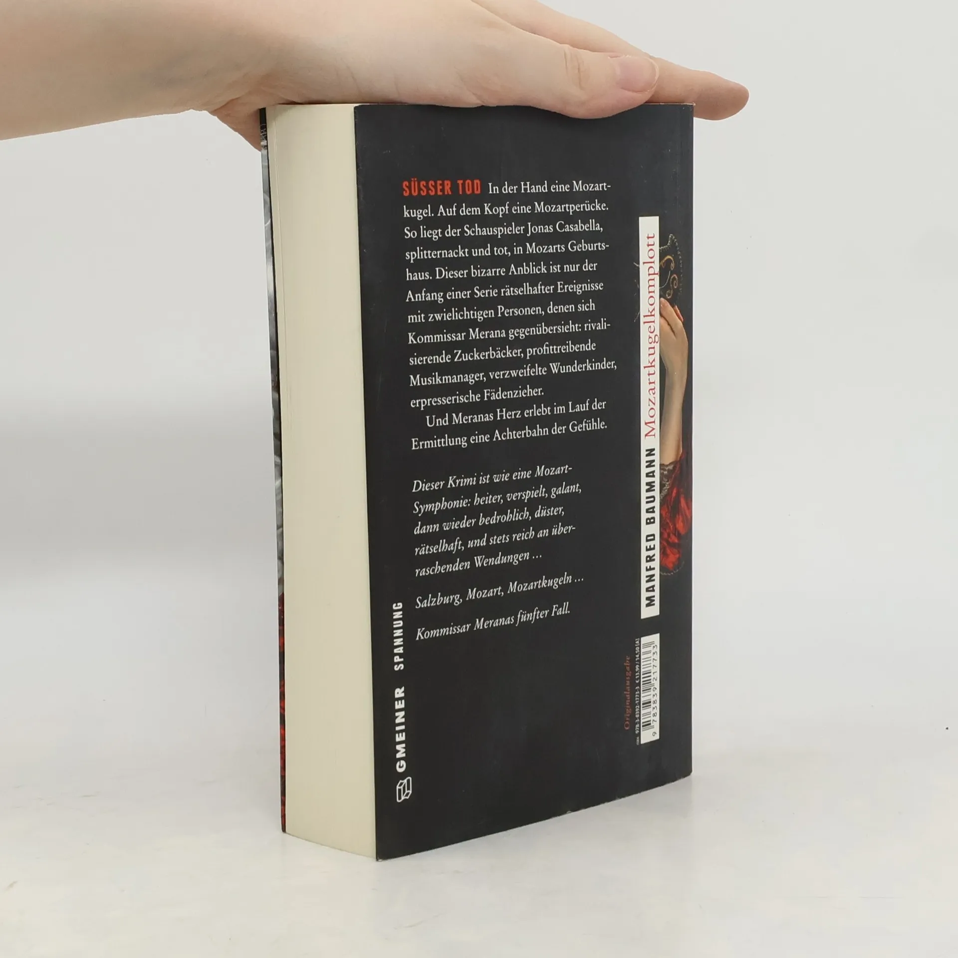 In der Hand eine Mozartkugel. Auf dem Kopf eine Mozartperücke. So liegt der Schauspieler Jonas Casabella, splitternackt und tot, in Mozarts Geburtshaus. Dieser bizarre Anblick ist nur der Anfang einer Serie rätselhafter Ereignisse mit zwielichtigen Personen, denen sich Kommissar Merana gegenübersieht: rivalisierende Zuckerbäcker, profittreibende Musikmanager, verzweifelte Wunderkinder, erpresserische Fädenzieher. Und Meranas Herz erlebt im Lauf der Ermittlung eine Achterbahn der Gefühle.