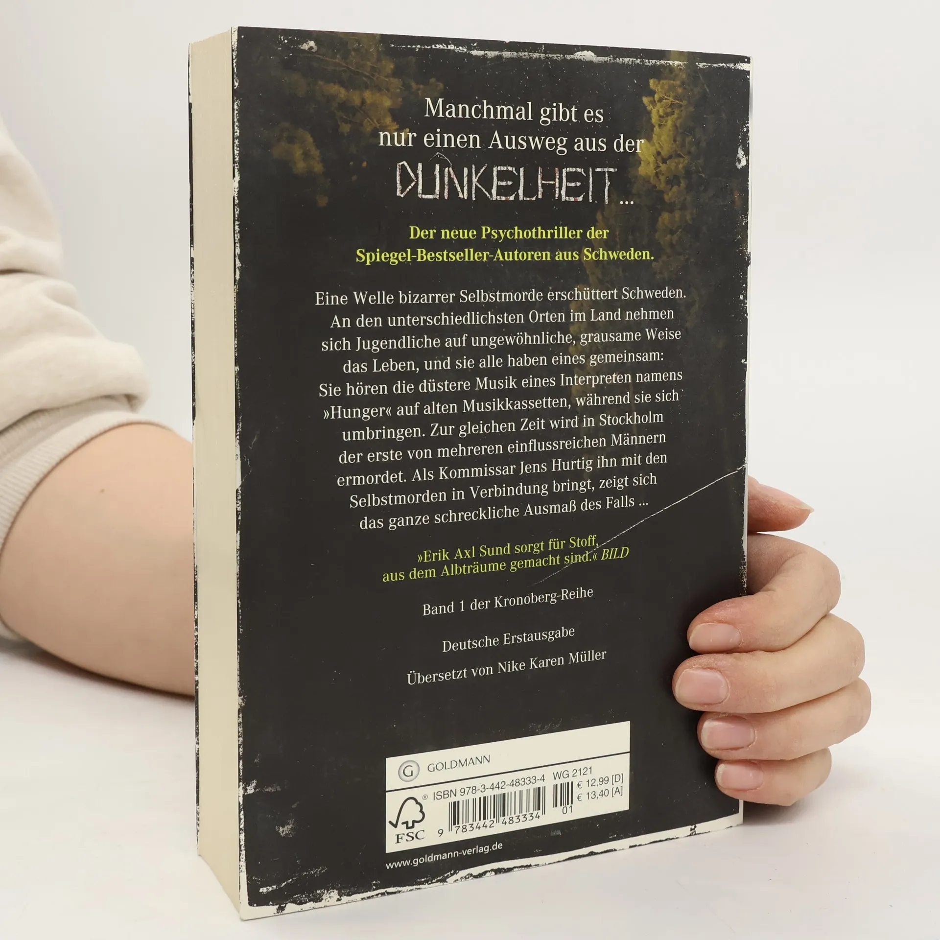 Der erste, in sich abgeschlossene Band der neuen Kronoberg-Reihe. Eine Welle bizarrer Selbstmorde erschüttert Schweden. An den unterschiedlichsten Orten im Land nehmen sich Jugendliche auf ungewöhnliche, grausame Weise das Leben, und sie alle haben eines gemeinsam: Sie hören die düstere Musik eines Interpreten namens „Hunger“ auf alten Musikkassetten, während sie sich umbringen. Zur gleichen Zeit wird in Stockholm der erste von mehreren einflussreichen Männern ermordet. Als Kommissar Jens Hurtig ihn mit den Selbstmorden in Verbindung bringt, zeigt sich das ganze schreckliche Ausmaß des Falls ... Ausstattung: eingelegtes Lesezeichen