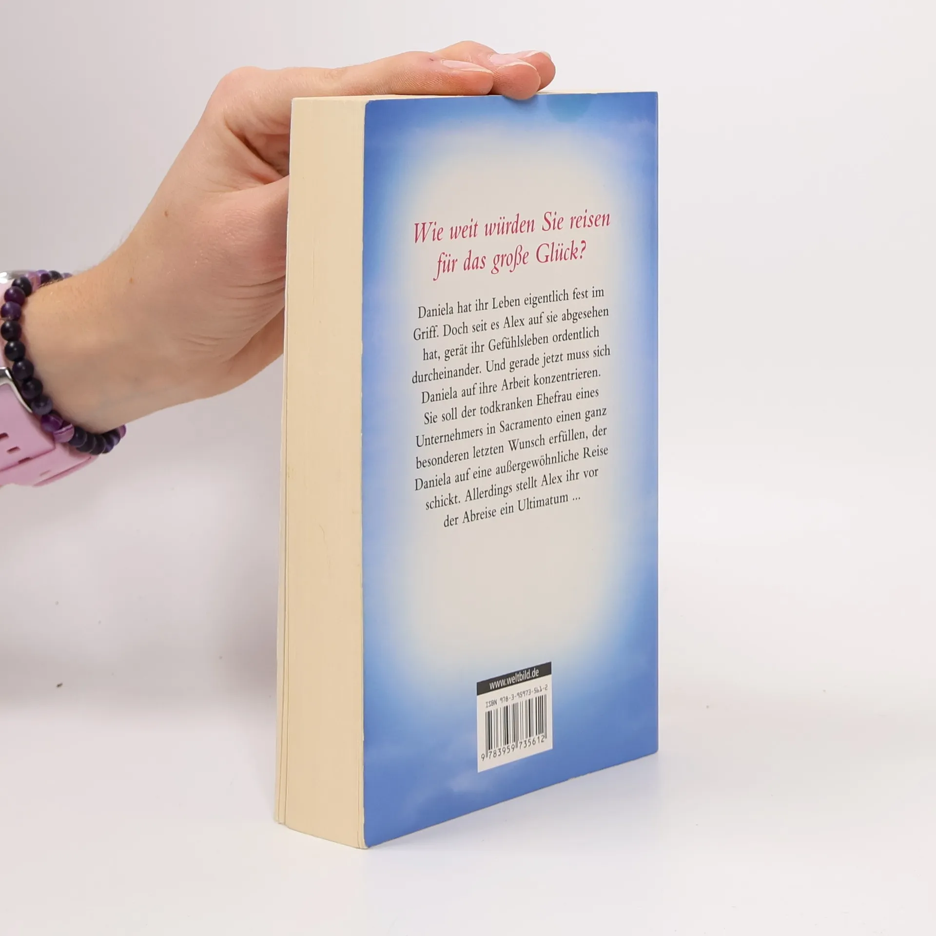 Wie weit würden Sie reisen für das große Glück? Daniela hat ihr Leben eigentlich fest im Griff. Doch seit es Alex auf sie abgesehen hat, gerät ihr Gefühlsleben ordentlich durcheinander. Und gerade jetzt muss sich Daniela auf ihre Arbeit konzentrieren. Sie soll der todkranken Ehefrau eines Unternehmers in Sacramento einen ganz besonderen letzten Wunsch erfüllen, der Daniela auf eine außergewöhnliche Reise schickt! Allerdings stellt Alex ihr vor der Abreise ein Ultimatum…