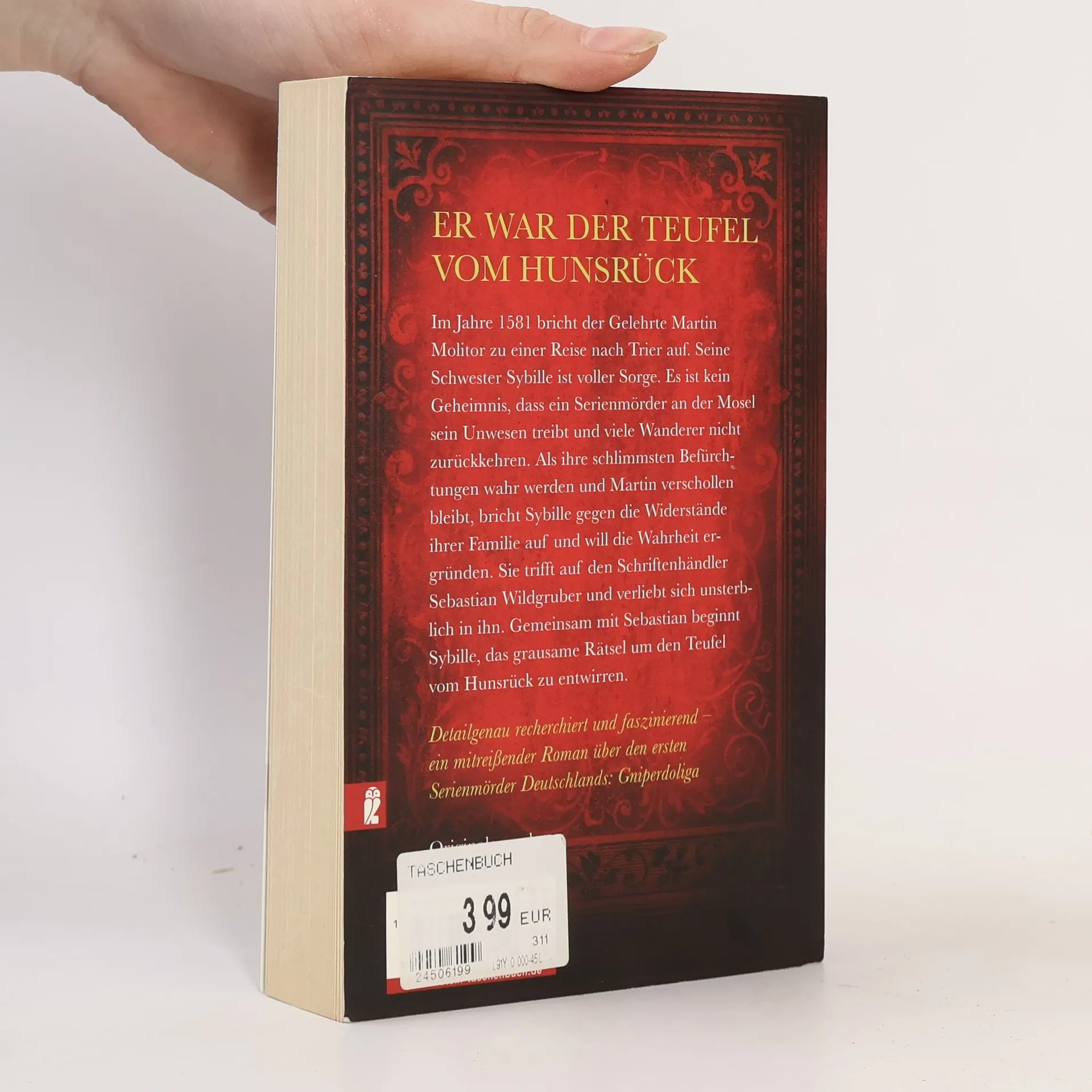 Im Jahre 1581 bricht der Gelehrte Martin Molitor zu einer Reise nach Trier auf. Seine Schwester Sybille ist voller Sorge. Es ist kein Geheimnis, dass ein Serienmörder an der Mosel sein Unwesen treibt und viele Wanderer nicht zurückkehren. Als ihre schlimmsten Befürchtungen wahr werden und Martin verschollen bleibt, bricht Sybille gegen die Widerstände ihrer Familie auf und will die Wahrheit ergründen. Sie trifft auf den Schriftenhändler Sebastian Wildgruber und verliebt sich unsterblich in ihn. Gemeinsam mit Sebastian beginnt Sybille, das grausame Rätsel um den Teufel vom Hunsrück zu entwirren.