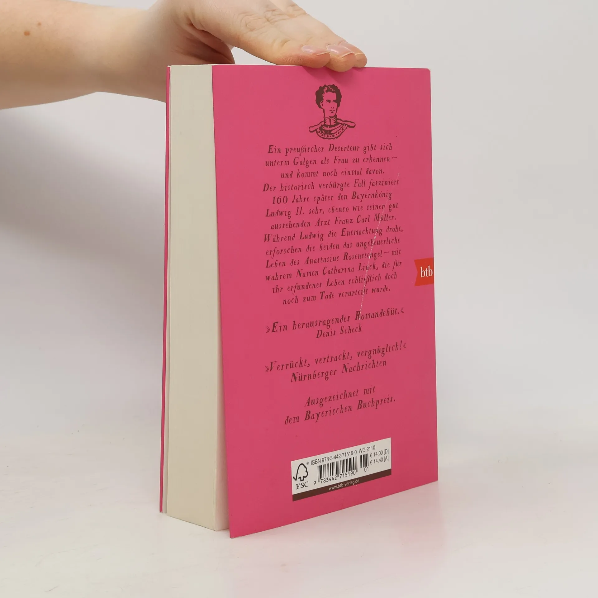 Preußische Soldaten jagen einen Deserteur. Als sie ihn überwältigen, staunen sie nicht schlecht: Der Flüchtige gibt sich als Frau zu erkennen. Der historisch verbürgte Fall interessiert 160 Jahre später den Bayernkönig Ludwig II sehr, ebenso wie seinen gut aussehenden Arzt Carl Müller. Während Ludwig die Entmachtung droht, erforschen die beiden das ungeheuerliche Leben des Anastasius Rosenstengel – mit wahrem Namen Catharina Link, die für ihr erfundenes Leben zum Tode verurteilt wurde. »Zwei Menschen mit Doppelleben bilden das Gerüst des Debütromans von Angela Steidele: Catharina Linck, die sich als Anastasius Rosenstengel Anfang des 18. Jahrhunderts in Männerkleidern durchs Leben schlug, und Ludwig II., der sich aus der Politik in die Welt der Kunst flüchtete.« SZ