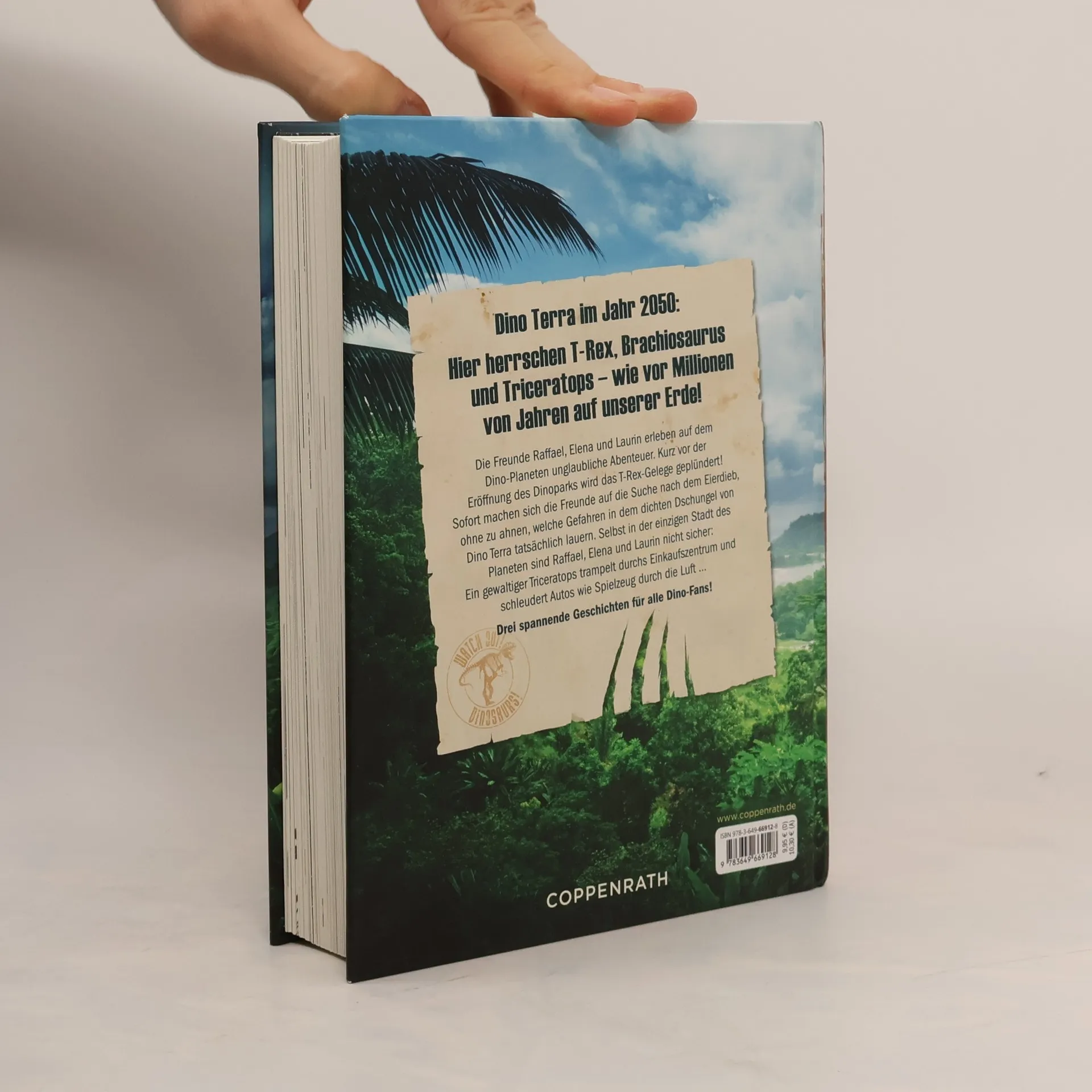 Dino Terra im Jahr 2050: Hier herrschen T-Rex, Brachiosaurus und Triceratops - wie vor Millionen von Jahren auf unserer Erde! Die Freunde Raffael, Elena und Laurin erleben auf dem Dino-Planeten unglaubliche Abenteuer. Kurz vor der Eröffnung des Dinoparks wird das T-Rex-Gelege geplündert! Ausgerechnet jetzt, wenige Tage vor der Eröffnung des Dino-Parks. Sofort machen sich die Freunde auf die Suche nach dem Eierdieb. Kurz darauf dürfen die drei ihre erste Expedition in die unerforschte Wildnis Dino Terras unternehmen, ins Reich der gewaltigen Donnerechsen! Doch sie ahnen nicht, welche Gefahren in dem dichten Dschungel tatsächlich lauern. Und auch in der einzigen Stadt des Planeten, Pax, sind Raffael, Elena und Laurin nicht sicher: Ein gewaltiger Triceratops trampelt durchs Einkaufszentrum und schleudert Autos wie Spielzeug durch die Luft …