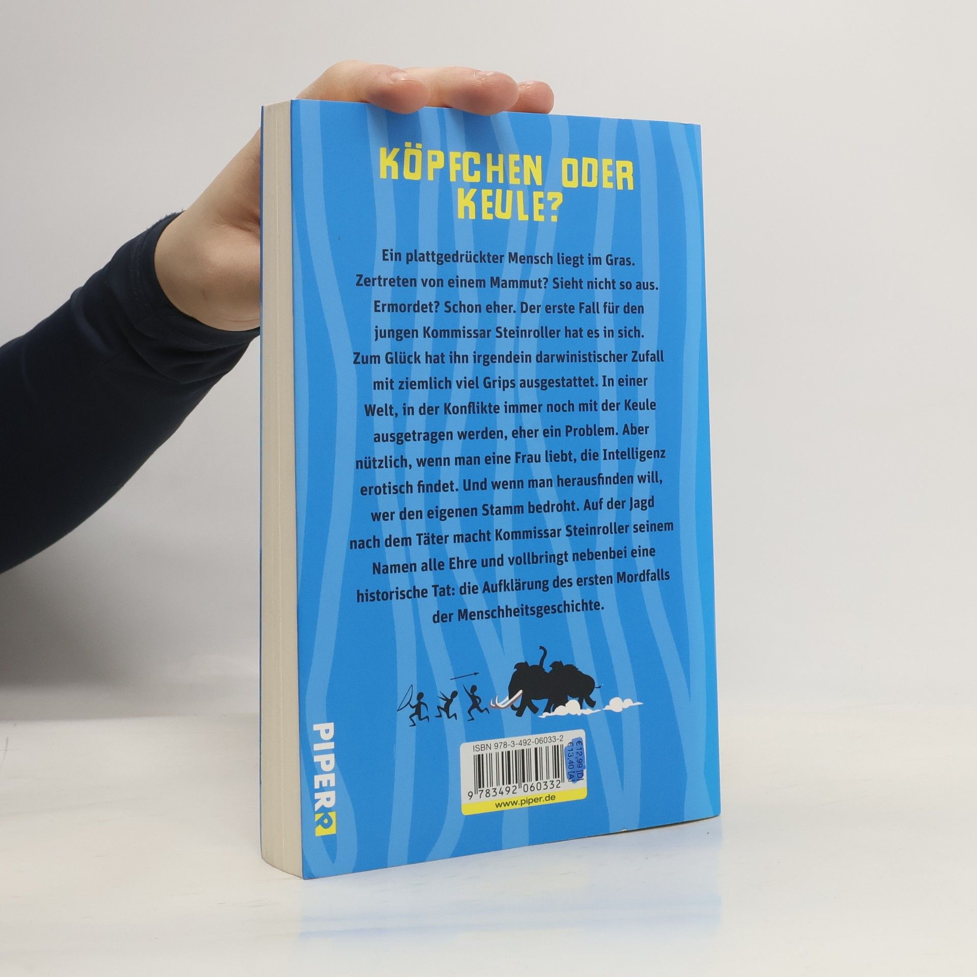 Ein ziemlich platt gedrückter Mensch liegt im Gras. Zertreten von einem Mammut? Sieht nicht so aus. Ermordet? Schon eher. Der erste Fall für den jungen Kommissar Steinroller hat es in sich. Zum Glück hat ihn irgendein Darwinistischer Zufall mit ziemlich viel Grips ausgestattet. In einer Welt, in der Konflikte immer noch mit der Keule ausgetragen werden, eher ein Problem. Aber nützlich, wenn man eine Frau liebt, die Intelligenz erotisch findet. Und wenn man herausfinden will, wer den eigenen Stamm bedroht. Auf der Jagd nach dem Täter macht Kommissar Steinroller seinem Namen alle Ehre und vollbringt nebenbei eine historische Tat: die Aufklärung des ersten Mordfalls der Menschheitsgeschichte.
