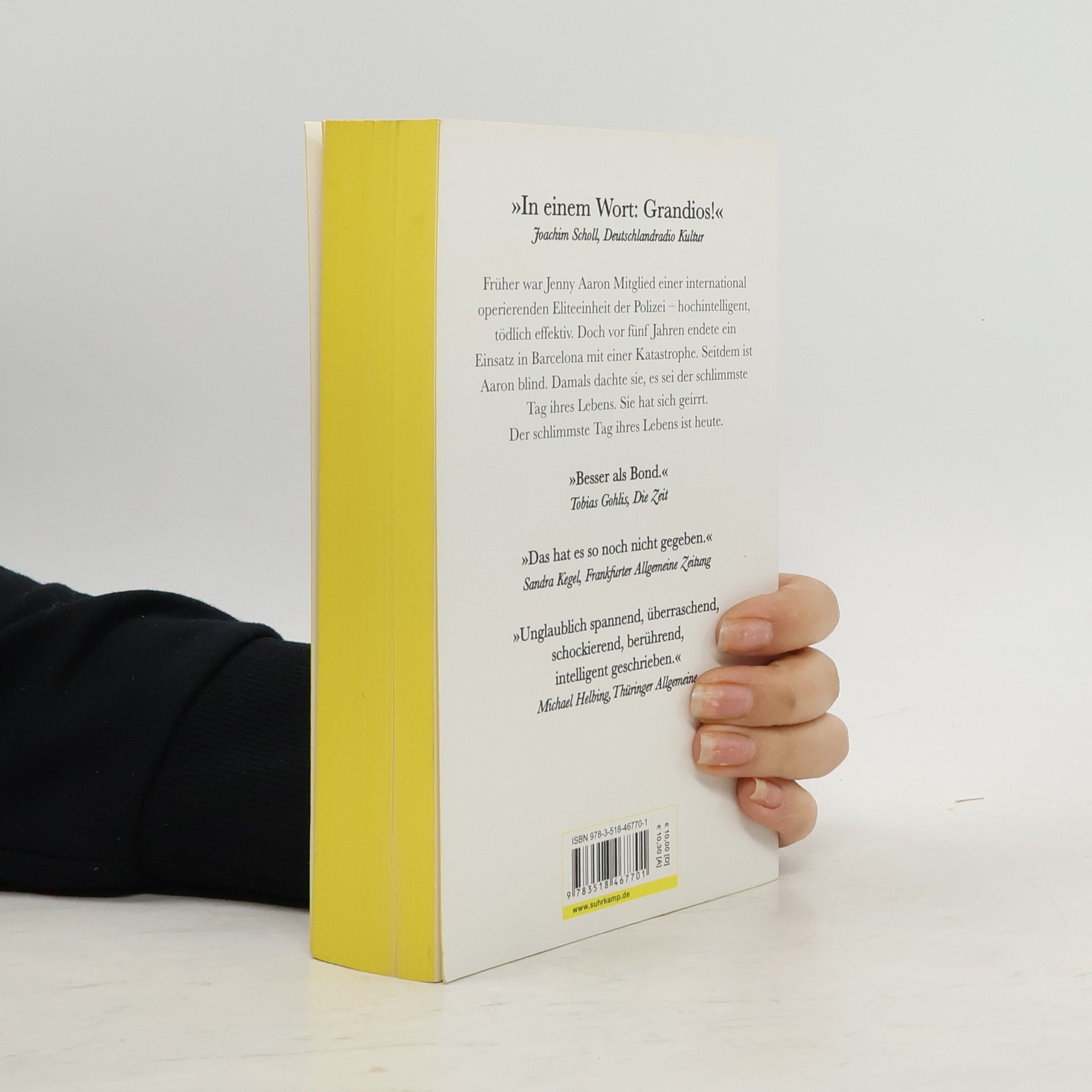 Jenny Aaron war Mitglied einer international operierenden Eliteeinheit der Polizei – hochintelligent, tödlich effektiv. Doch vor fünf Jahren endete ein Einsatz in Barcelona mit einer Katastrophe. Seitdem ist Aaron blind. Damals dachte sie, es sei der schlimmste Tag ihres Lebens. Sie hat sich geirrt. Der schlimmste Tag ihres Lebens ist heute. Seit Jenny Aaron bei einem missglückten Einsatz vor fünf Jahren das Augenlicht verlor, arbeitet sie als Verhörspezialistin beim BKA. Sie versteht es perfekt, zwischen den Worten zu tasten und das dahinter Verborgene zu erspüren. Als ihre früheren Berliner Kollegen sie bei einem Mordfall um Mithilfe bitten, wird Aaron jäh in ihre Vergangenheit gerissen: Reinhold Boenisch, für dessen Verurteilung sie als junge Polizistin sorgte, soll im Gefängnis eine Psychologin getötet haben. Aaron nimmt den Fall an und muss schon bald erkennen, dass Boenisch nur der Anfang ist – eine Schachfigur in einem Komplott. Nach und nach wird ihr offenbar, dass ihr bisheriges Leben eine einzige Vorbereitung auf die folgenden beiden Tage war. Um dieses Leben wird Aaron kämpfen müssen wie nie zuvor.