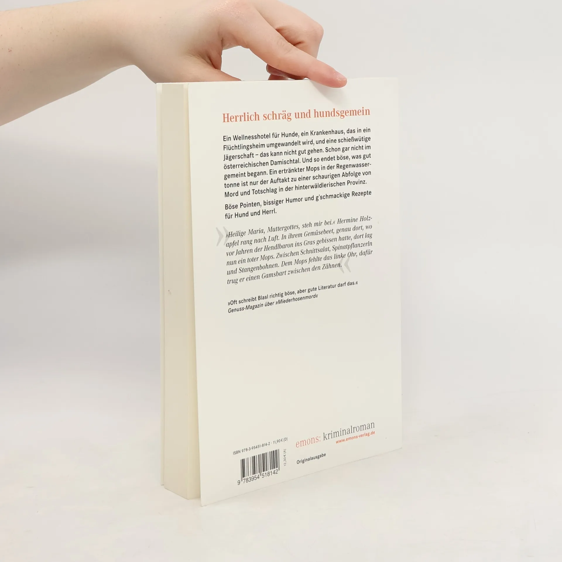Ein Wellnesshotel für Hunde, ein Krankenhaus, das in ein Flüchtlingsheim umgewandelt wird, und eine schießwütige Jägerschaft – das kann nicht gut gehen. Schon gar nicht im österreichischen Damischtal. Und so endet böse, was gut gemeint begann. Ein ertränkter Mops in der Regenwassertonne ist nur der Auftakt zu einer schaurigen Abfolge von Mord und Totschlag in der hinterwäldlerischen Provinz. Böse Pointen, bissiger Humor und g’schmackige Rezepte für Hund und Herrl.