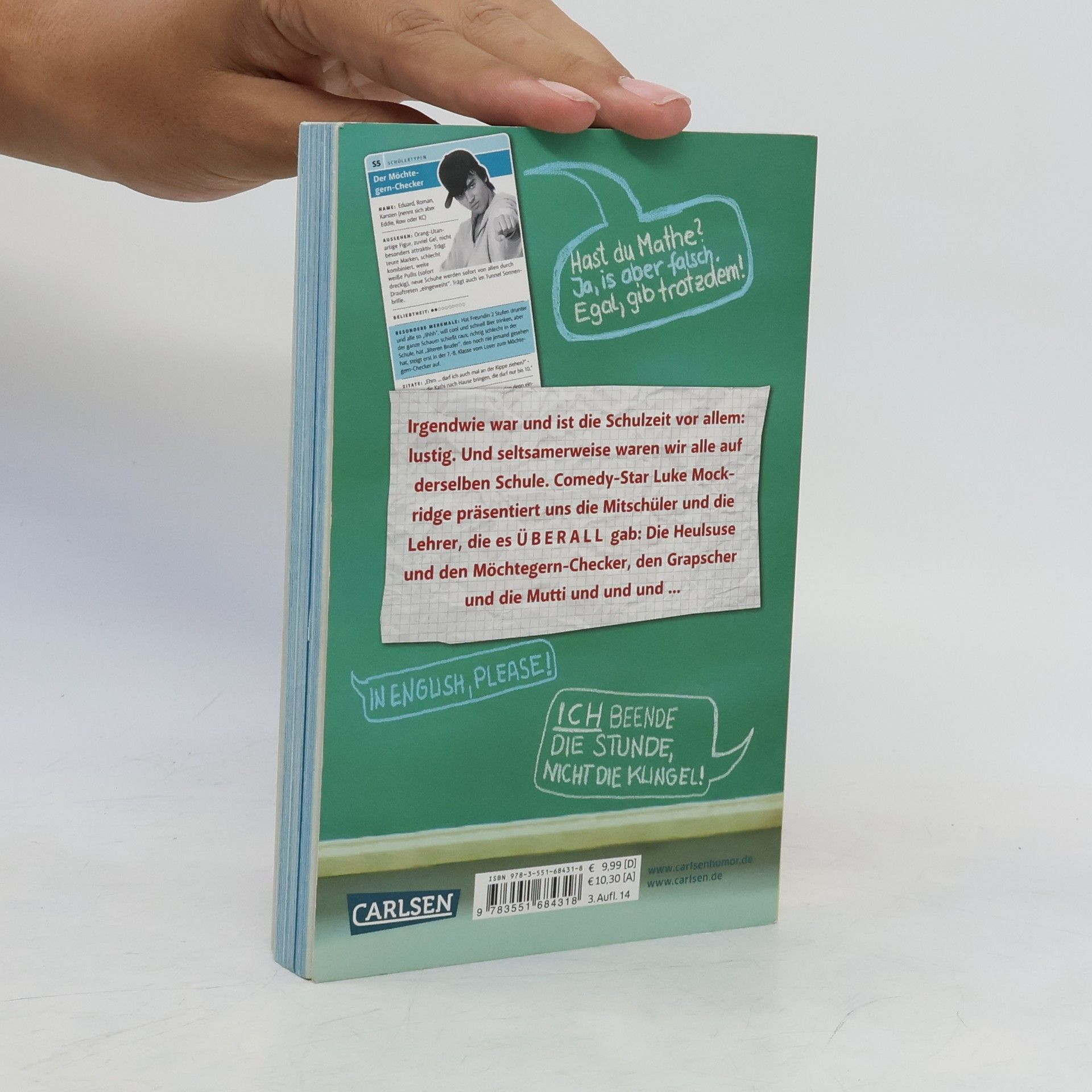 Luke Mockridge, 24-jähriger Shooting-Star der deutschen Comedy, wirft einen höchst amüsanten Blick zurück auf die Schulzeit, in dem sich jeder wiederfindet: Die verschiedenen Lehrer- und Schülertypen werden ebenso porträtiert wie klassische Schulsituationen – von der fragwürdigen „Hilfestellung“ im Sportunterricht über die Rückgabe der Mathearbeiten bis zu peinlichen Erlebnissen auf Klassenfahrten.