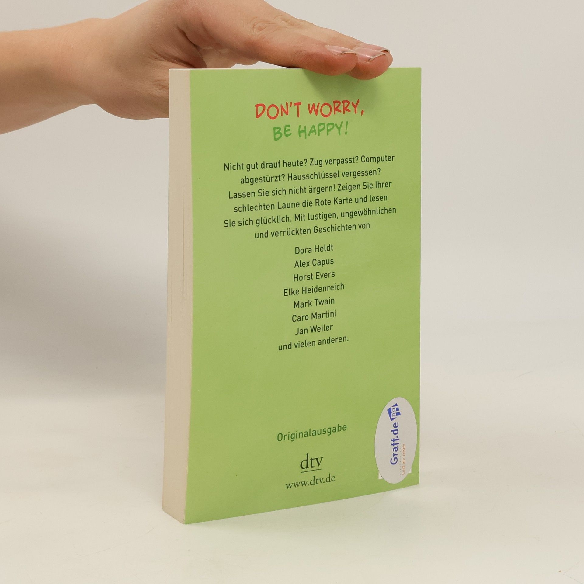 Don't worry, be happy Es gibt solche Tage: Da steht man schon mit dem falschen Bein auf, dann fährt einem der Bus vor der Nase weg, man hat Zahnschmerzen wie verrückt oder wird von der Freundin versetzt – alles geht schief, und man könnte vor Wut nur noch heulen. Es gibt solche Tage, da möchte man am liebsten im Bett bleiben. Tun Sie’s doch einfach! Dann haben Sie Zeit, die Gute-Laune-Geschichten zu lesen. Und Sie werden sehen: Alles wird gut. Hier sind die lustigsten, verrücktesten, ungewöhnlichsten Geschichten versammelt, die Sie unterhalten, die Sorgen vertreiben und Ihnen wieder ein Lächeln ins Gesicht zaubern.