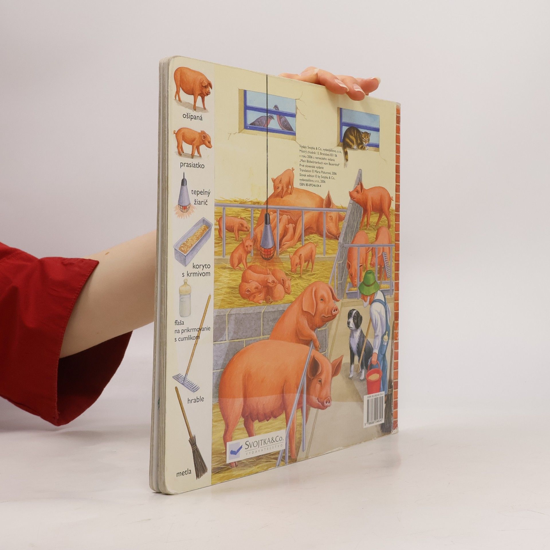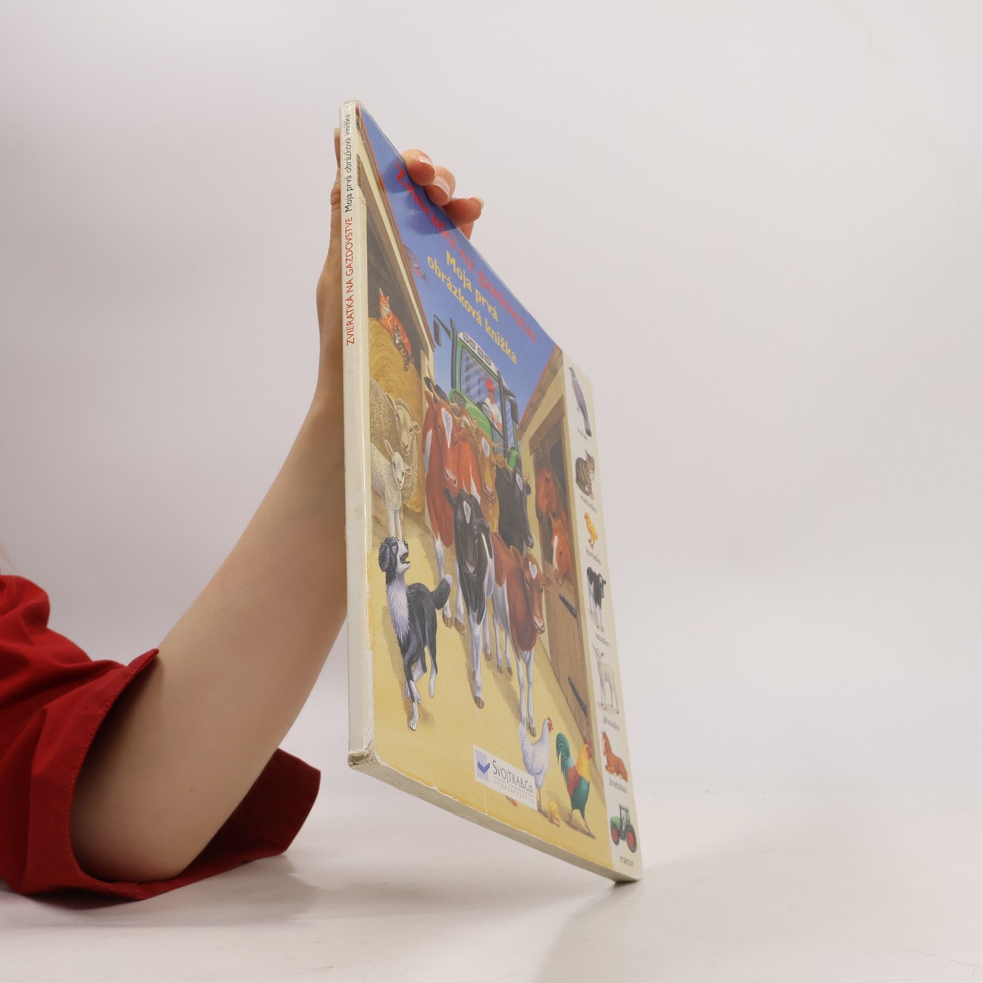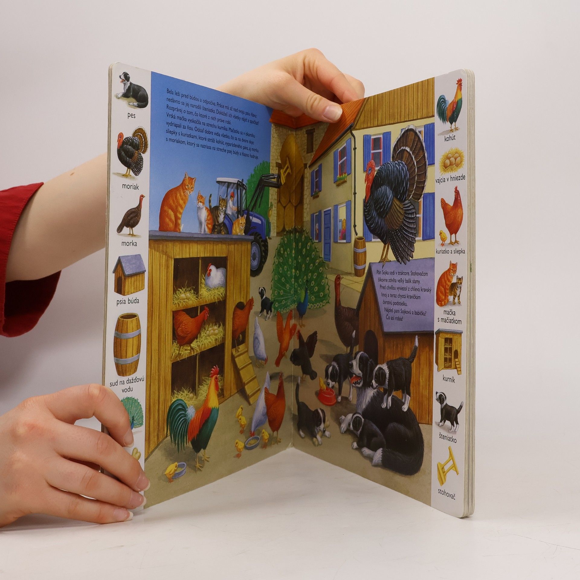 Ako sa volajú, kde bývajú a čo jedia domáce zvieratká? Čo všetko potrebujeme pri práci na gazdovstve? Akú zeleninu pestujeme doma? Odpovede na tieto otázky nájdete v leporele, ktoré je doplnené zrozumiteľnými pôvabnými ilustráciami. Bočné ilustrácie pomenúvajú zvieratá, rastliny a predmety, ktoré nájdete na danej strane. Sprievodný text vysvetľuje i kladie otázky, ktoré podnecujú otvoriť túto knižku znova a znova.