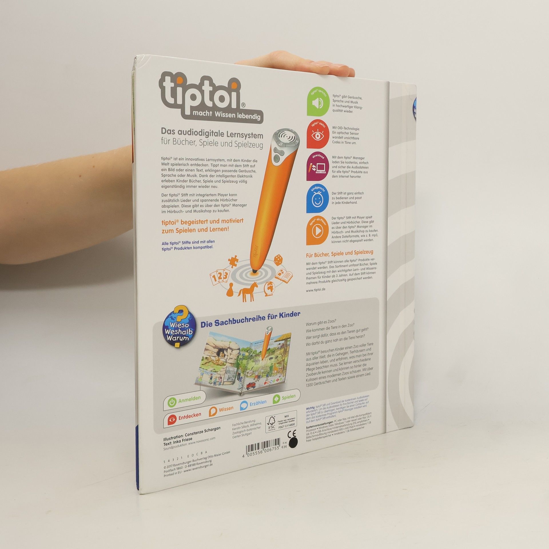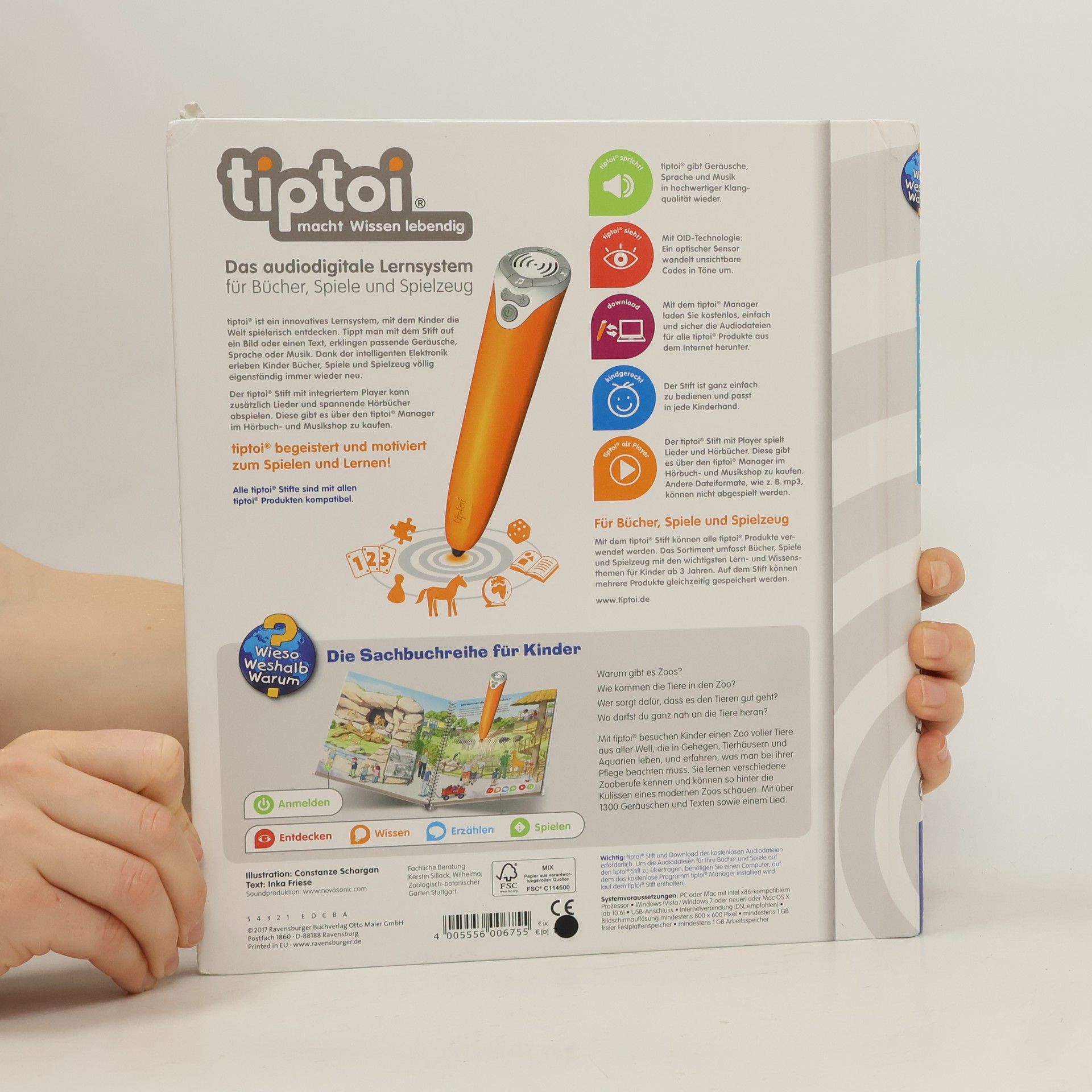 Willkommen im Zoo! Alle Kinder gehen gern in den Zoo. Sie lieben es, Tiere zu beobachten und haben viele Fragen: Wie kommen die Tiere in den Zoo? Was fressen sie? Und wie viel Platz brauchen sie? Bei einem Spaziergang durch Gehege, Tierhäuser und ein großes Aquarium lernen Kinder unzählige Tierarten sowie Berufe wie Tierpfleger, Zoodirektor, Tierarzt und Techniker kennen. Dabei sensibilisiert das Buch auch für eine artgerechte Haltung. Was macht der Traktor auf dem Feld? Wann kommt die Feuerwehr? Wie groß wird ein Pony? Die interaktive Sachbuchreihe tiptoi Wieso? Weshalb? Warum? beantwortet wichtige Kinderfragen auf Augenhöhe. Auf den liebevoll illustrierten Seiten tauchen die Kinder in eine Welt ein, die durch zahlreiche authentische Geräusche lebendig wird. Das Sachwissen wird altersgerecht erklärt und ist fachlich geprüft. Die Kinder können sich dank der einfachen und intuitiven Nutzung mit dem tiptoi-Stift das Wissen selbst erschließen. Sie lernen, Zusammenhänge zu begreifen und erfahren spannende Informationen über ihren Alltag und ihre Umwelt. Tolle Geschichten, Lieder und unterhaltsame Spiele laden dabei immer wieder zum selbstständigen Entdecken und Erforschen ein. tiptoi-Stift nicht enthalten. Muss separat erworben werden.
