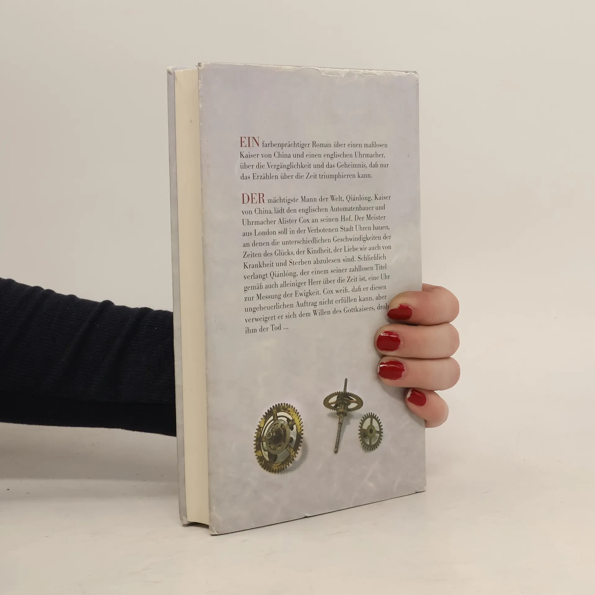 Ein farbenprächtiger Roman über einen maßlosen Kaiser von China und einen englischen Uhrmacher, über die Vergänglichkeit und das Geheimnis, dass nur das Erzählen über die Zeit triumphieren kann. Der englische Uhrmacher Alister Cox folgt mit drei Gefährten einer Einladung des Kaisers von China, um in der Verbotenen Stadt Uhren nach den Vorstellungen und Träumen eines allmächtigen Gottmenschen zu bauen. An einem Hof, der von Maßlosigkeit, zeremonieller Pracht und Angst beherrscht wird, soll der Meister aus London Uhren erschaffen, die das Verfliegen des menschlichen Lebens anzeigen - von den scheinbar endlosen Tagen eines Kindes bis zu denen eines zum Tode Verurteilten. Und schließlich fordert der Kaiser ein Uhrwerk, das die Dauer der Ewigkeit messen soll.