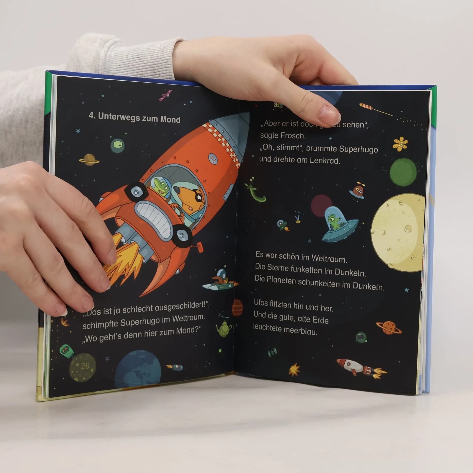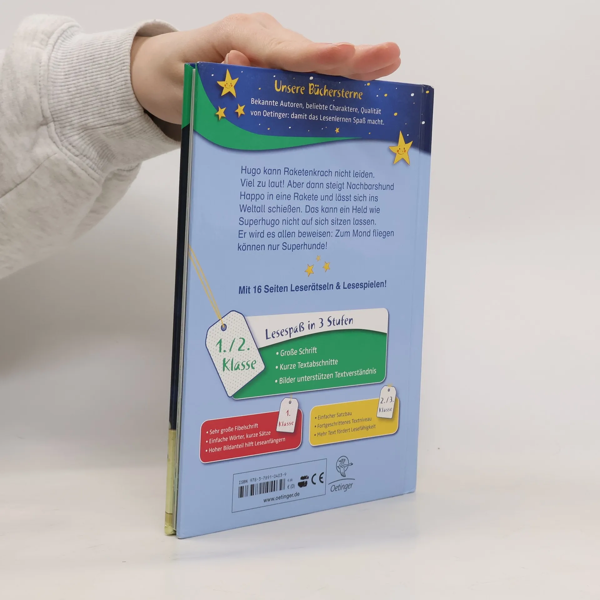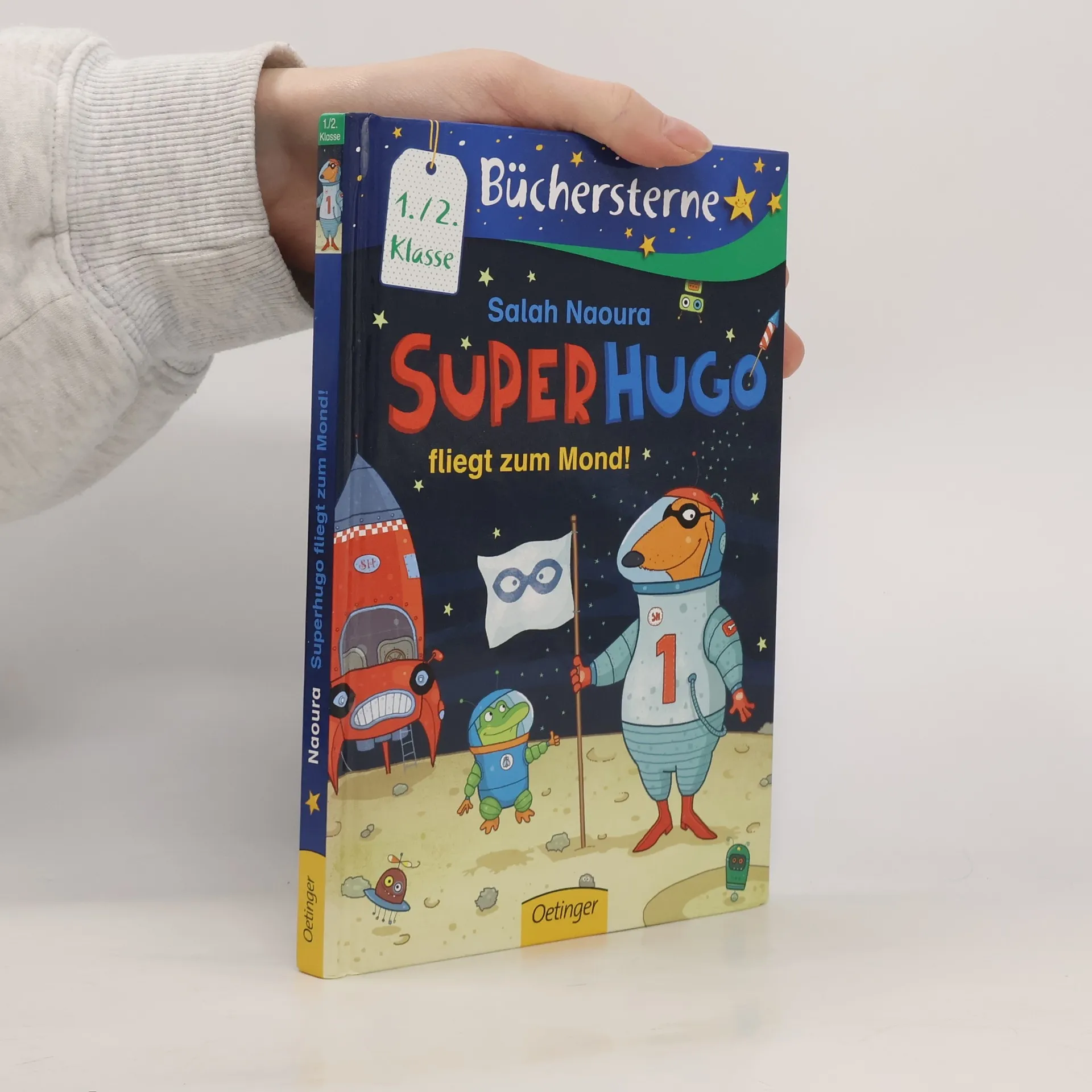 Wettrennen im Weltall! Hugo kann Feuerwerksraketen nicht ausstehen! Zu blöd, dass der doofe Nachbarshund Happo ganz furchtlos in eine Rakete steigt und sich kurzerhand in den Weltraum schießen lässt. Unverschämt! Als dann auch noch Hugos Freund Frosch seinen Bruder Quaki vermisst (der mit in Happos Rakete sitzt) wird das Superauto ruckzuck zur Rakete umgebaut. Um Quaki zu retten, liefern sich Superhugo und Frosch mit Happo ein krachend lautes Wettrennen quer durchs All. Denn: Zum Mond fliegen, das können nur echte Superhunde. Cleverer Humor und lustige, liebenswerte Illustrationen machen Superhugo zum Lesespaß für Anfänger und Fortgeschrittene. Band 1 der Reihe wurde zum besten Erstlesebuch 2015 gewählt. Lesen lernen mit „Büchersterne“ für die 1./2. Klasse: Große Schrift Kurze Textabschnitte Viele Bilder, die das Textverständnis von Leseanfängern unterstützen 16 Seiten Leserätsel und Lesespiele im Anhang Bekannte Autoren und beliebte Charaktere, damit das Lesenlernen Spaß macht Gelistet bei Antolin.