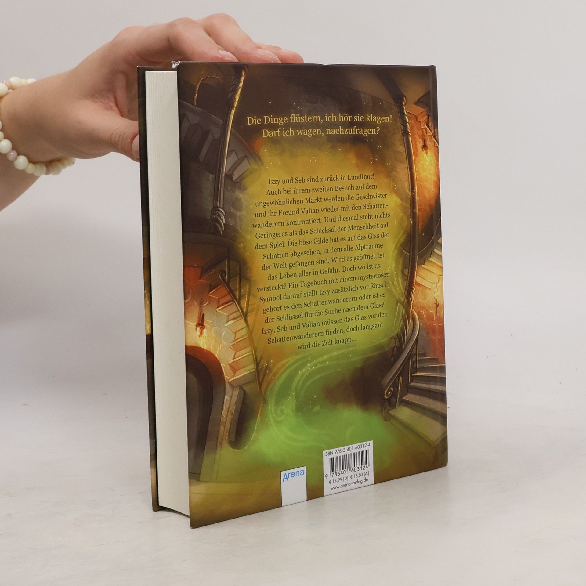 Die Dinge flüstern, ich hör sie klagen! Darf ich wagen, nachzufragen? Izzy und Seb sind zurück in Lundinor! Auch bei ihrem zweiten Besuch auf dem ungewöhnlichen Markt werden die Geschwister und ihr Freund Valian wieder mit den Schattenwanderern konfrontiert. Und diesmal steht nichts Geringeres als das Schicksal der Menschheit auf dem Spiel. Die böse Gilde hat es auf das Glas der Schatten abgesehen, in dem alle Alpträume der Welt gefangen sind. Wird es geöffnet, ist das Leben aller in Gefahr. Doch wo ist es versteckt? Ein Tagebuch mit einem mysteriösen Symbol darauf stellt Izzy zusätzlich vor Rätsel: gehört es den Schattenwanderern oder ist es der Schlüssel für die Suche nach dem Glas? Izzy, Seb und Valian müssen das Glas vor den Schattenwanderern finden, doch langsam wird die Zeit knapp…