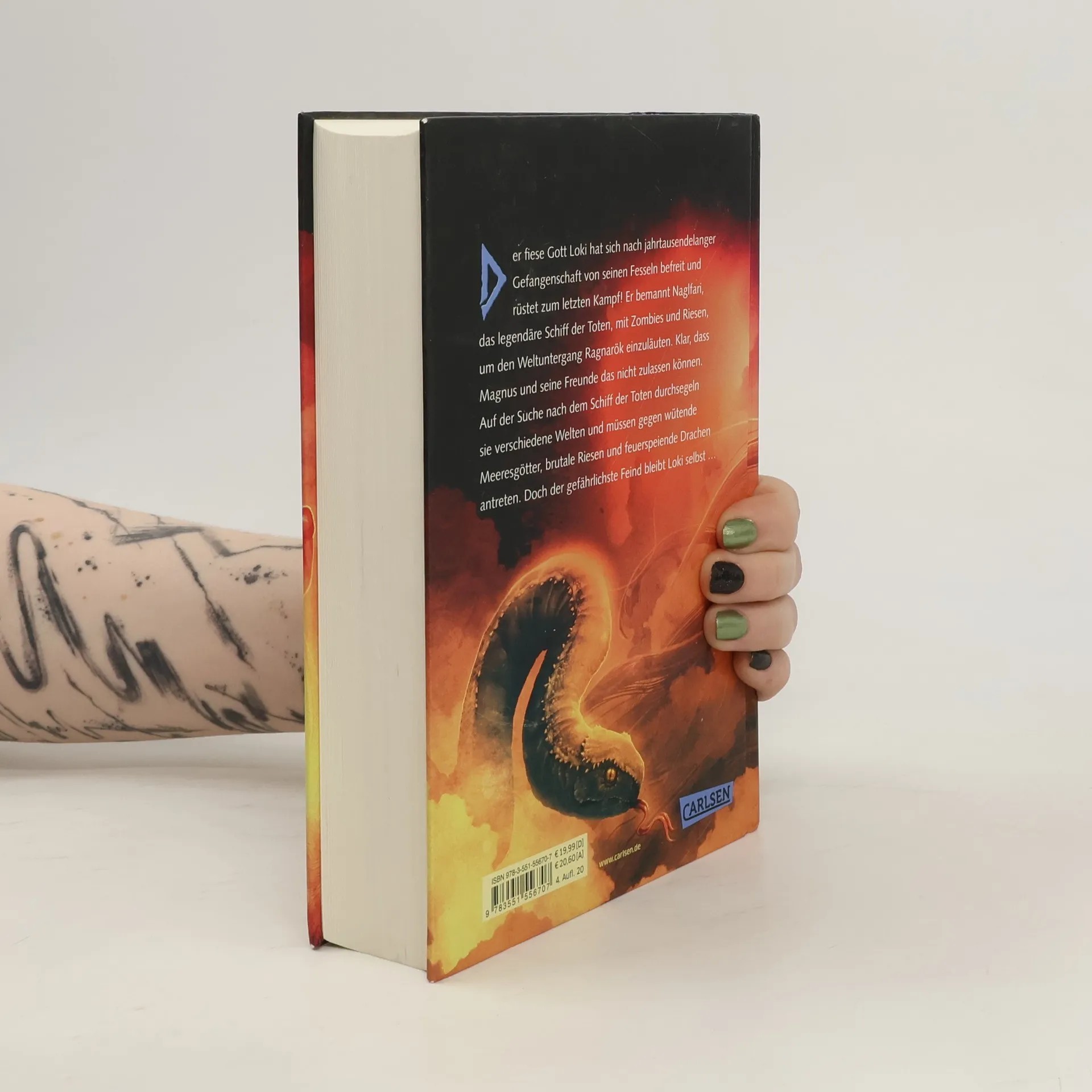 Monster, Mythen und Megakatastrophen – das packende Finale der Fantasy-Buchreihe Der fiese Gott Loki hat sich nach jahrtausendelanger Gefangenschaft von seinen Fesseln befreit und rüstet zum letzten Kampf! Er bemannt Naglfari, das legendäre Schiff der Toten, mit Zombies und Riesen, um den Weltuntergang Ragnarök einzuläuten und gegen die nordischen Götter zu segeln. Es liegt nun an Magnus Chase und seinen Freunden, Lokis Pläne zu vereiteln. Auf der Suche nach dem Schiff der Toten bereisen sie verschiedene Welten und müssen gegen wütende Meeresgötter, brutale Riesen und feuerspeiende Drachen antreten. Aber Magnus‘ größte Herausforderung besteht darin, sich seinen eigenen inneren Dämonen zu stellen. Aus dem Universum von „Percy Jackson“ und „Die Kane-Chroniken“: Magnus Chase Der 16-jährige Magnus Chase lebt seit dem mysteriösen Tod seiner Mutter auf der Straße. Mit Diebstählen hält er sich über Wasser – bis er eines Tages von seinem besonderen Erbe erfährt: Magnus ist der Sohn des nordischen Gottes Frey und soll die Welt vor dem Untergang retten. In der Fantasy-Trilogie überführt Rick Riordan alte Sagen und Legenden in moderne Geschichten und schafft es, Leser*innen überall auf der Welt für die nordische Mythologie zu begeistern. ***Feuerriesen, Walküren und nordische Götter - packende Fantasy für Leser*innen ab 12 Jahren und für alle Fans der nordischen Mythologie***